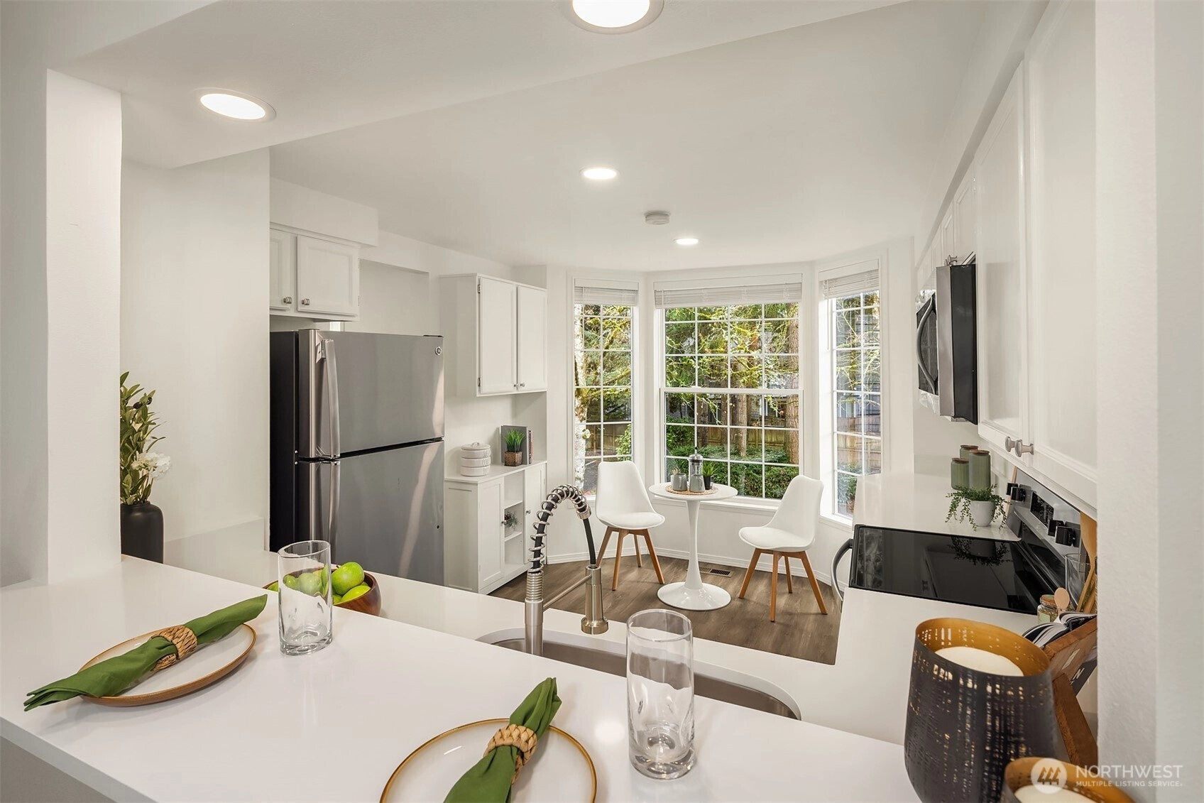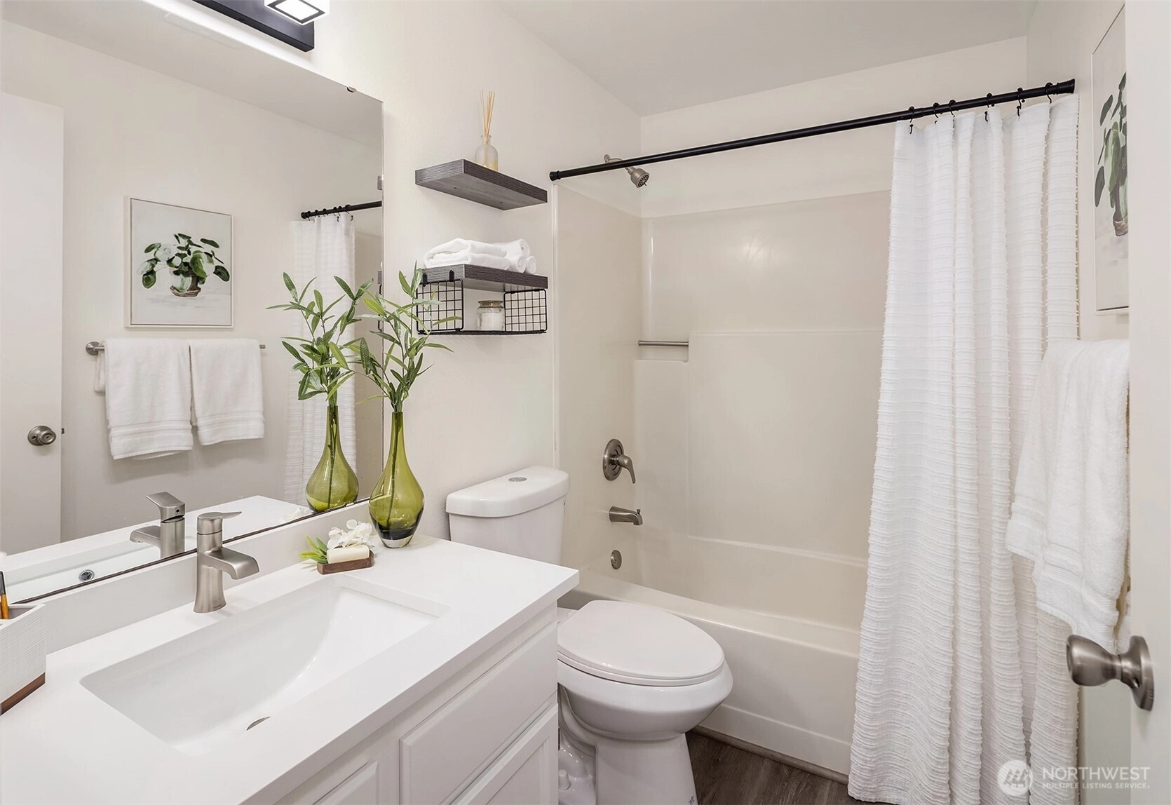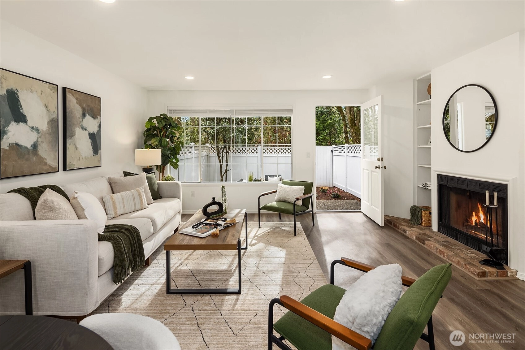 Extensively renovated townhome within the charming Springbrook Square community of Juanita. Inviting main level features a bright open layout. Spacious family room with wood burning fireplace opens to a private, fully fenced rear yard backing to a tranquil greenbelt setting. Updated kitchen features new stainless appliances, quartz countertops and a cozy breakfast nook. Convenient pass through to the dining room also offers additional bar top seating. Upper level with two generous ensuite bedrooms with ample closet space and modern baths. Thoughtful updates include new laminate flooring and interior paint throughout. Attached 2 car tandem garage with EV charging. Low HOA dues and no rental cap! Quiet, convenient location with easy access to the shops and amenities of Totem Lake and Juanita Village not to mention the waterfront recreation at Juanita Beach Park. Pre-inspected, turn-key condition! **Eligible for 1% down payment program!**