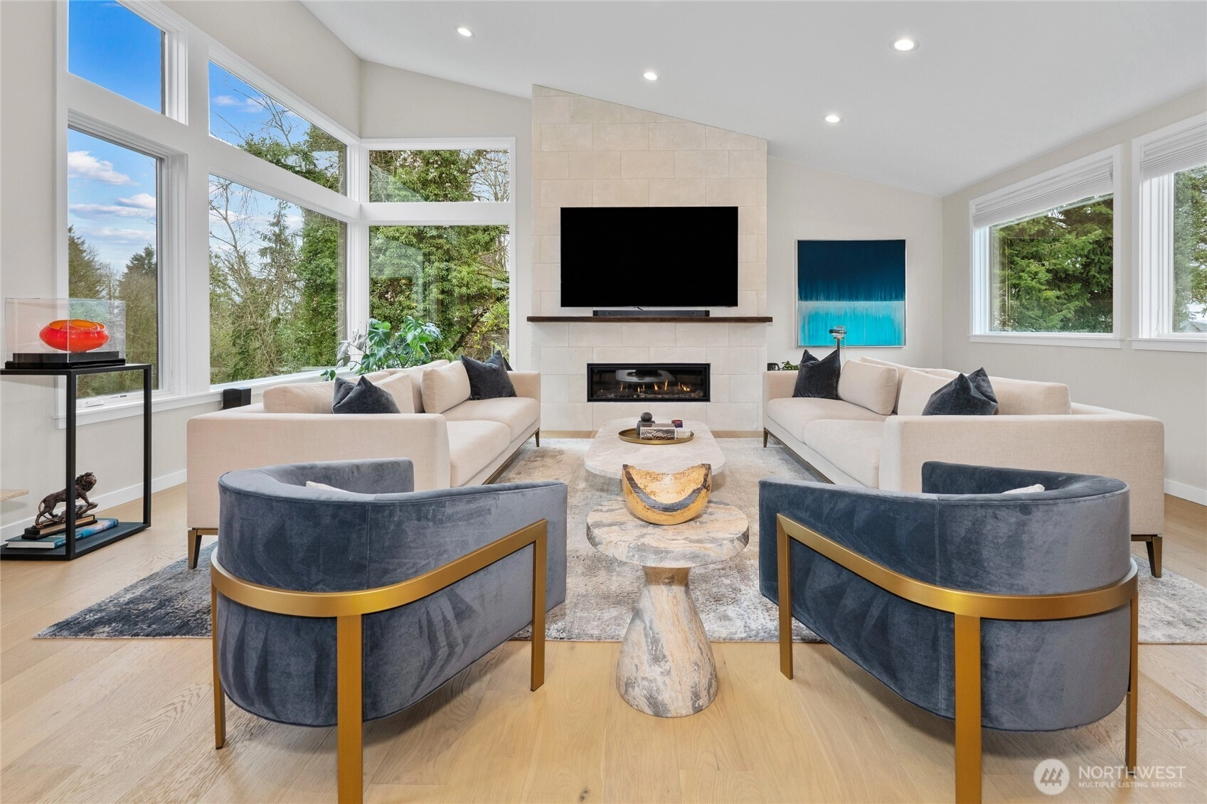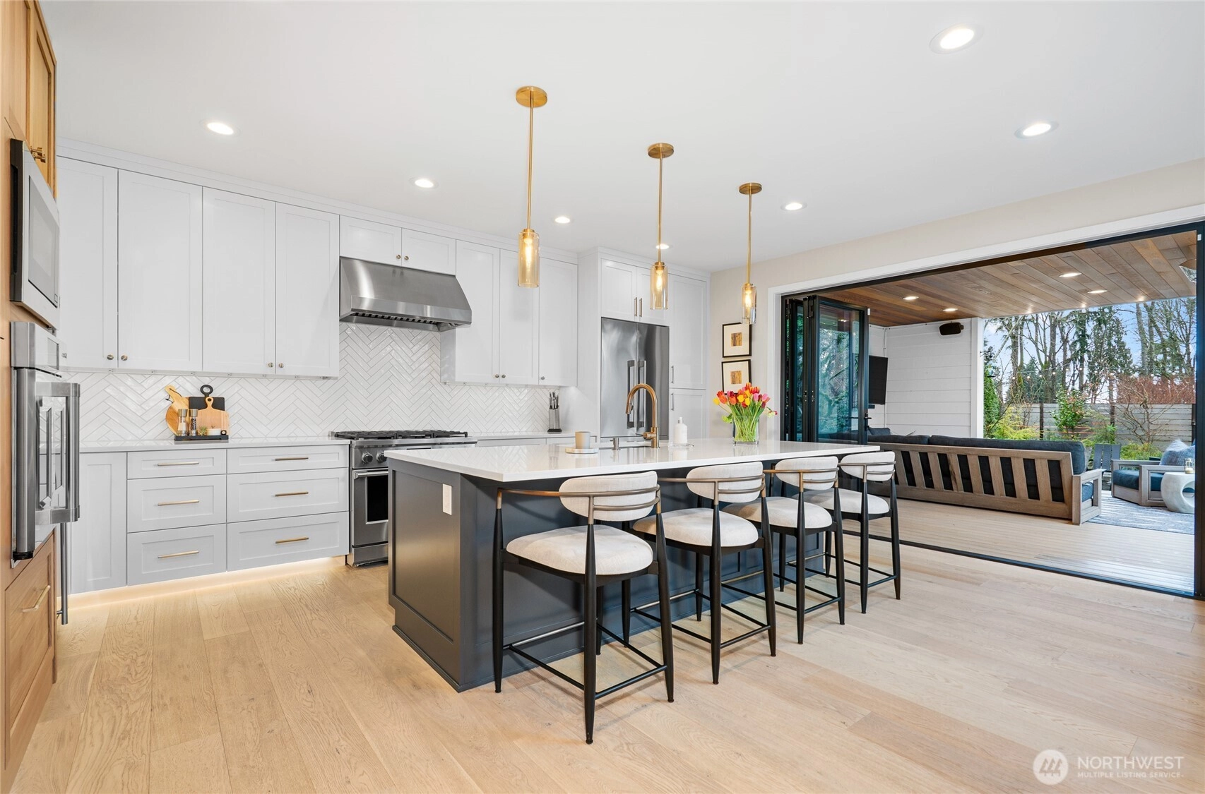 Private, sophisticated & modern, this 2021-built home is a masterclass in elevated living—with over $400K in enhancements that truly set it apart. Designed for maximum sunlight, the bright, open main floor centers on a grand great room w/ luxury gas fireplace & elegant dining room, flowing seamlessly thru two sets of folding NanaWall doors to resort-caliber outdoor space w/ an expansive deck & covered living room w/ TV & infrared heat, patio w/ gas fireplace & a pass-through accordion bar—all overlooking a serene backdrop. The gourmet kitchen anchors it all, featuring a 6-burner gas range, double ovens, generous island seating, built-in bar w/ wine storage, & hidden outlets & convenient main floor bedroom/office & powder room. Upstairs, the primary suite is a pure retreat—spa bath w/ heated marble floors, soaking tub, glass rain shower w/ heated bench & WC w/ bidet, plus a custom walk-in closet. Three additional spacious bedrooms, a luxury bath w/ heated floors, & a laundry room complete the upper level. The lower level offers a media room w/ sound-absorbing feature wall & a mudroom off the 2-car garage fitted w/ epoxy floors, hot water, built-ins & LED lighting. Outdoors, 300+ native plants, landscape lighting, irrigation, dog run & fencing create a true sanctuary. Solar, Central AC, tankless H2O heater, Lutron lighting & Cat-5 wiring complete this exceptional home. All in coveted View Ridge, fronting the SPCC fairway, near top-rated schools, parks, eats. Simply special.