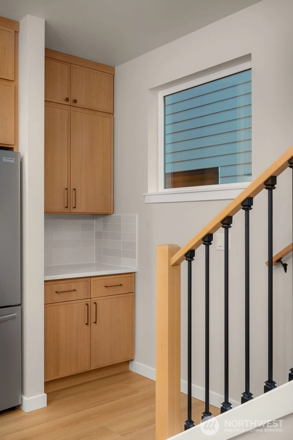 Beautiful modern new construction by Blue Ridge Homes, offering 2 bedrooms and 2.25 baths in a bright, thoughtfully designed layout that blends contemporary style with everyday functionality. Clean architectural lines, abundant natural light, and seamless flow create an inviting atmosphere throughout. The main level is anchored by a sleek chef’s kitchen featuring quartz countertops, stainless steel appliances, modern cabinetry, and an expansive island, perfect for gathering or casual dining. The kitchen flows effortlessly into the spacious living and dining areas, while sliding glass doors extend the space to a private patio, ideal for summer evenings or morning coffee. Upstairs, the serene primary suite offers a generous walk-in closet and spa-inspired ¾ bath with designer finishes. The second bedroom is well-sized and versatile, perfect for guests or a home office, adjacent to a full bath. Upper-level laundry and a designated EV-ready parking space add everyday convenience. Ideally located near Downtown Kirkland, waterfront parks along Lake Washington, top-rated Lake Washington schools, tech campuses, shopping, dining, and major commuter routes.