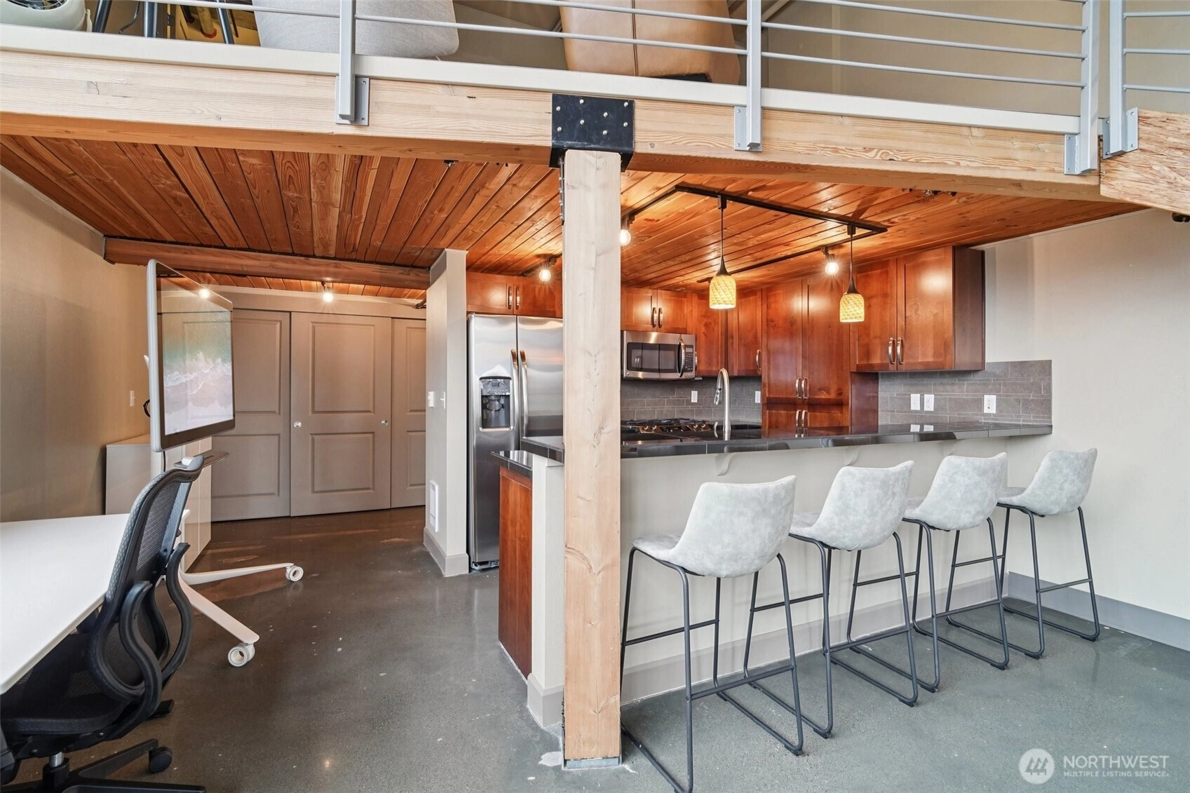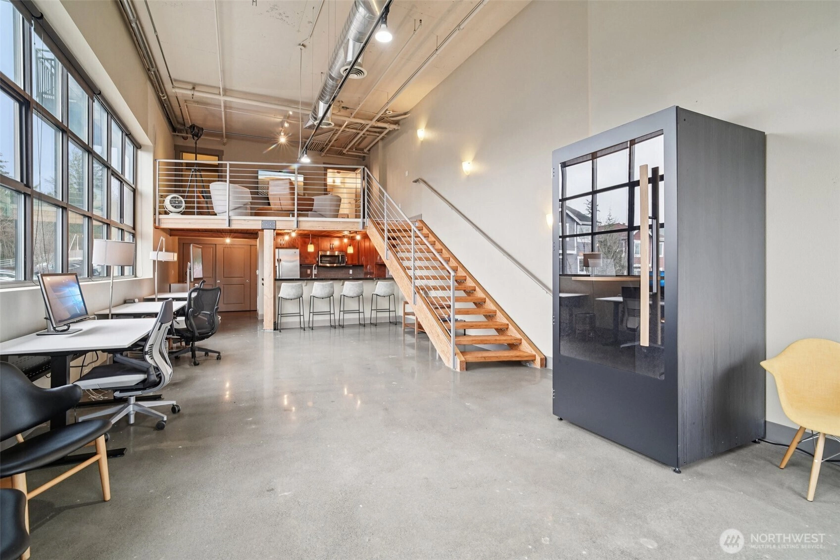 Rare opportunity to own a commercially zoned live/work condo in the highly sought-after Starpoint community in the heart of Issaquah Highlands, offering valuable high-traffic, street-front exposure. This prime ground-floor end unit features a formal storefront entry, ADA-accessible bathroom, soaring ceilings, and walls of windows with solar shades that flood the space with natural light, creating a striking modern urban aesthetic with polished concrete floors and track lighting. The flexible layout allows for a wide range of uses including office, medical/dental, daycare, salon, massage clinic, coffee shop, and more. A beautiful kitchen with granite countertops and stainless steel appliances, washer/dryer hookup, and main area stubbed for additional plumbing enhance functionality. Upstairs offers a loft/bedroom with full bath and walk-in closet for added versatility. Equipped with HVAC and includes two dedicated parking spaces (one secured underground/garage). Just minutes to parks, trails, excellent restaurants, theater, and great shopping!