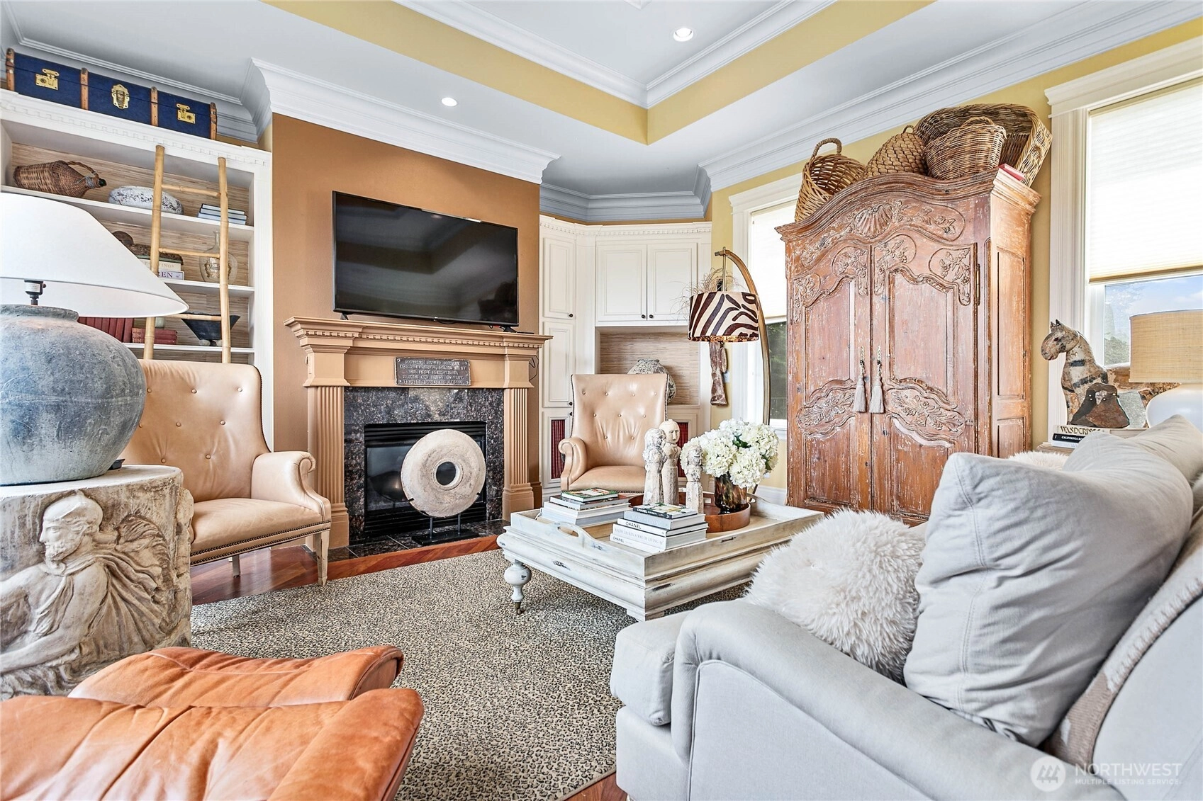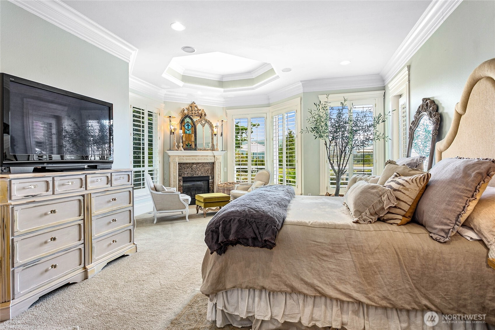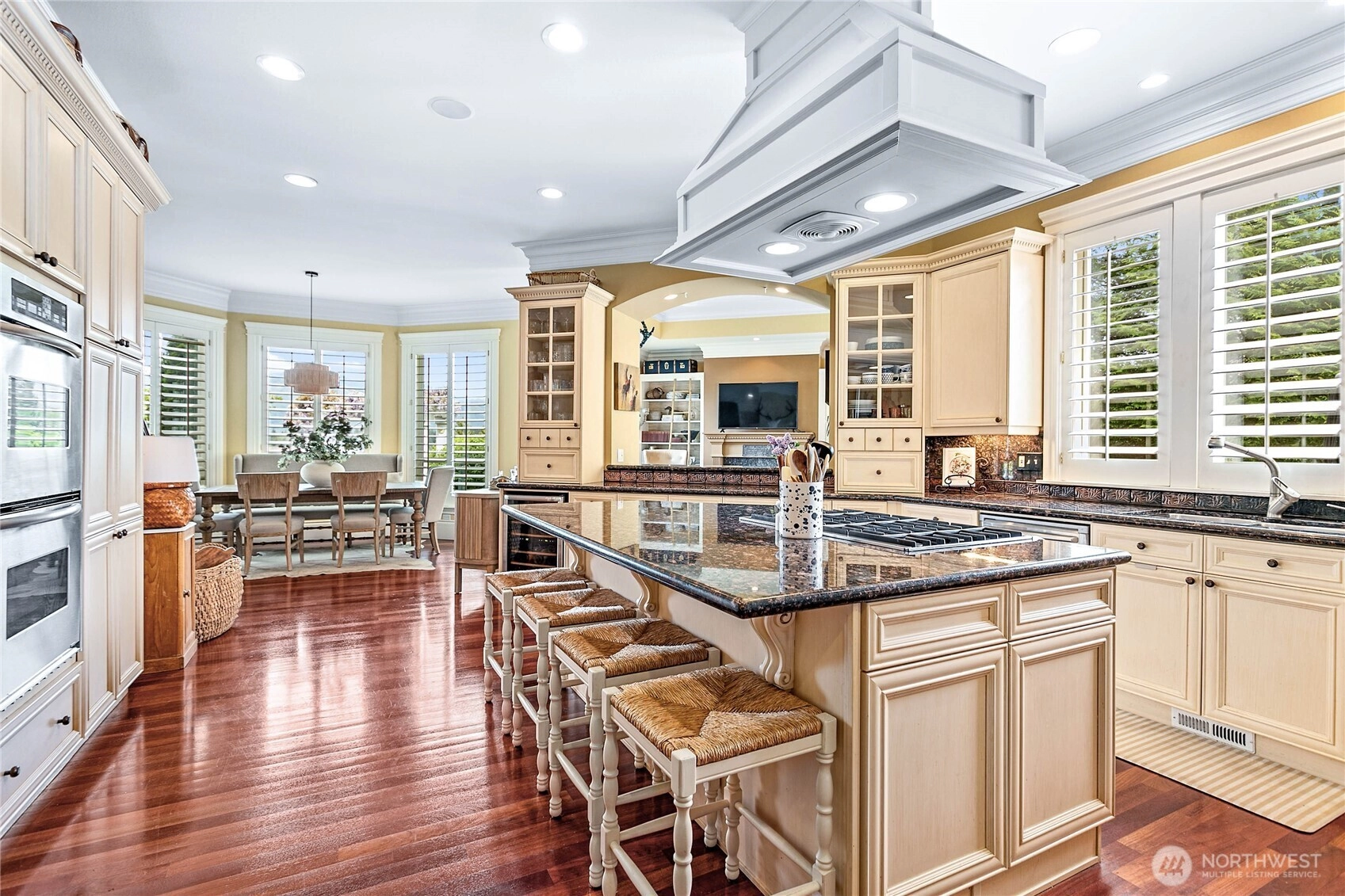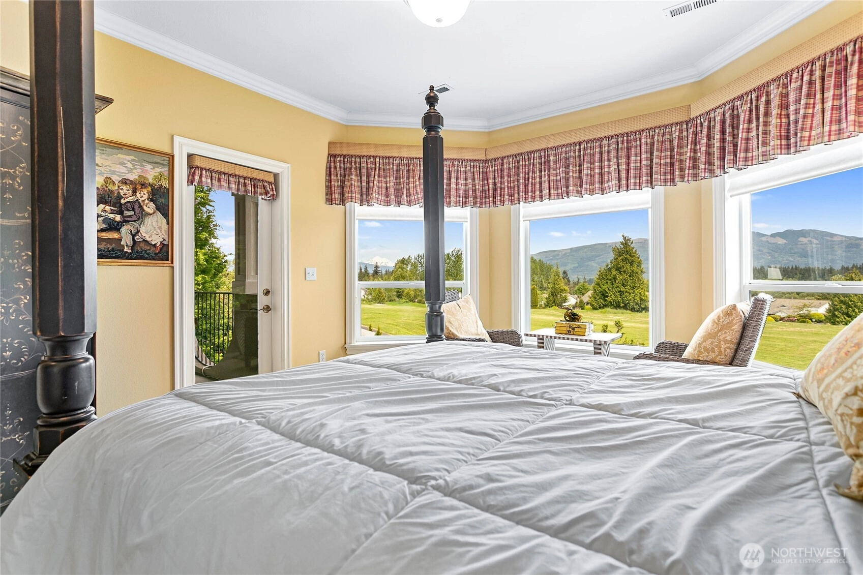 This elegant custom home with Mt Baker views awaits you in Eaglemont. 4,729 sqft of exceptional craftsmanship creates special spaces, large gathering areas & captivating architectural details - all while preserving true single-floor living. The main floor stuns with a luxurious primary suite, walk-in closet & sitting area overlooking the garden. Brazilian Cherry hardwood flows from the grand entry through a chef’s kitchen into a quiet sitting area. Up the sweeping staircase, a guest suite with full bath and a sitting area with veranda. Numerous extras: built-ins throughout, back staircase, a dreamy patio, fireplaces, landscaping & more. A true jewel in Eaglemont.
