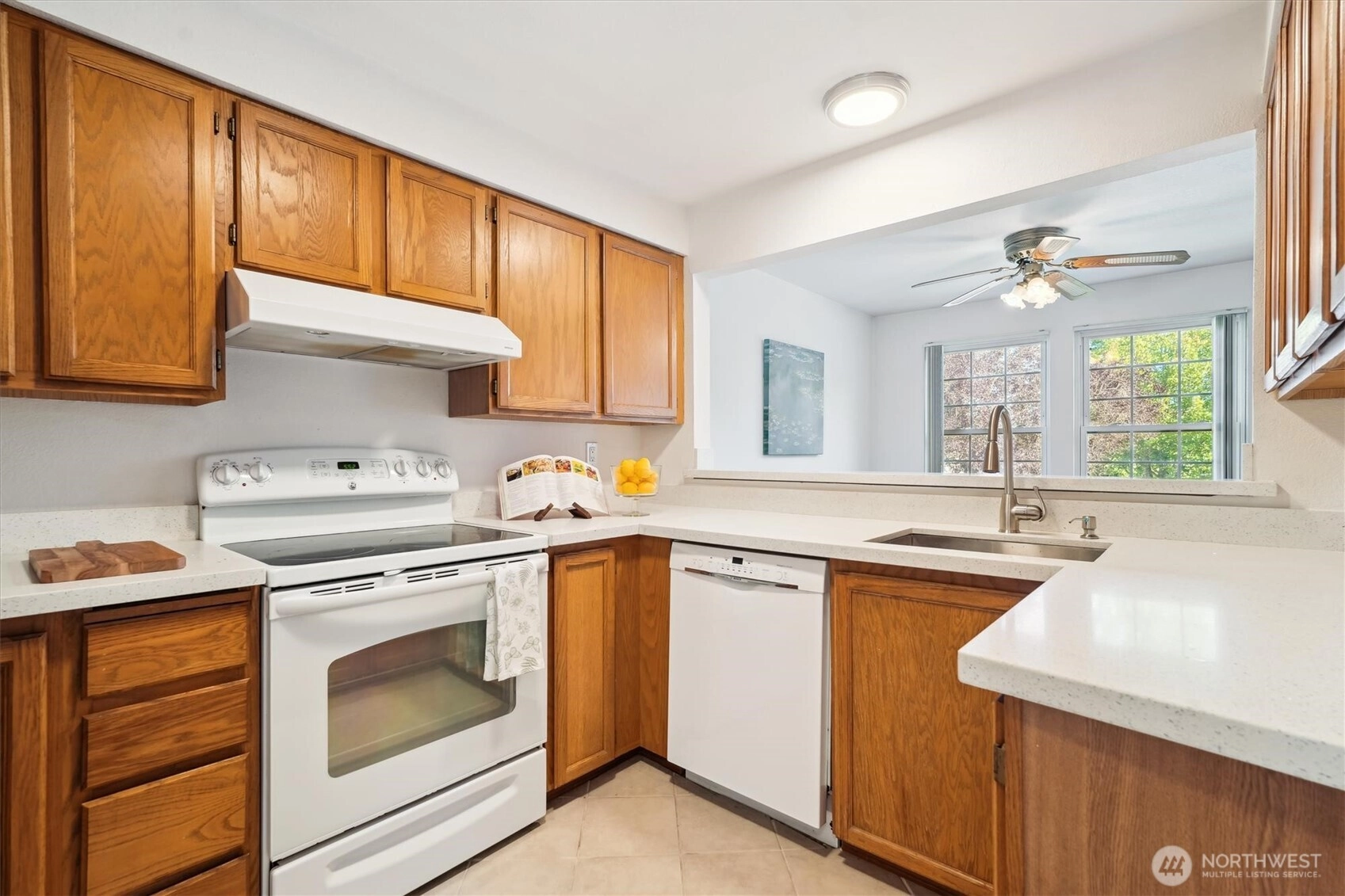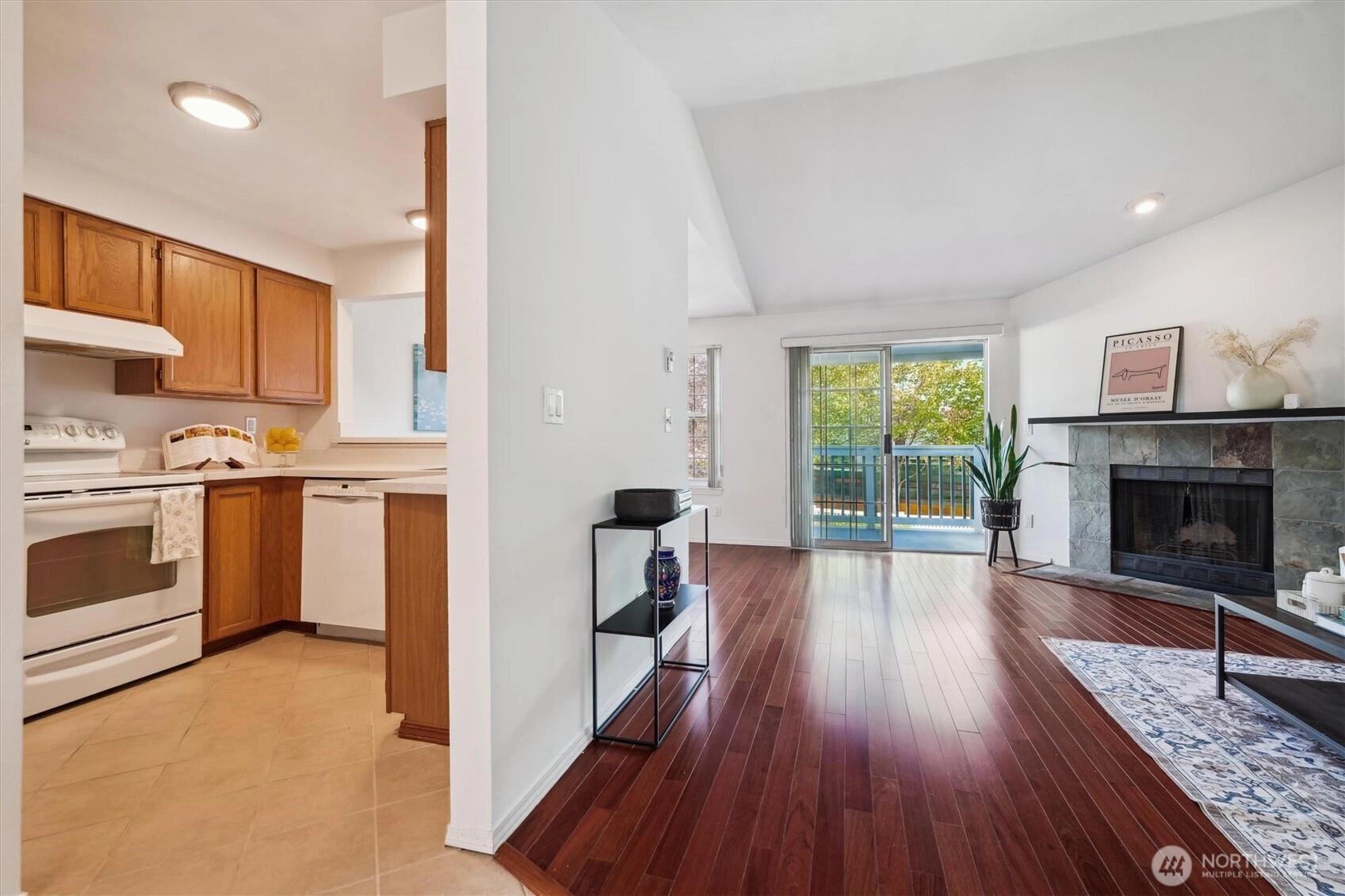 Experience the perfect blend of comfort and convenience in this hard-to-find, one-level condo with 2 beds, 2 baths, and 1,024 sq ft—just steps away from the lake. This bright, inviting home features vaulted ceilings, engineered hardwood and tile flooring, quartz countertops, a farmhouse-style sink, and fresh paint inside and out. Cozy up by the fireplace or relax on your private balcony with outdoor storage. Includes a detached garage plus two uncovered parking spaces. Close to Riverbend Golf Complex, parks, Kent Station, I-5, and SR-167.