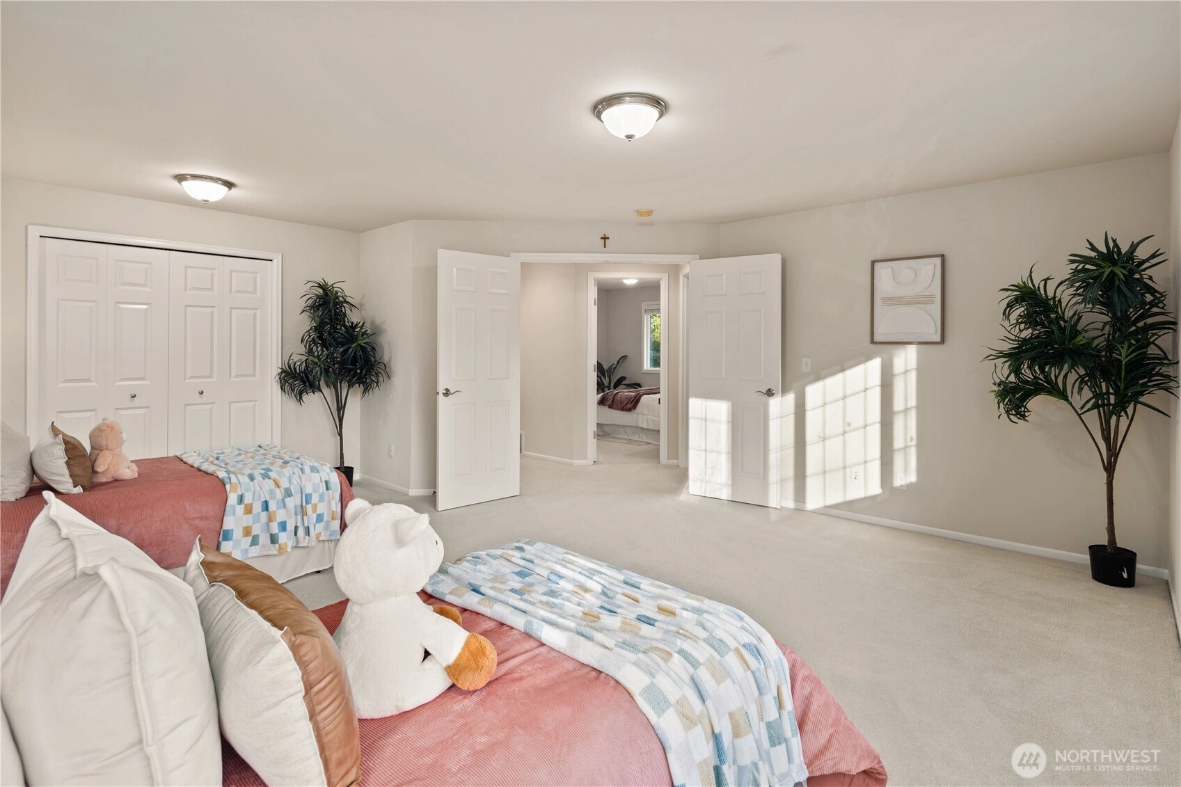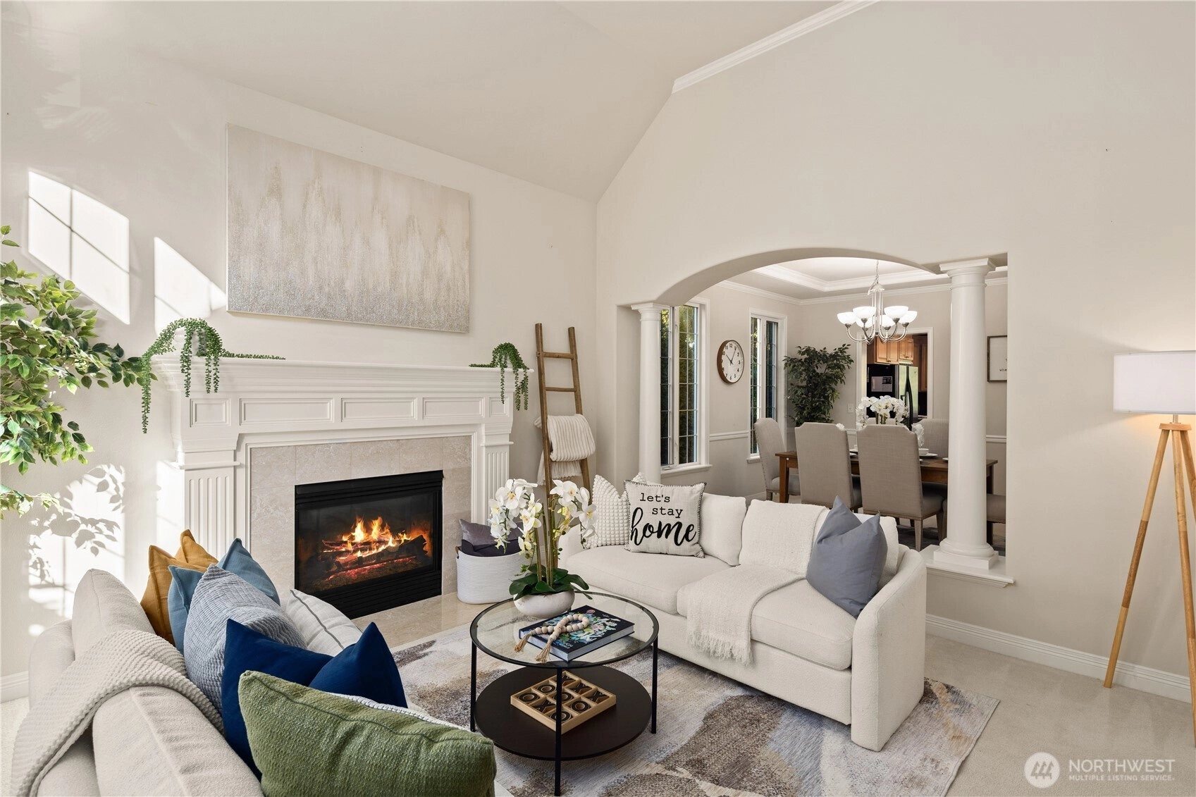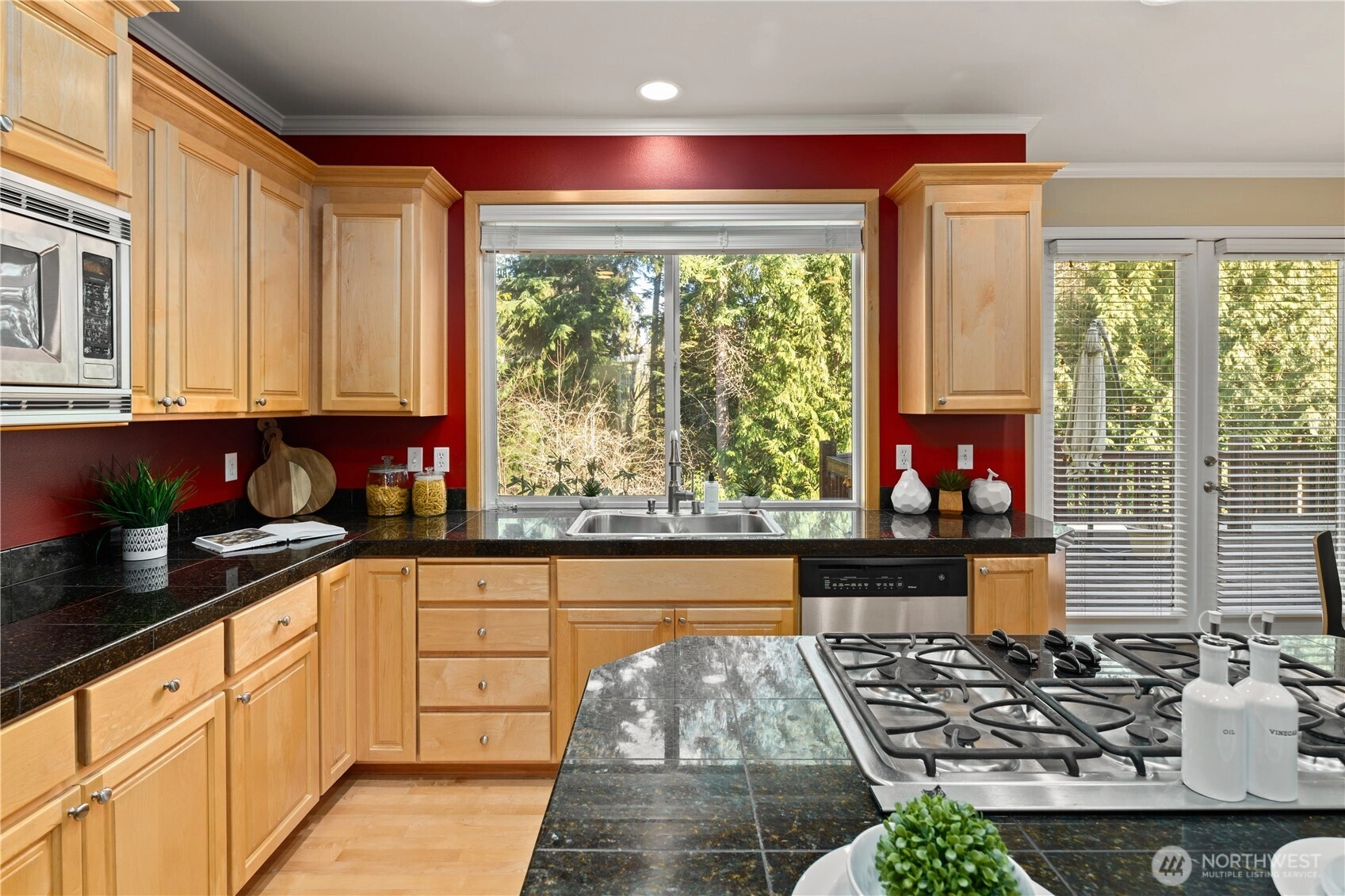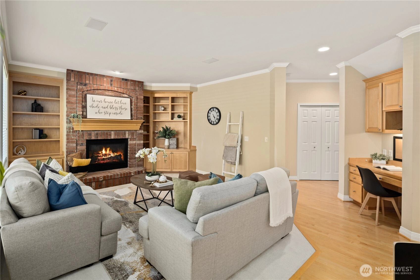 Beautiful Buchan resale backing to protected greenbelt and wetlands on a quiet street in River Crossing. This 3,084 sq ft home sits on an 8,276 sq ft lot and offers a functional, well-designed layout in one of Mill Creek’s most walkable neighborhoods. The home features a vaulted entry and living room with fireplace, formal dining room, and a spacious kitchen that opens to the family room with a second fireplace. French doors lead to a large deck overlooking the private backyard and greenbelt setting. A desirable main-level bedroom with adjacent 3/4 bath offers flexibility for guests, home office, or multi-generational living. Upstairs includes a generous primary suite with serene wetland views and a 5-piece bath, plus a large bonus room with closets and an additional storage room over the 3-car garage. Located just a short walk to Mill Creek Town Center with convenient access to dining, shopping, parks, and North Creek Trail, this well-maintained home offers a prime River Crossing location.