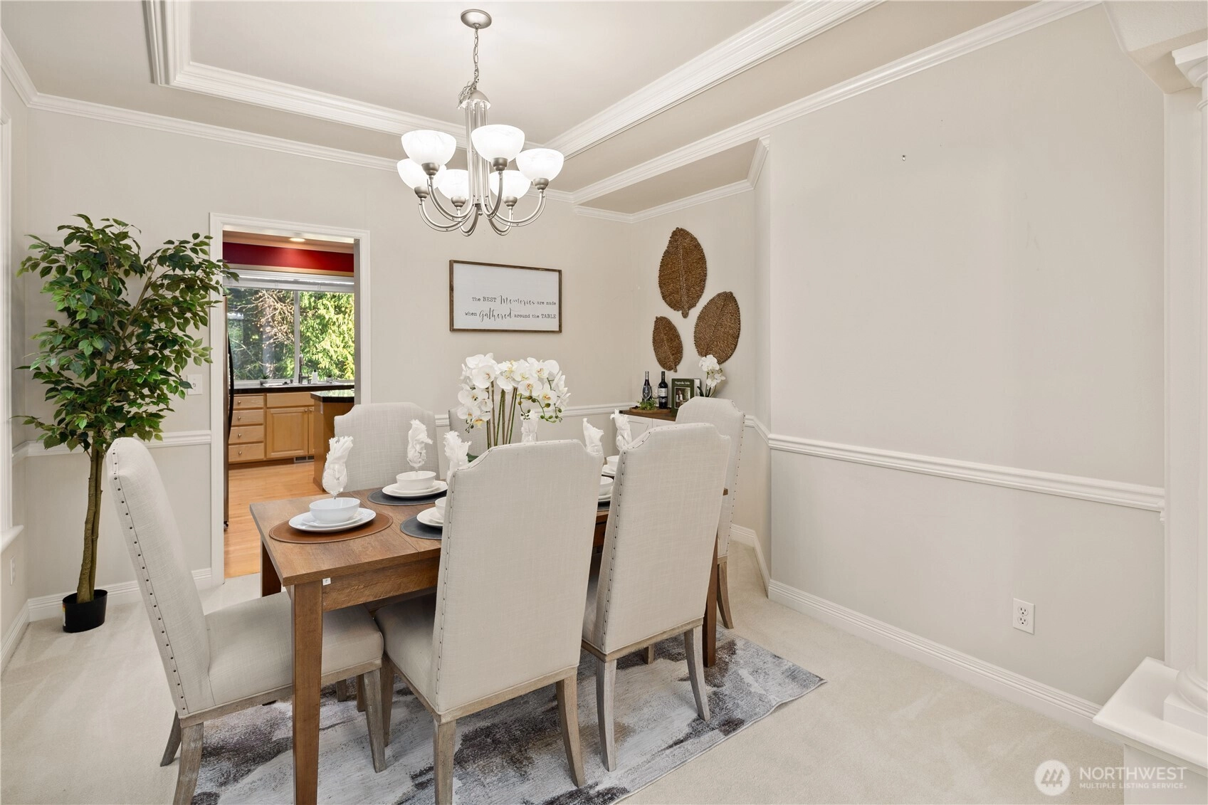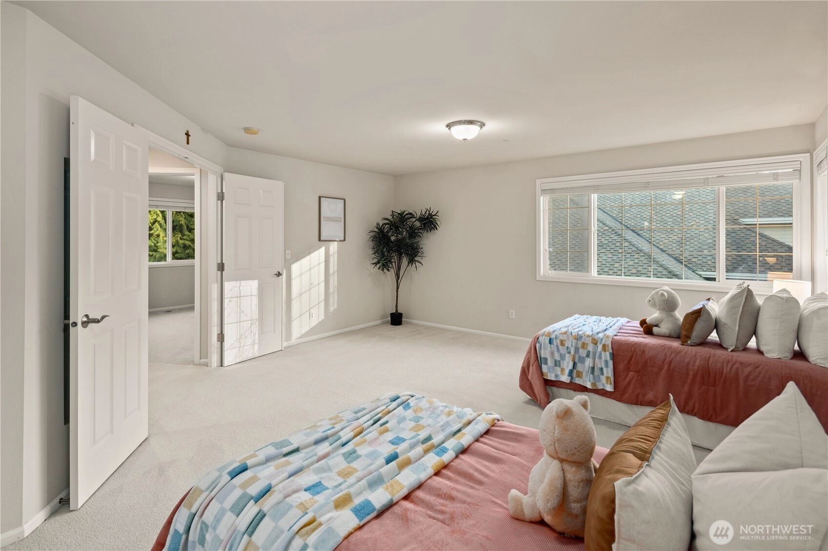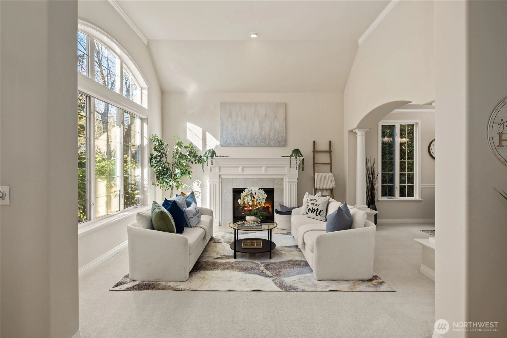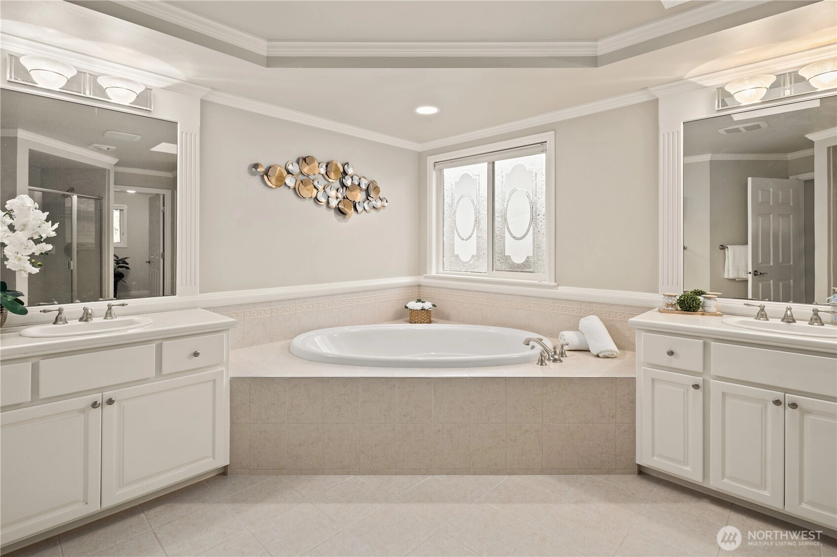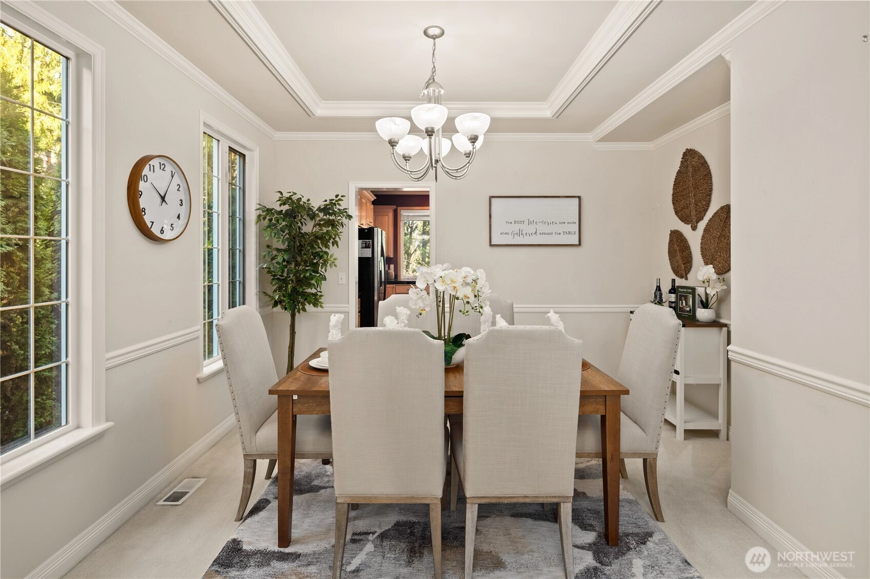 Beautiful Buchan resale backing to protected greenbelt and wetlands on a quiet street in River Crossing. This 3,084 sq ft home sits on an 8,276 sq ft lot and offers a functional, well-designed layout in one of Mill Creek’s most walkable neighborhoods. The home features a vaulted entry and living room with fireplace, formal dining room, and a spacious kitchen that opens to the family room with a second fireplace. French doors lead to a large deck overlooking the private backyard and greenbelt setting. A desirable main-level bedroom with adjacent 3/4 bath offers flexibility for guests, home office, or multi-generational living. Upstairs includes a generous primary suite with serene wetland views and a 5-piece bath, plus a large bonus room with closets and an additional storage room over the 3-car garage. Located just a short walk to Mill Creek Town Center with convenient access to dining, shopping, parks, and North Creek Trail, this well-maintained home offers a prime River Crossing location.