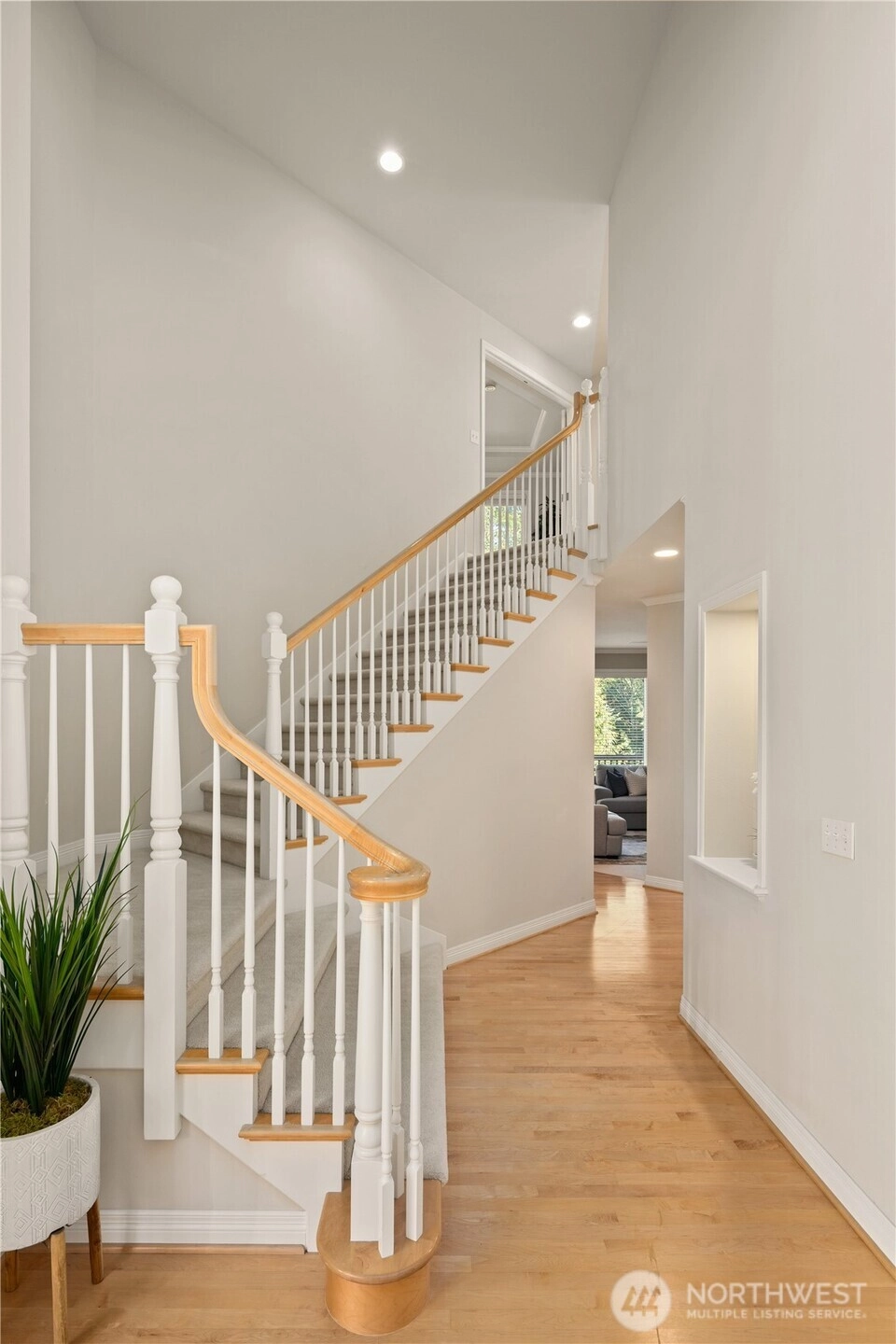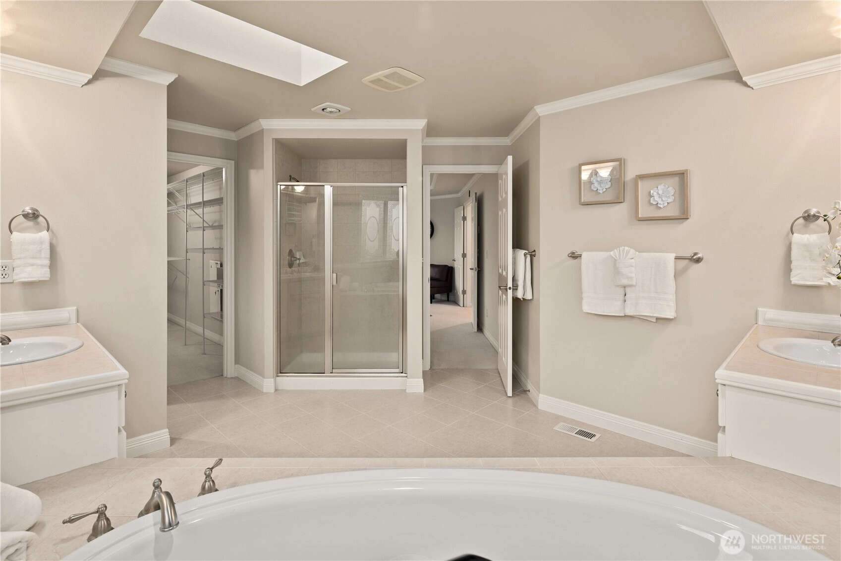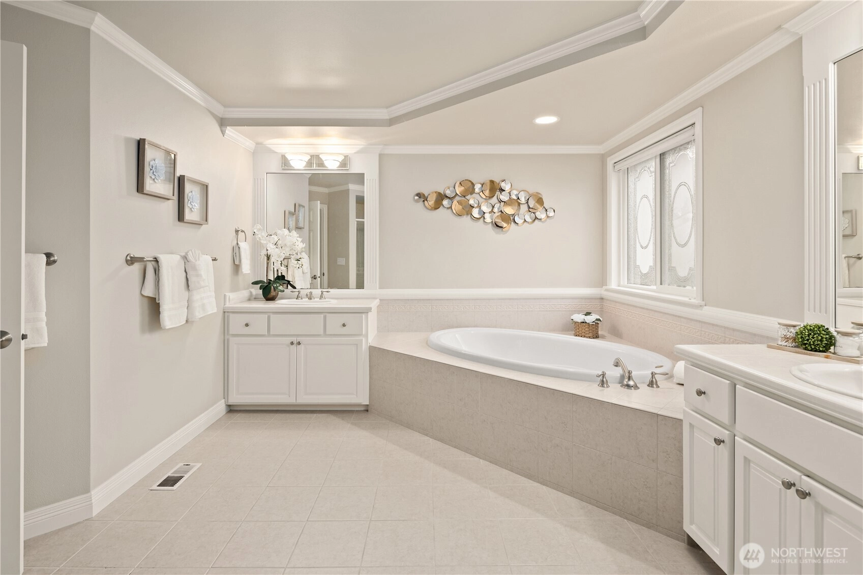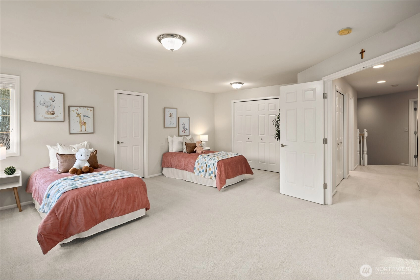 Beautiful Buchan resale backing to protected greenbelt and wetlands on a quiet street in River Crossing. This 3,084 sq ft home sits on an 8,276 sq ft lot and offers a functional, well-designed layout in one of Mill Creek’s most walkable neighborhoods. The home features a vaulted entry and living room with fireplace, formal dining room, and a spacious kitchen that opens to the family room with a second fireplace. French doors lead to a large deck overlooking the private backyard and greenbelt setting. A desirable main-level bedroom with adjacent 3/4 bath offers flexibility for guests, home office, or multi-generational living. Upstairs includes a generous primary suite with serene wetland views and a 5-piece bath, plus a large bonus room with closets and an additional storage room over the 3-car garage. Located just a short walk to Mill Creek Town Center with convenient access to dining, shopping, parks, and North Creek Trail, this well-maintained home offers a prime River Crossing location.