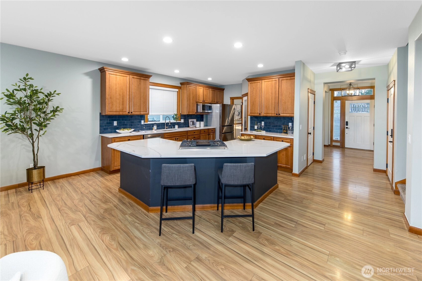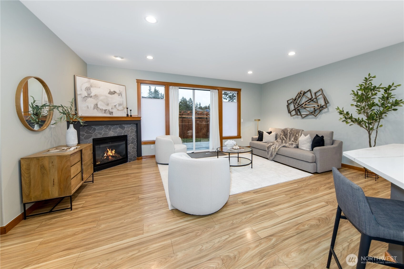 Originally a model home in the coveted Meadows at Rock Creek, this spacious 3,065 sq ft home offers 4 bedrooms, 2.75 baths, a main-floor office, and a huge bonus room with space for everyone. The open floor plan is ideal for entertaining, featuring an oversized kitchen that flows seamlessly into the great room. The kitchen has been beautifully updated with new quartz countertops and backsplash, all new stainless steel appliances, soft-close cabinetry, and updated black hardware for a fresh modern look. Fresh interior paint and new A/C make this home truly move-in ready. Upstairs you’ll find generously sized bedrooms and a large bonus room perfect for a media room, playroom, home gym, or additional flex space. The spacious primary suite is a true retreat, complete with its own fireplace, a 5-piece bath with dual vanities, soaking tub, and a large walk-in closet. Outdoor living shines with a remodeled patio and side yard with pavers, a new backyard fence with arbor, and room to entertain or relax. The home backs to a small park and is located close to 4 Corners amenities, great walking neighborhoods, and award-winning Tahoma High School district.