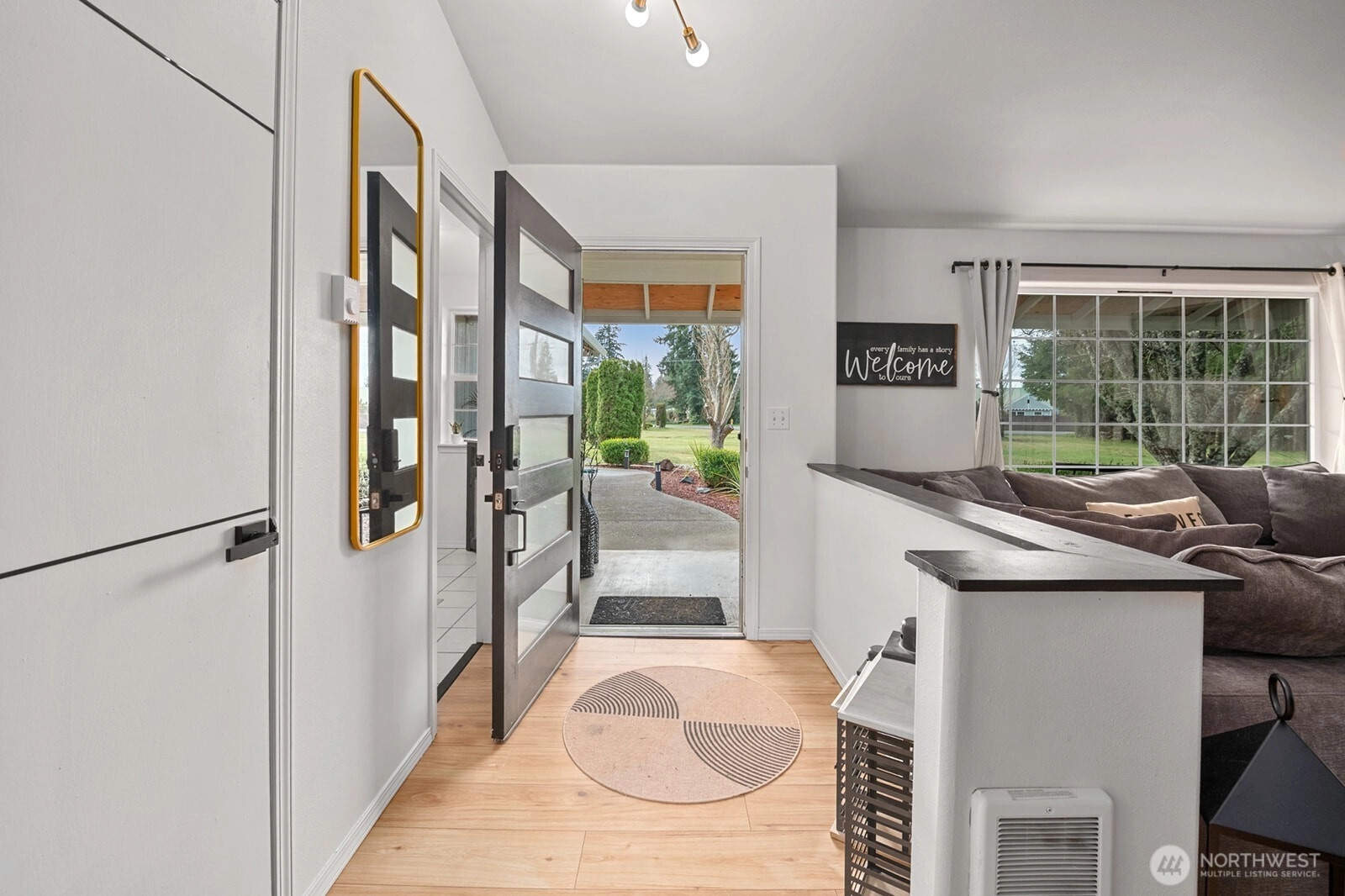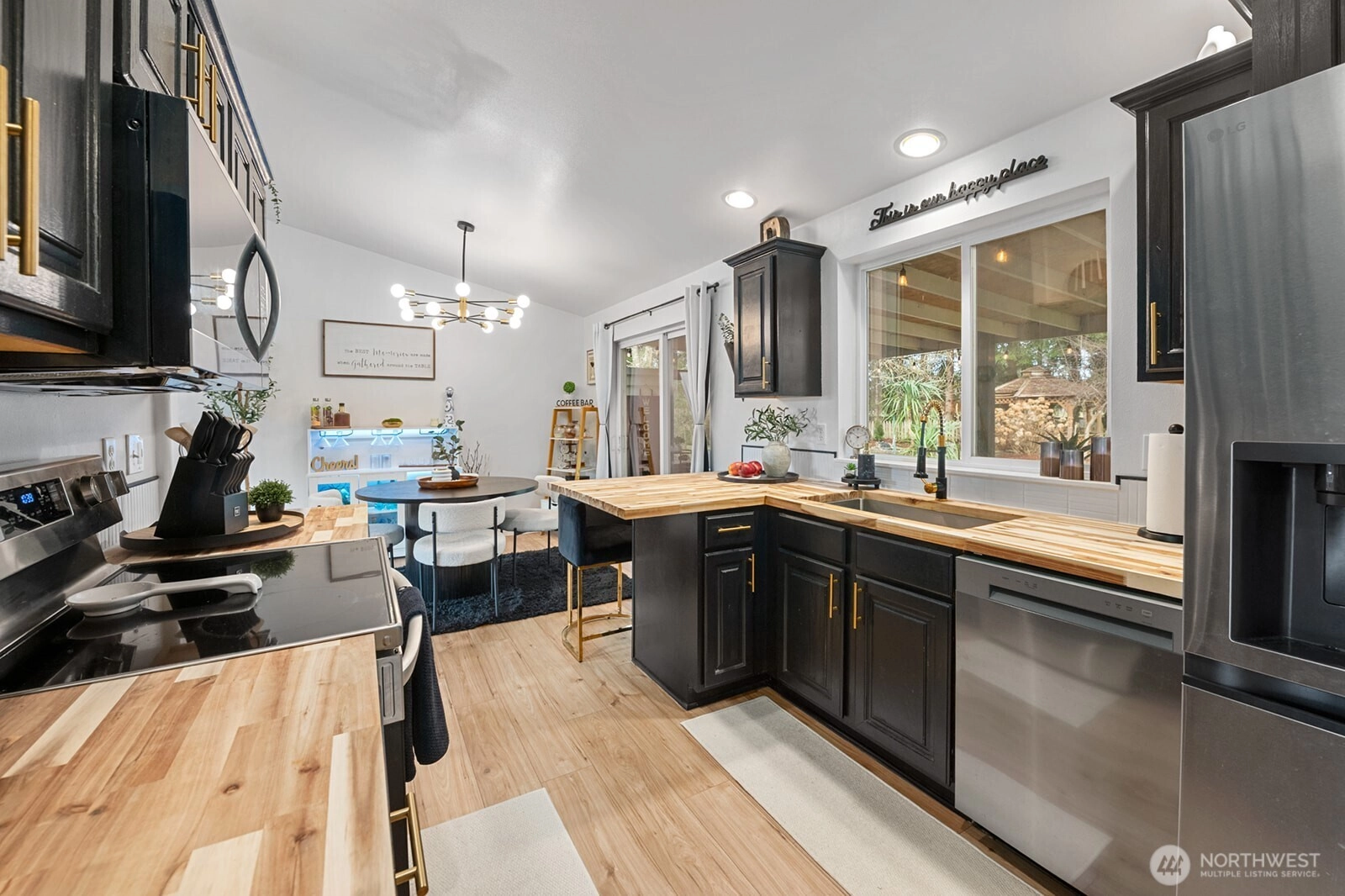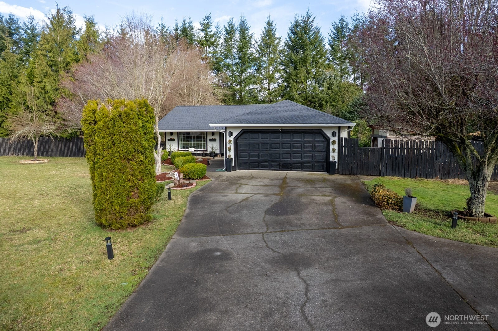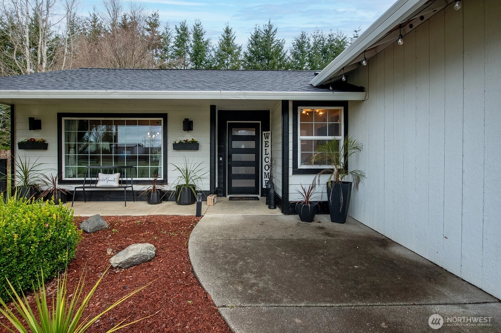 Pulling into this captivating fully remodeled home, you’re welcomed by a wraparound driveway lined with lush trees and plenty of parking for large gatherings. Situated on over an acre of flat, usable land, there’s room to create your own small farm, with established blueberry bushes and mature apple and pear trees ready for summer picking. A brand-new roof (April 2025, with warranty) and a charming covered front porch set the tone.Step inside to vaulted ceilings, all-new flooring, modern fixtures, and thoughtful finishes throughout. The spacious living room flows seamlessly into a dreamy kitchen featuring stainless steel appliances, butcher block countertops, stylish backsplash, and bar seating that opens to the dining area—perfect for entertaining.Down the hall are three generously sized bedrooms, a beautifully remodeled main bath with tiled surround, and a stunning primary suite complete with a walk-in closet and fully updated private bath showcasing double vanities and a tiled shower with waterfall feature.The laundry room offers abundant storage just off the garage. Outside, enjoy year-round gatherings on the expansive covered back patio with outdoor TV and windbreak wall. The fully fenced backyard feels private and serene, complete with a pond, fire pit, gazebo, workshop outbuilding, and lush landscaping. Country living with space, style, and convenience, just minutes from town.