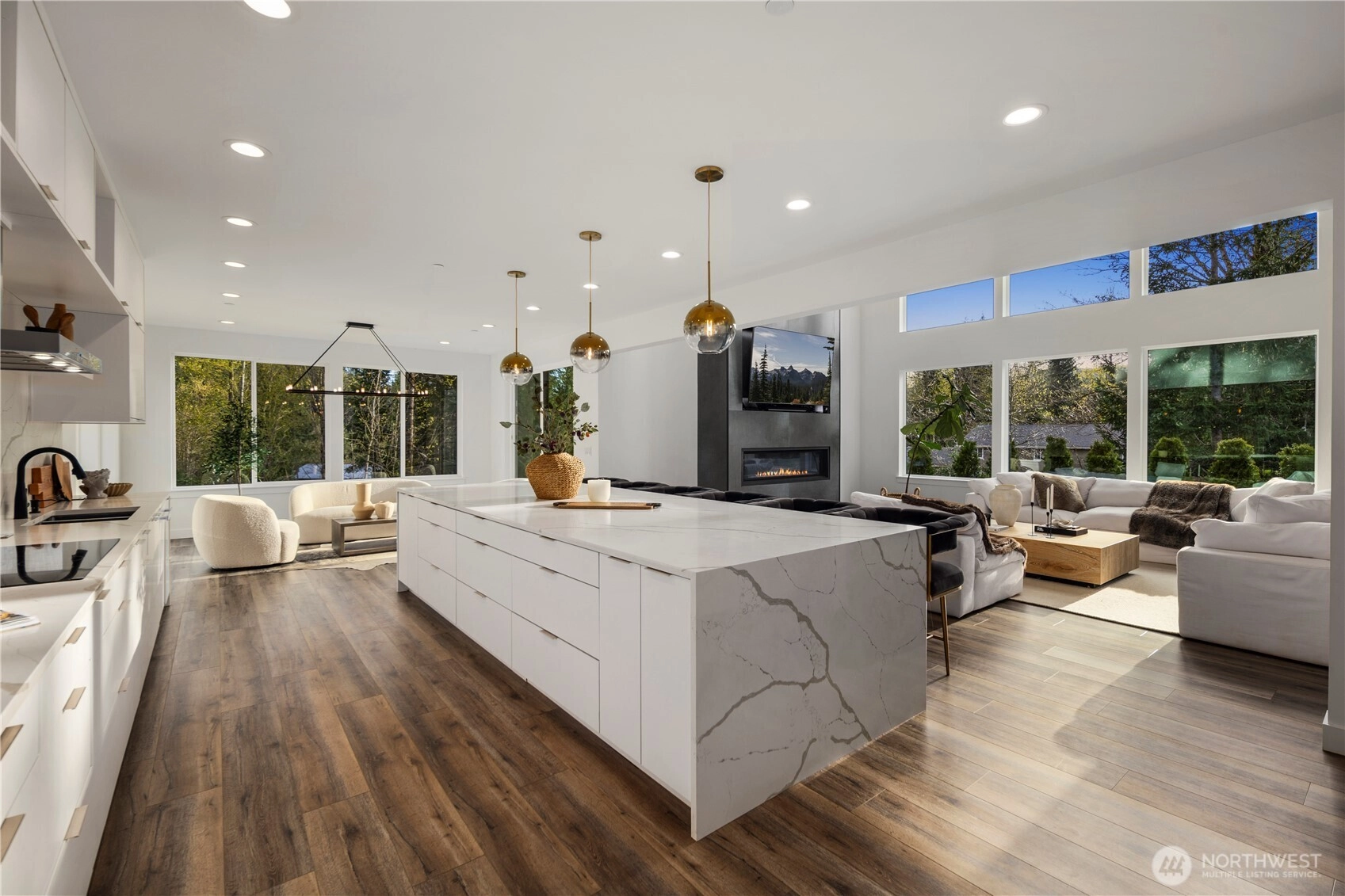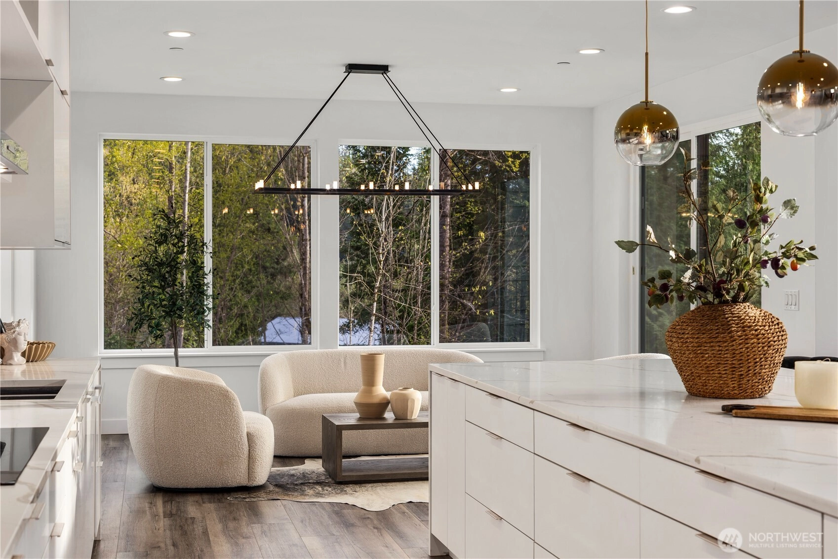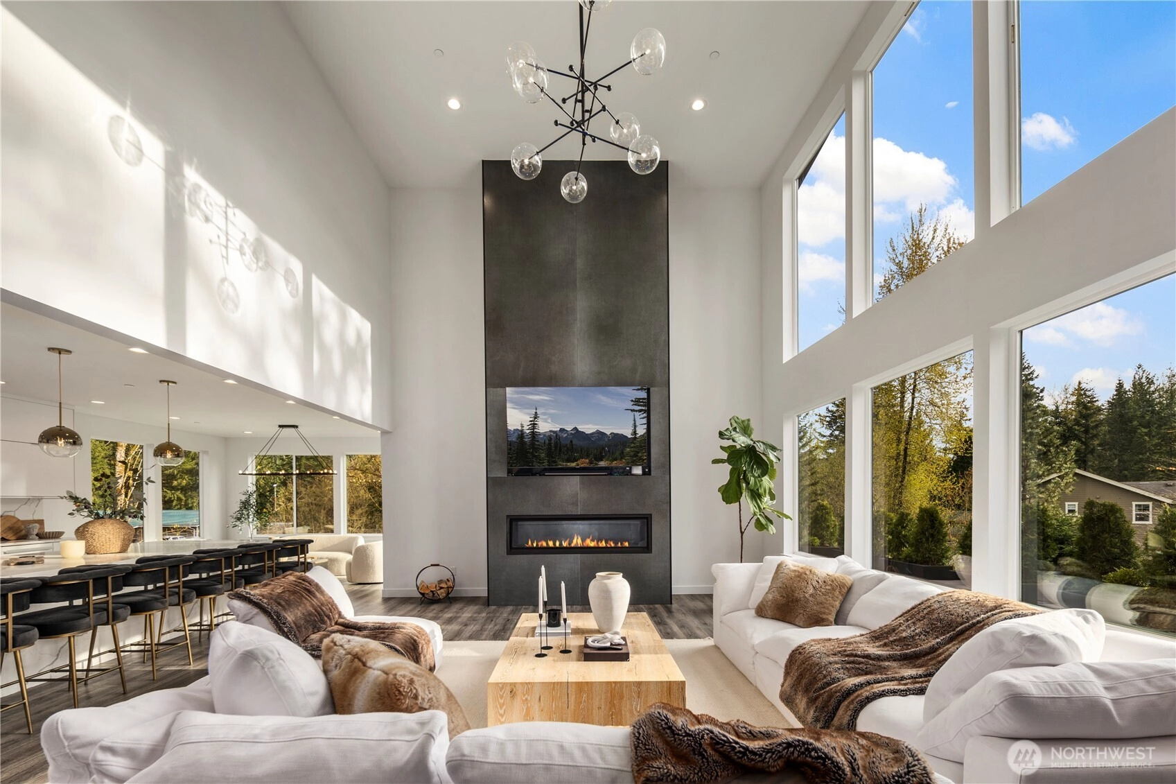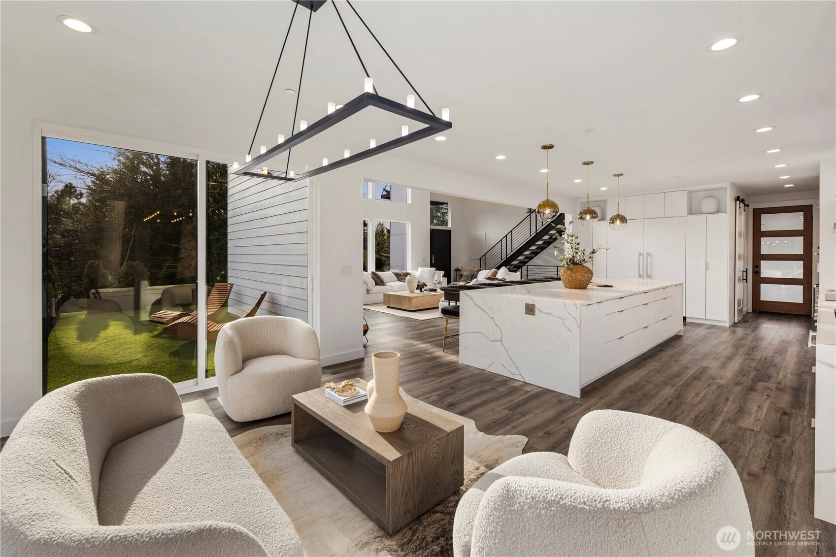An extraordinary fusion of modern luxury and natural beauty, this 4,300 sqft Snoqualmie estate is a true sanctuary. Privately nestled on nearly an acre the home showcases soaring ceilings, a striking floating staircase, and exquisite designer finishes throughout. The custom European-inspired kitchen features sleek white cabinetry, state-of-the-art Miele appliances, and a dramatic 14’ waterfall island. Indulge in the spa-like primary suite with a double shower, soaking tub, and expansive walk-in closet. A main-level office, generous lower-level living space with separate entrance, and outdoor terraces, create a lifestyle of comfort and distinction. Effortless access to I-90, Bellevue, and award-winning schools. Timeless elegance, redefined.