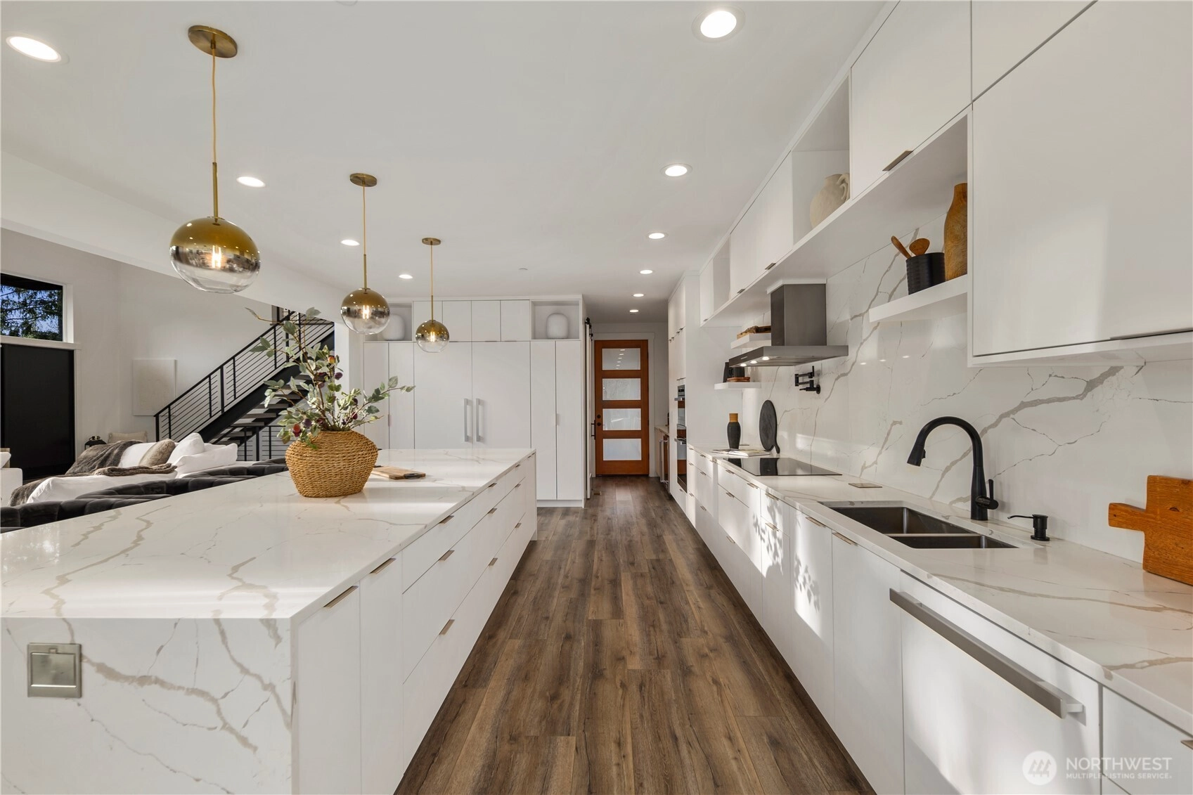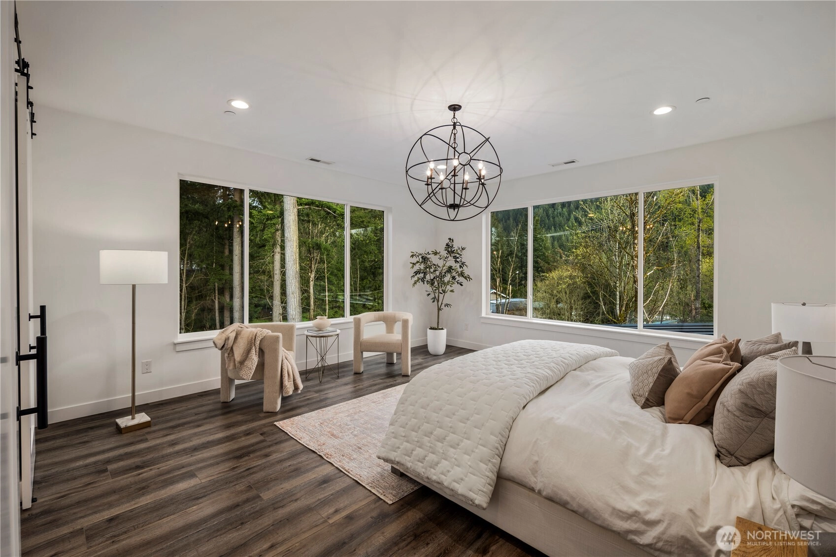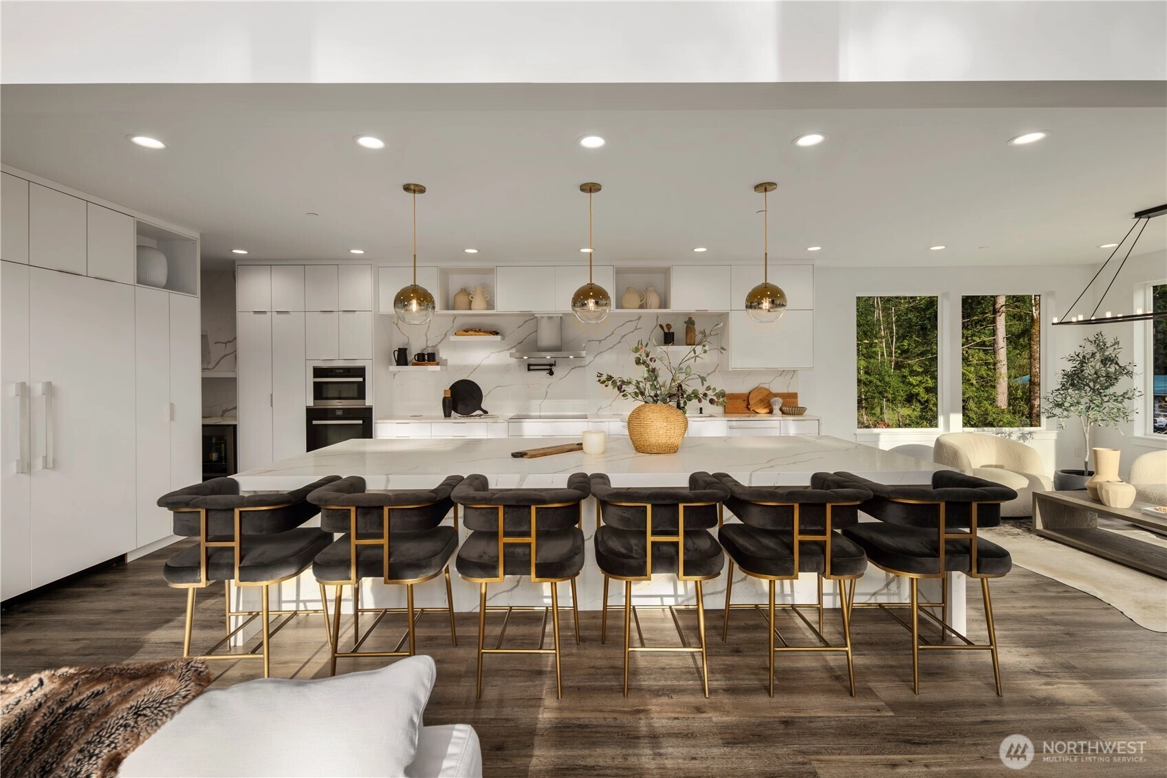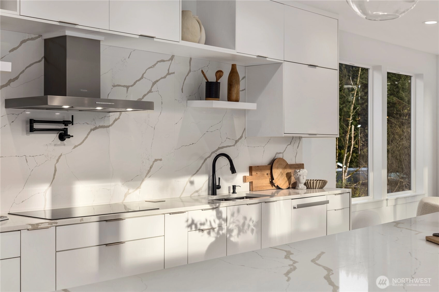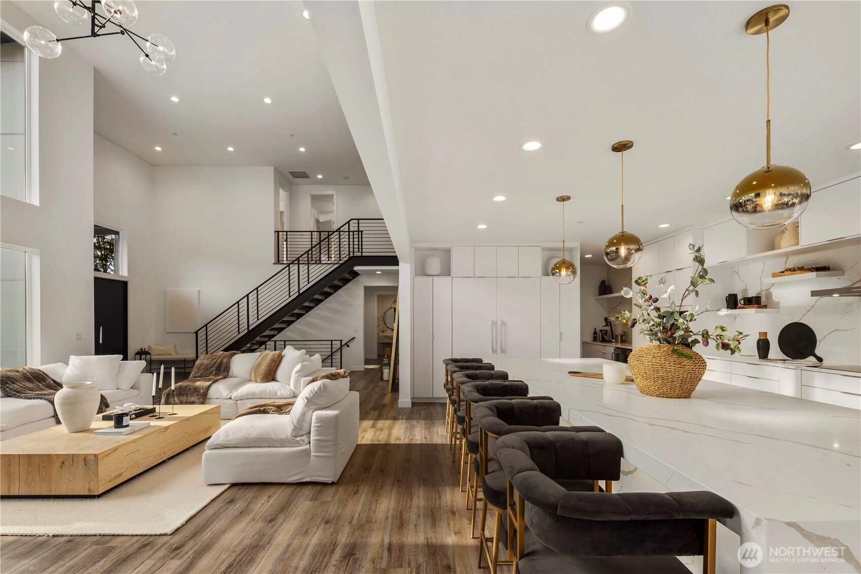 An extraordinary fusion of modern luxury and natural beauty, this 4,300 sqft Snoqualmie estate is a true sanctuary. Privately nestled on nearly an acre the home showcases soaring ceilings, a striking floating staircase, and exquisite designer finishes throughout. The custom European-inspired kitchen features sleek white cabinetry, state-of-the-art Miele appliances, and a dramatic 14’ waterfall island. Indulge in the spa-like primary suite with a double shower, soaking tub, and expansive walk-in closet. A main-level office, generous lower-level living space with separate entrance, and outdoor terraces, create a lifestyle of comfort and distinction. Effortless access to I-90, Bellevue, and award-winning schools. Timeless elegance, redefined.