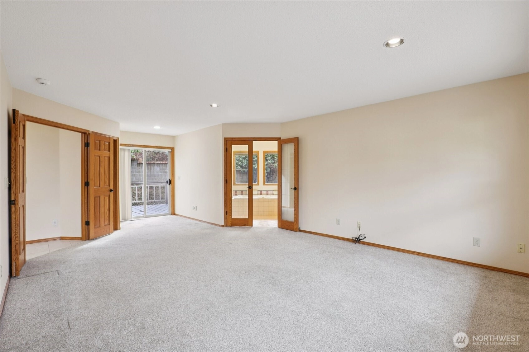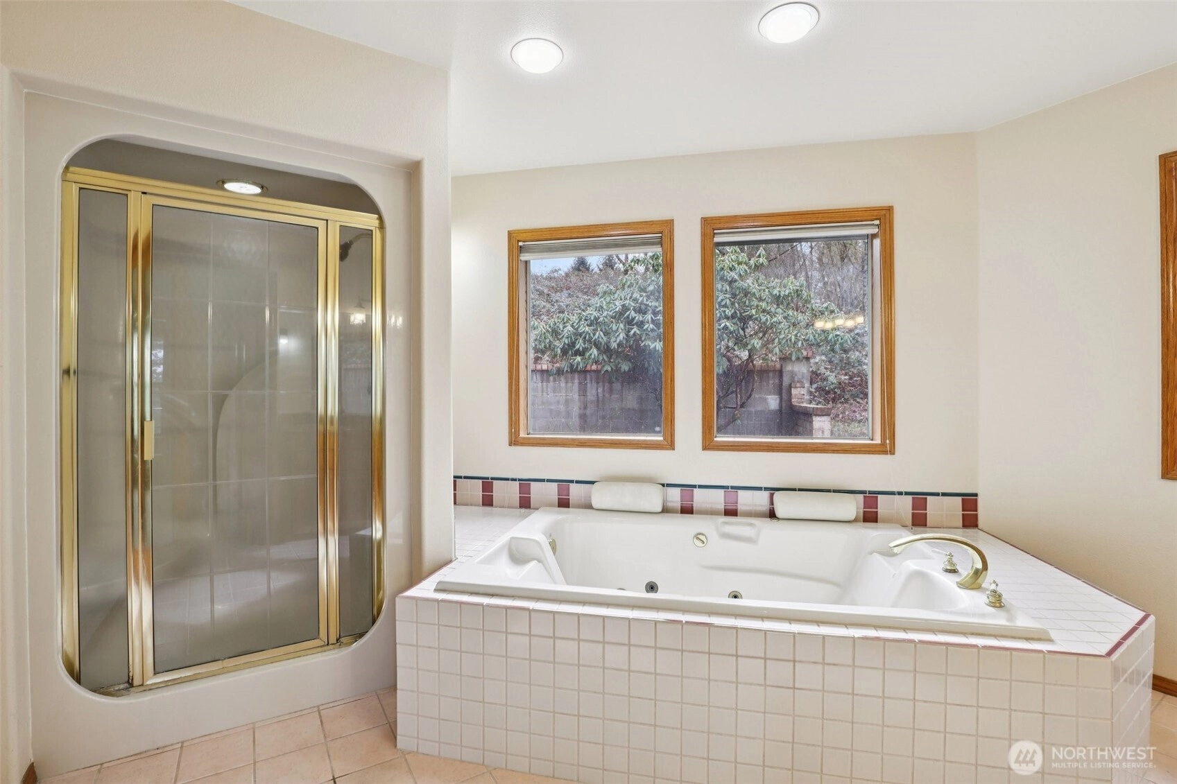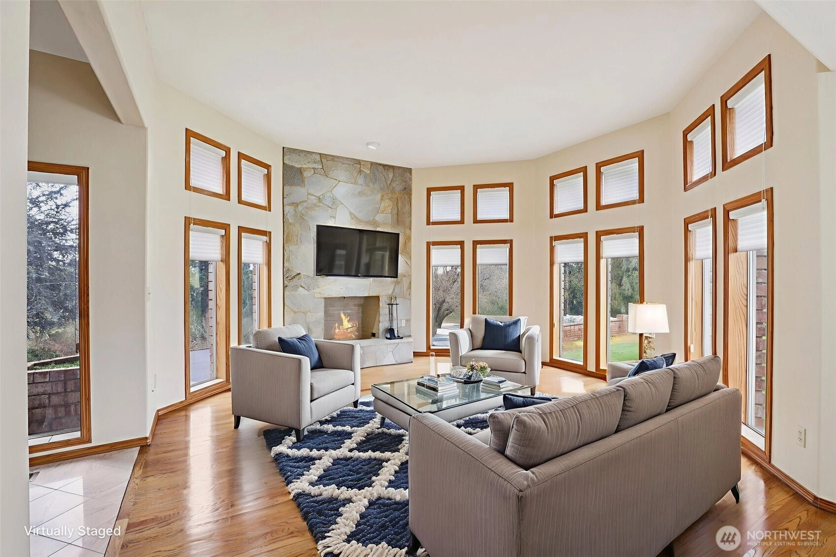 Grand double-door entry opens to foyer with half-turn staircase with oak balusters, accessory shelf, and soaring ceiling. Formal living room is filled with natural light, stone surround wood-burning fireplace, flowing into formal dining room with built-in buffet and convenient kitchen access. Great room family room with beveled glass French door entry, wall of windows and clerestory windows, vaulted ceiling, and ceiling fan, adjacent to wet bar with granite countertops. Kitchen offers granite counters, abundant cabinetry with pullouts, walk-in pantry, desk area, dishwasher, microwave, oven, Jenn-Air glass cooktop, downdraft, and stainless refrigerator. Separate dining area with bay window wall, slider access to wrap-around deck. French door entry to main-level primary suite includes walk-in closet, slider to deck, bath with dual granite vanity, jet tub, and shower. Upstairs are two additional bedrooms with walk-in closets, shared full bath, and bonus room/loft. Main-level laundry/mud room with sink and shower. Powder room with single sink granite vanity. Additional interior features include oak hardwood floors and interior doors, carpet, marble and ceramic tile floors, silhouette blinds, and central vacuum. Exterior showcases a fully landscaped, terraced, gated yard with wrap-around deck, koi pond, mini fruit tree orchard, forested area. Oversized, extra-deep three-car garage with staircase access to home. Mortgage savings may be available for buyers of this listing.