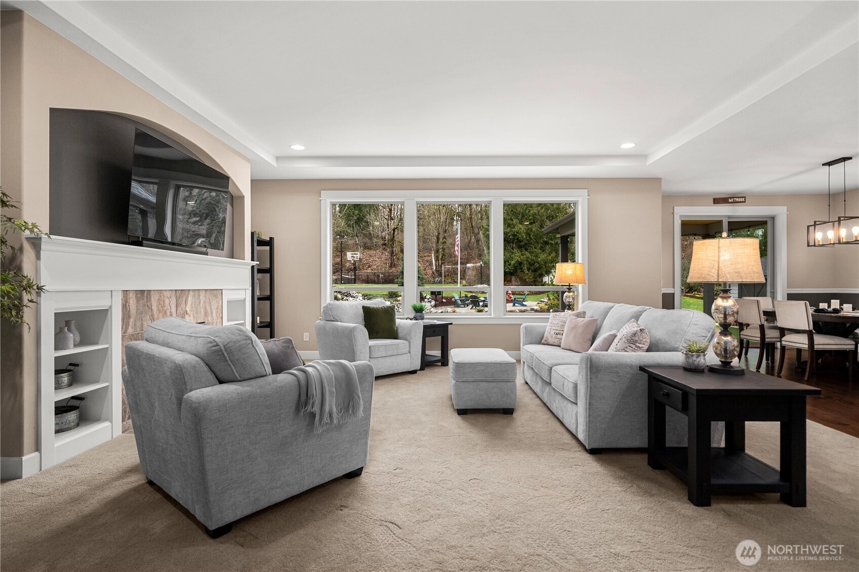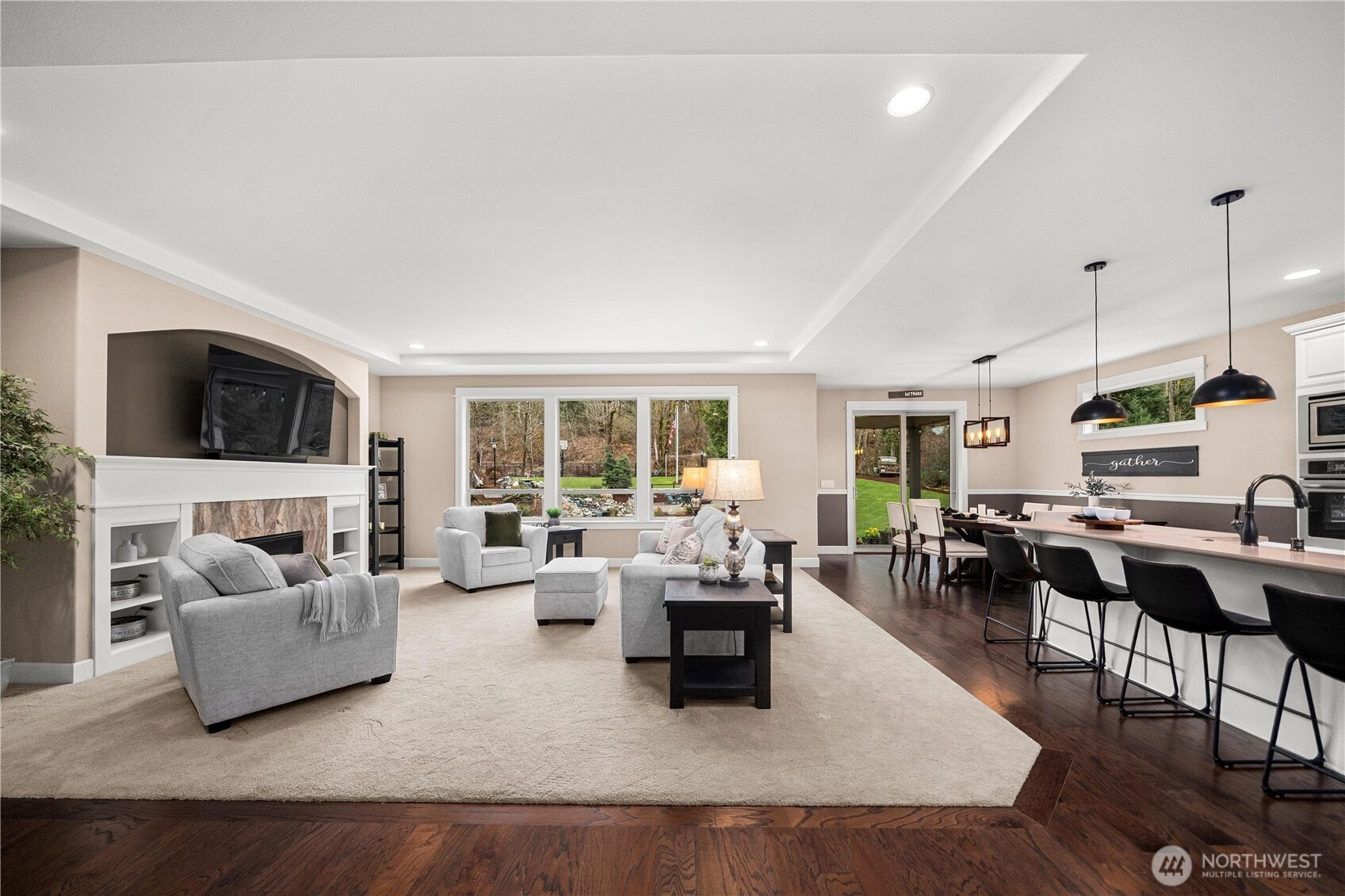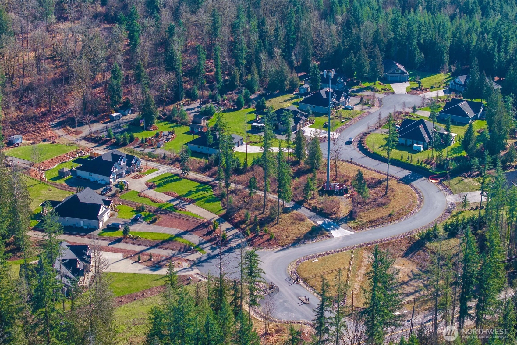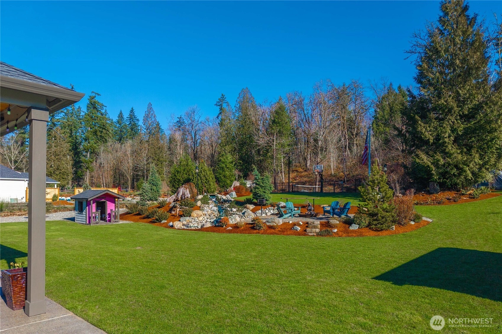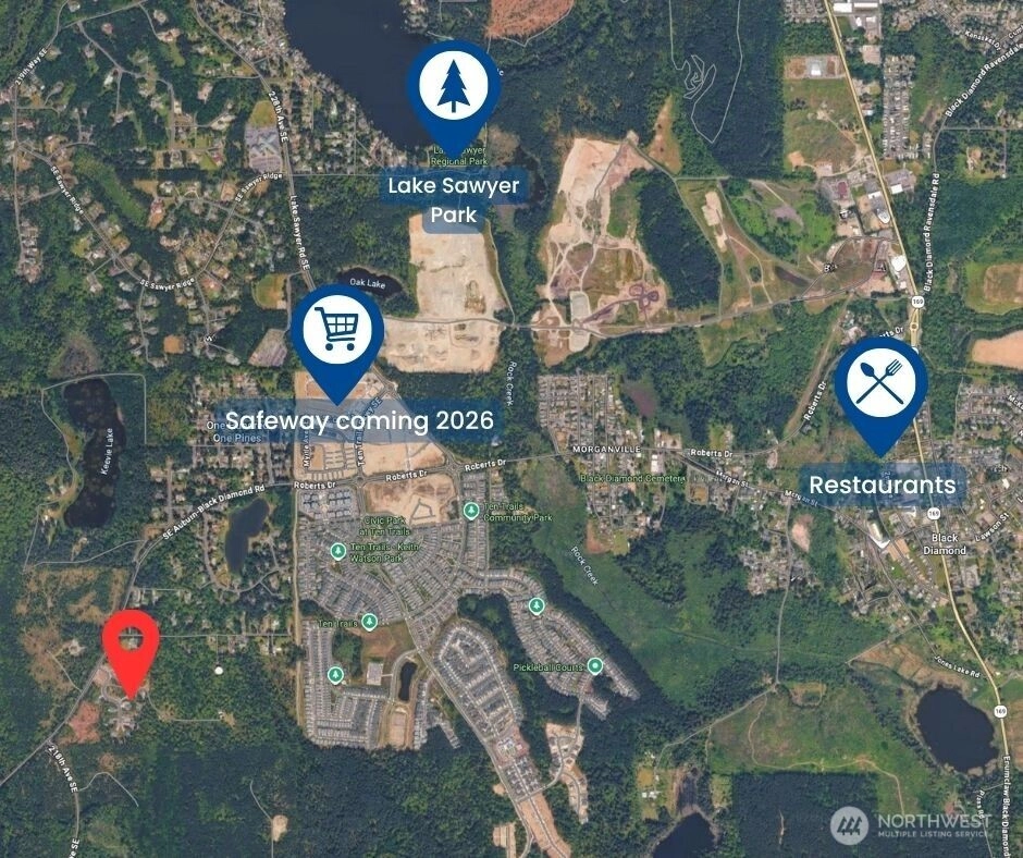 Rare cul-de-sac rambler on a spacious acreage lot in the desirable, gated Estates at Forest Mill community, offering privacy, flexibility, and true single-level living. This Garrette Custom Homes 3-bedroom, 2-bath rambler features an open, flowing floor plan with high ceilings, abundant natural light, and air conditioning for year-round comfort. The great room is designed for both daily living and entertaining. The gourmet kitchen includes a gas range, double oven, quartz countertops, stainless steel appliances, and generous workspace with seamless connection to the dining and living areas. The privately positioned primary suite offers a comfortable retreat with a spacious walk-in closet and en suite bath, thoughtfully separated from secondary bedrooms for added privacy. A parlor off the entry provides a versatile space ideal for a home office, hobby room, or secondary living area.The backyard is a true oasis with a covered porch, landscaped areas, fire pit, sport court, playhouse, horseshoe pits, treehouse, landscape lighting, and irrigation, creating exceptional outdoor living and recreation space. Two powered outbuildings and a woodshed add functionality and storage. The three-car garage features epoxy flooring and a generator panel that services the built-in generator. Designed for long-term livability, this property offers a rare combination of acreage, recreation, privacy, and functionality. Located near Maple Valley & Black Diamond for convenience.
