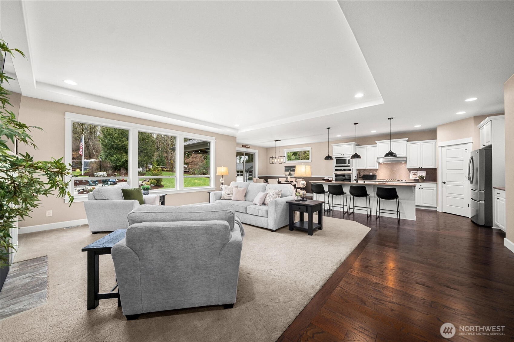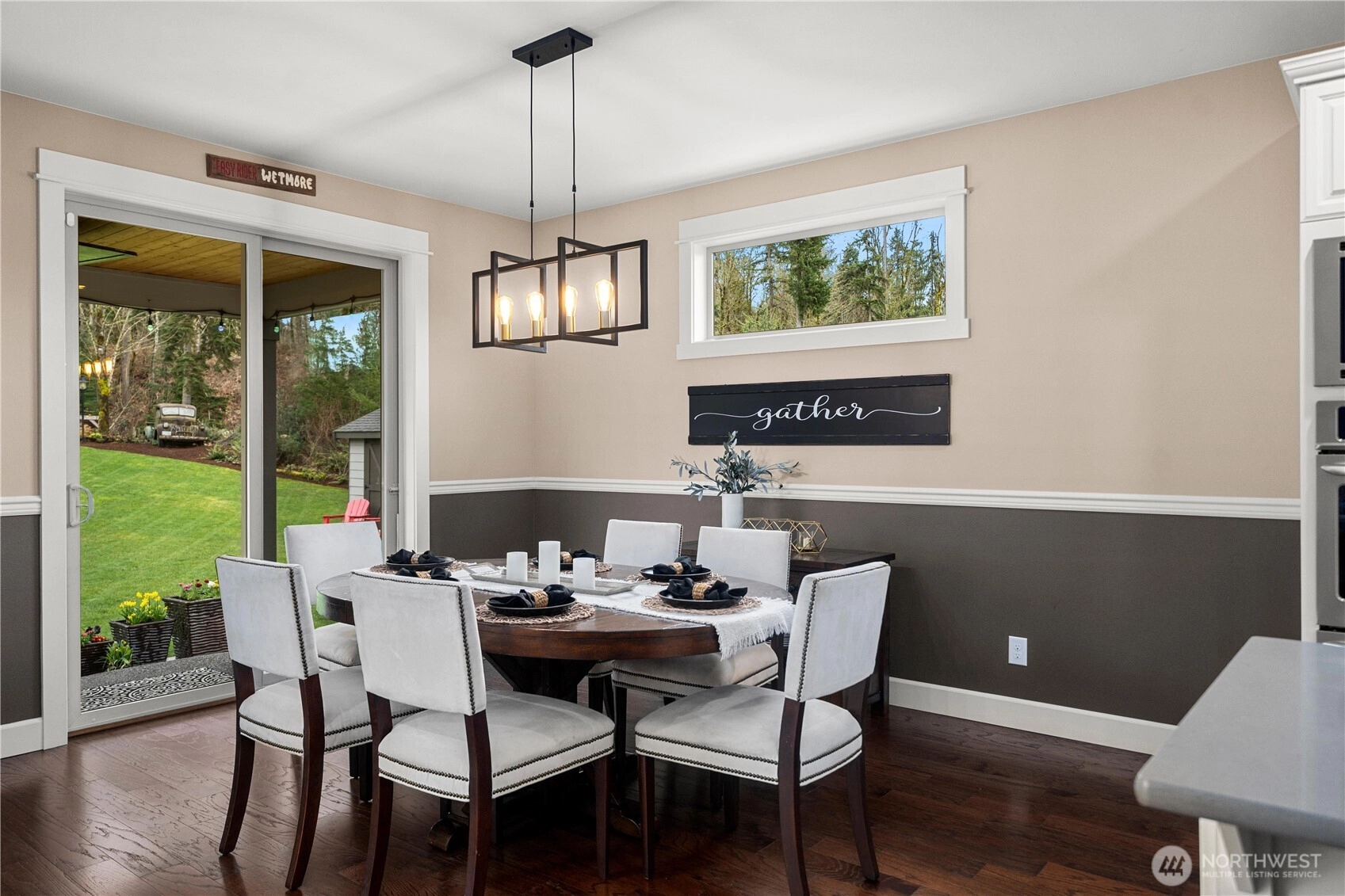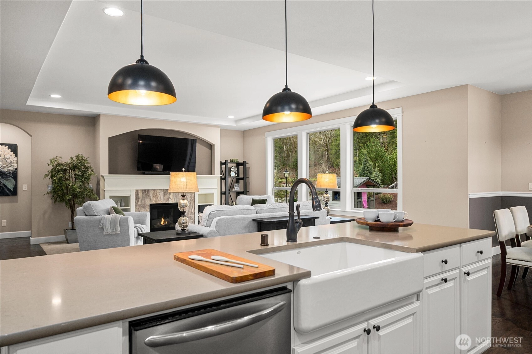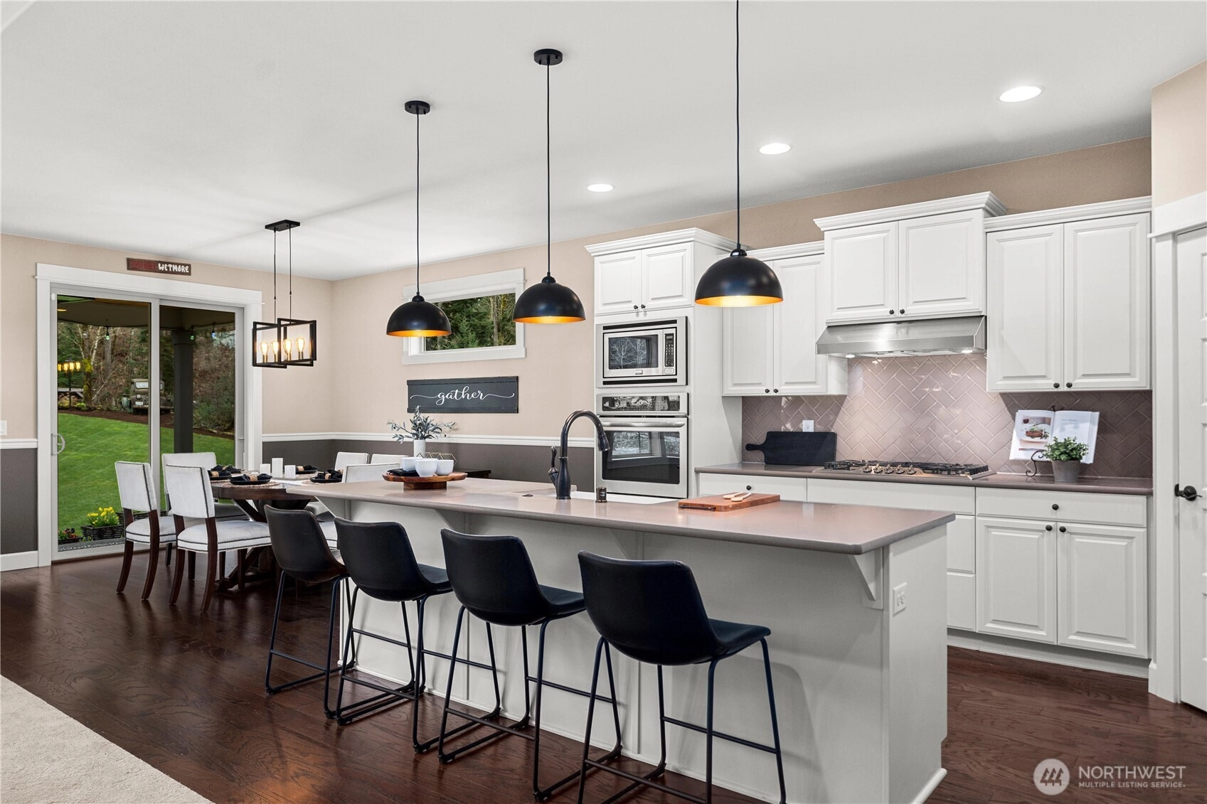 Rare cul-de-sac rambler on a spacious acreage lot in the desirable, gated Estates at Forest Mill community, offering privacy, flexibility, and true single-level living. This Garrette Custom Homes 3-bedroom, 2-bath rambler features an open, flowing floor plan with high ceilings, abundant natural light, and air conditioning for year-round comfort. The great room is designed for both daily living and entertaining. The gourmet kitchen includes a gas range, double oven, quartz countertops, stainless steel appliances, and generous workspace with seamless connection to the dining and living areas. The privately positioned primary suite offers a comfortable retreat with a spacious walk-in closet and en suite bath, thoughtfully separated from secondary bedrooms for added privacy. A parlor off the entry provides a versatile space ideal for a home office, hobby room, or secondary living area.The backyard is a true oasis with a covered porch, landscaped areas, fire pit, sport court, playhouse, horseshoe pits, treehouse, landscape lighting, and irrigation, creating exceptional outdoor living and recreation space. Two powered outbuildings and a woodshed add functionality and storage. The three-car garage features epoxy flooring and a generator panel that services the built-in generator. Designed for long-term livability, this property offers a rare combination of acreage, recreation, privacy, and functionality. Located near Maple Valley & Black Diamond for convenience.