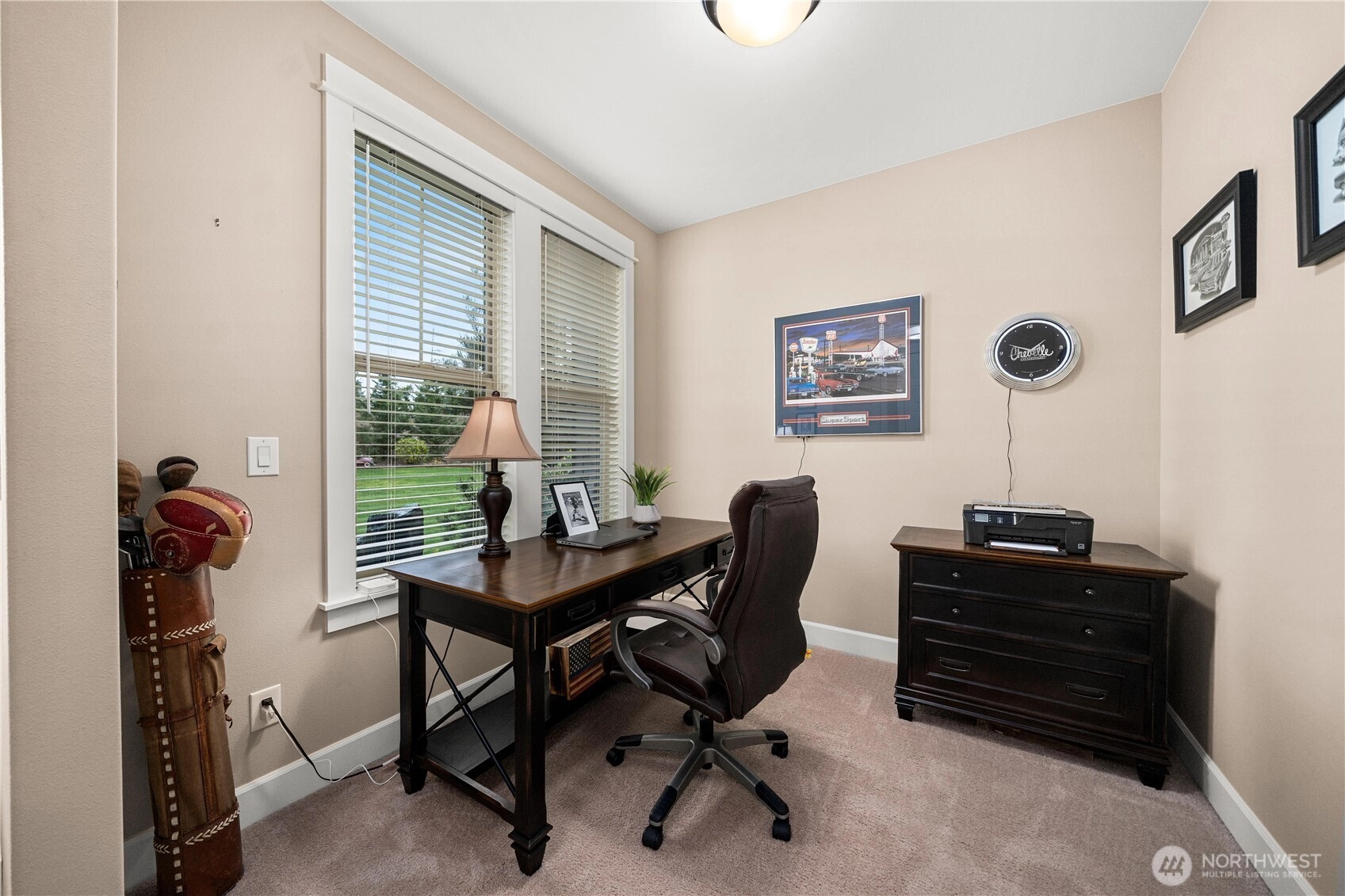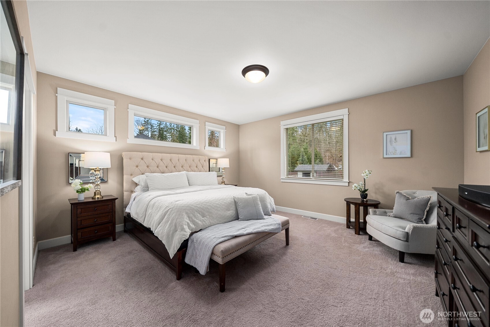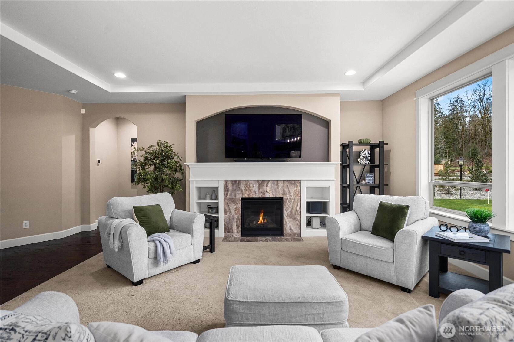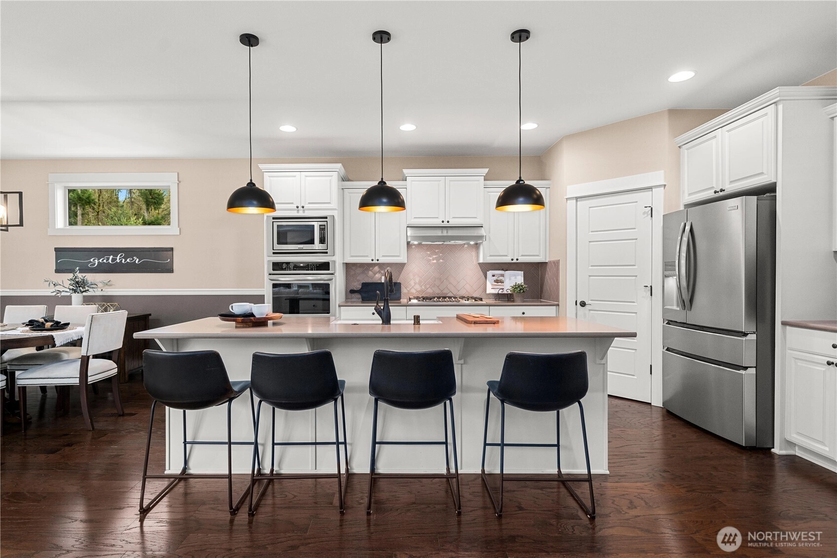 Rare cul-de-sac rambler on a spacious acreage lot in the desirable, gated Estates at Forest Mill community, offering privacy, flexibility, and true single-level living. This Garrette Custom Homes 3-bedroom, 2-bath rambler features an open, flowing floor plan with high ceilings, abundant natural light, and air conditioning for year-round comfort. The great room is designed for both daily living and entertaining. The gourmet kitchen includes a gas range, double oven, quartz countertops, stainless steel appliances, and generous workspace with seamless connection to the dining and living areas. The privately positioned primary suite offers a comfortable retreat with a spacious walk-in closet and en suite bath, thoughtfully separated from secondary bedrooms for added privacy. A parlor off the entry provides a versatile space ideal for a home office, hobby room, or secondary living area.The backyard is a true oasis with a covered porch, landscaped areas, fire pit, sport court, playhouse, horseshoe pits, treehouse, landscape lighting, and irrigation, creating exceptional outdoor living and recreation space. Two powered outbuildings and a woodshed add functionality and storage. The three-car garage features epoxy flooring and a generator panel that services the built-in generator. Designed for long-term livability, this property offers a rare combination of acreage, recreation, privacy, and functionality. Located near Maple Valley & Black Diamond for convenience.