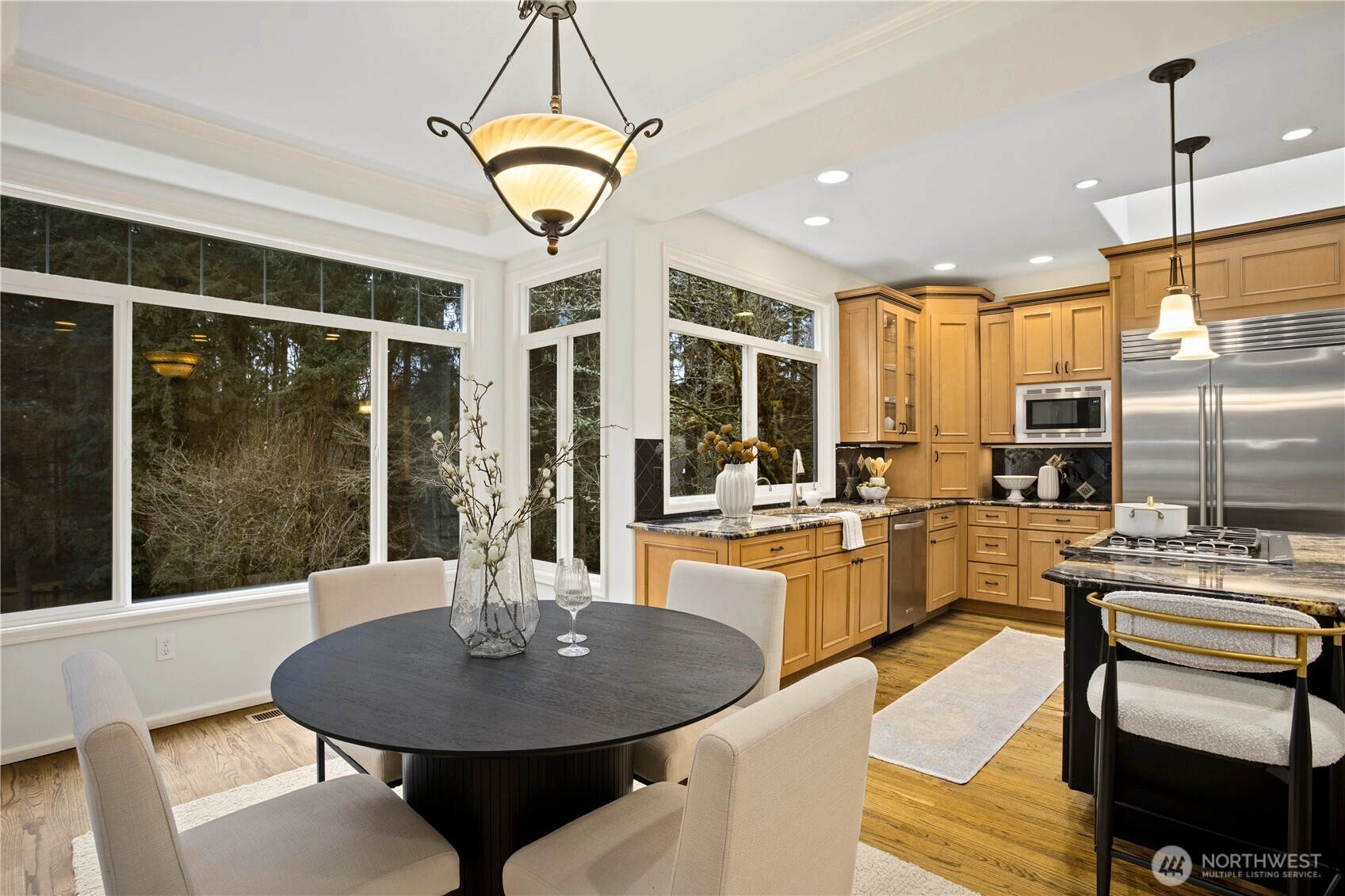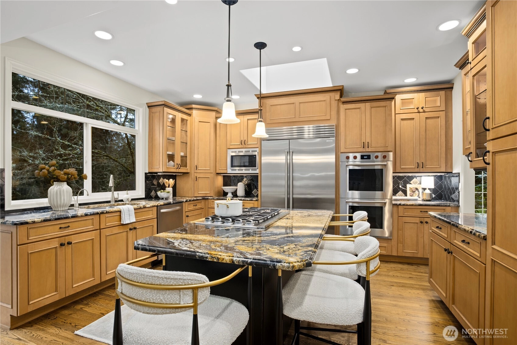 This stunning Fred Burnstead custom home showcases stunning architectural details and meticulous craftsmanship throughout. Newly refreshed with interior paint and plush carpet, this home exudes warmth and effortless elegance. The chef’s kitchen is a showstopper, featuring striking granite countertops, beautiful oak shaker cabinetry, a generous center island, double ovens, and premium stainless steel appliances - perfect for creating culinary masterpieces or hosting unforgettable gatherings. The recreation level is an entertainer’s dream, offering a media center, refreshment bar, wine cellar, and tasting room for year-round enjoyment. Throughout the home, exquisite wainscoting, fine trim work, and thoughtful details add sophistication at every turn. Step outside to over half an acre of backyard paradise, complete with a tiered deck, outdoor kitchen and BBQ area, patio, wired for a hot tub, and a full-size sports court - ideal for summer parties and making lasting memories. A built-in generator provides peace of mind and uninterrupted comfort during PNW winters. Skylights and large windows flood the home with natural light, creating a warm and welcoming atmosphere from morning to night. This residence seamlessly blends luxury, functionality, and comfort, offering an unmatched lifestyle for those who love to entertain and enjoy life to the fullest.