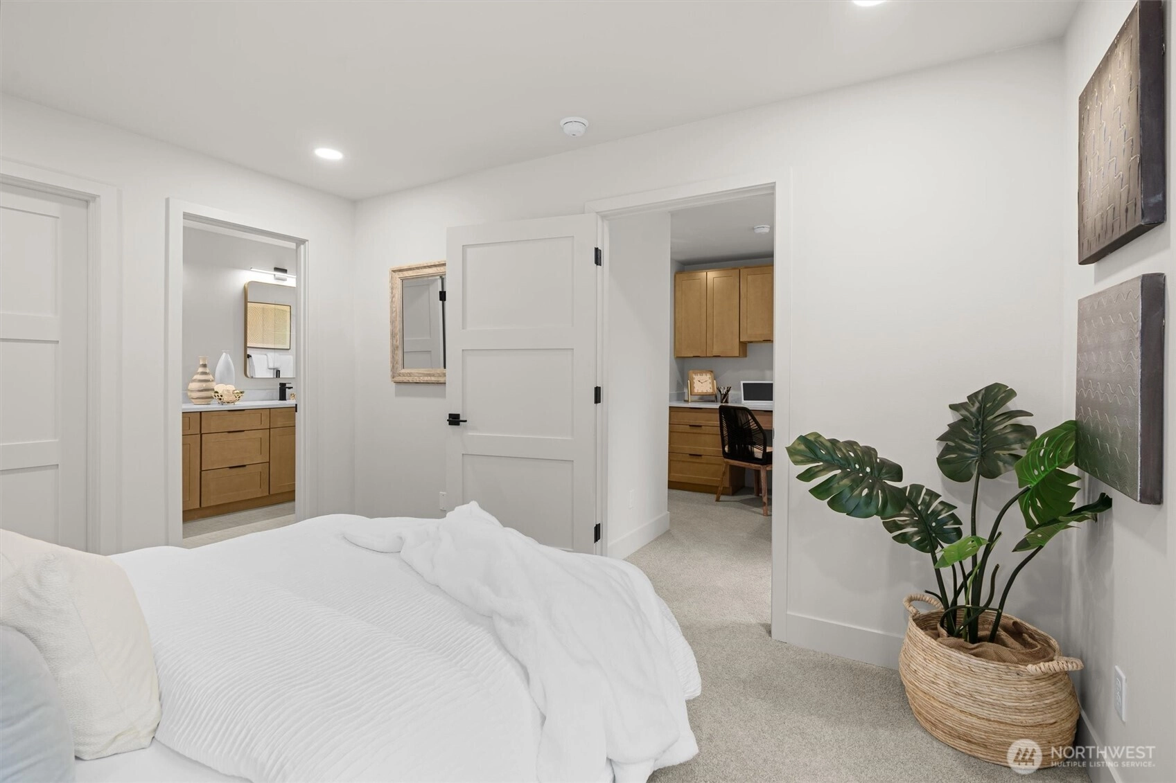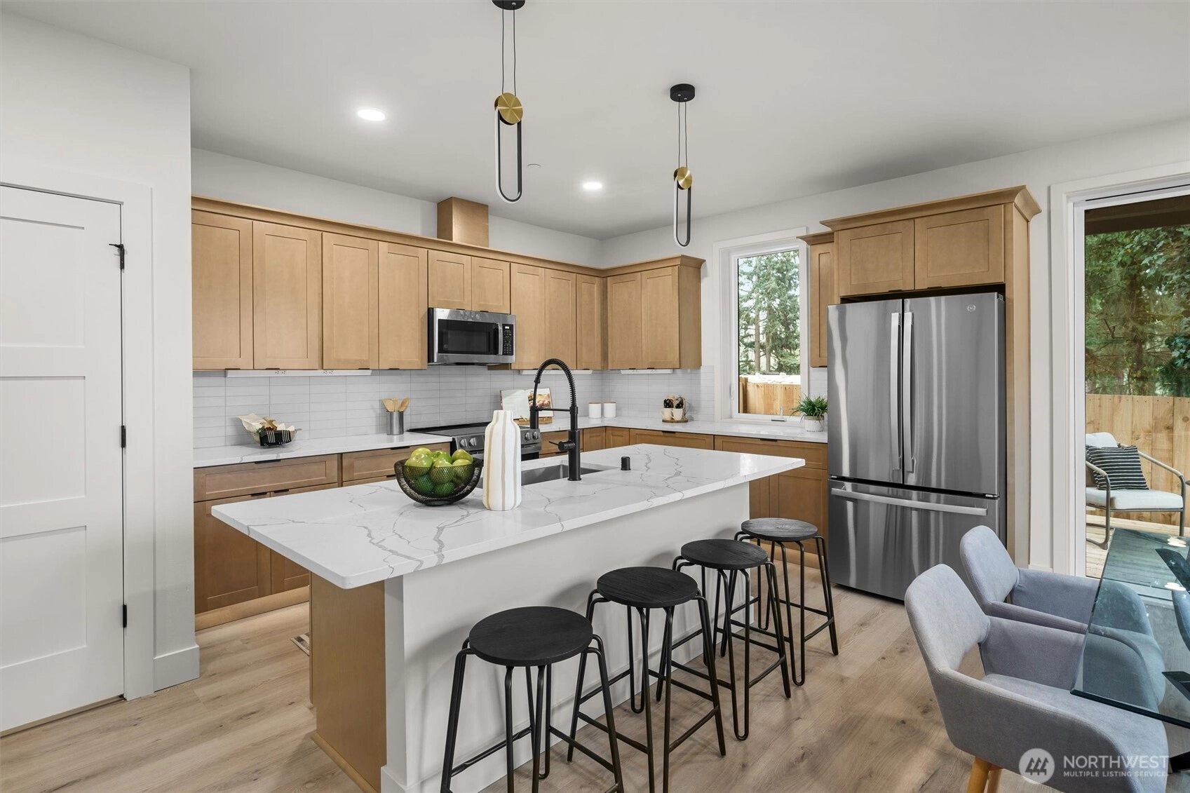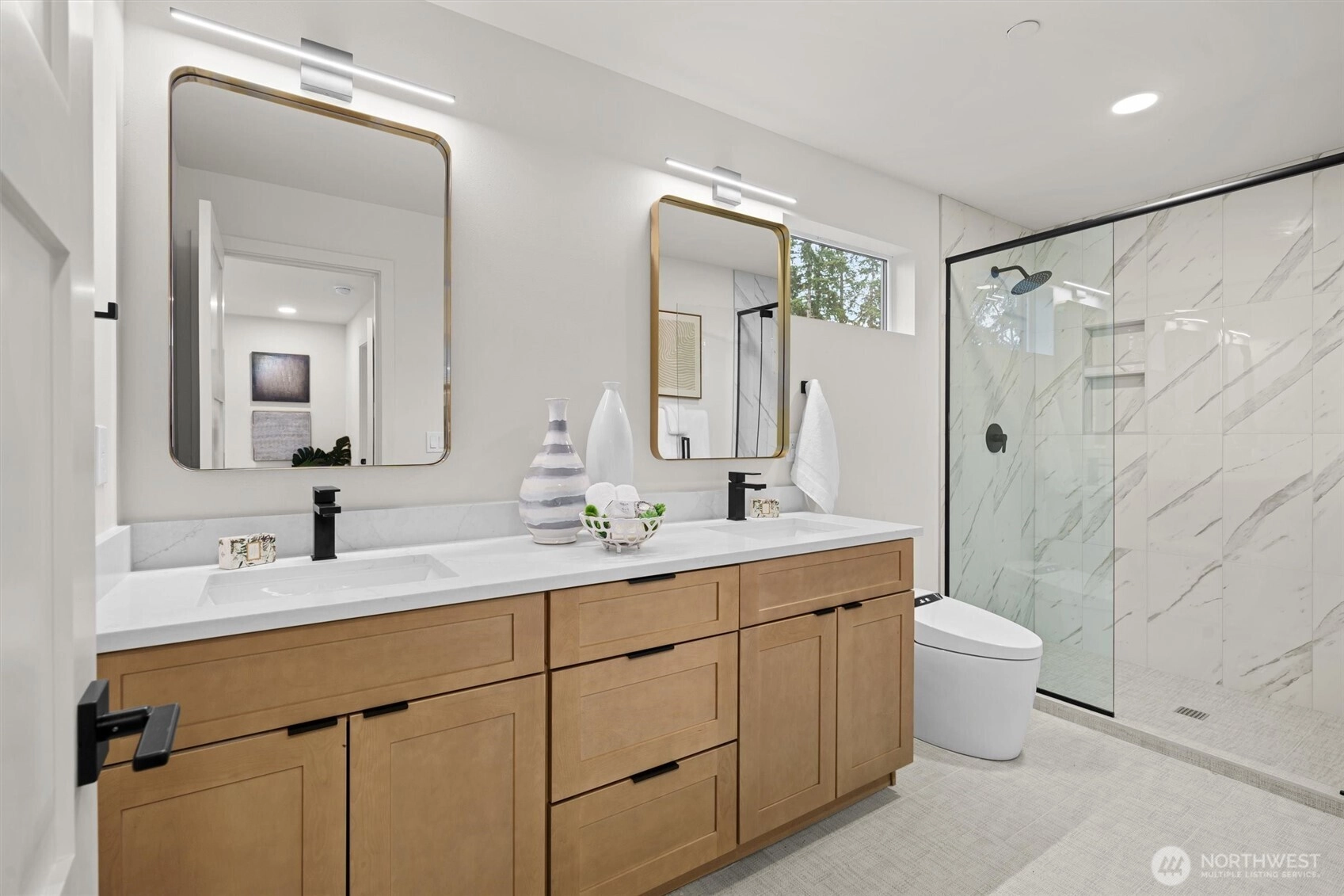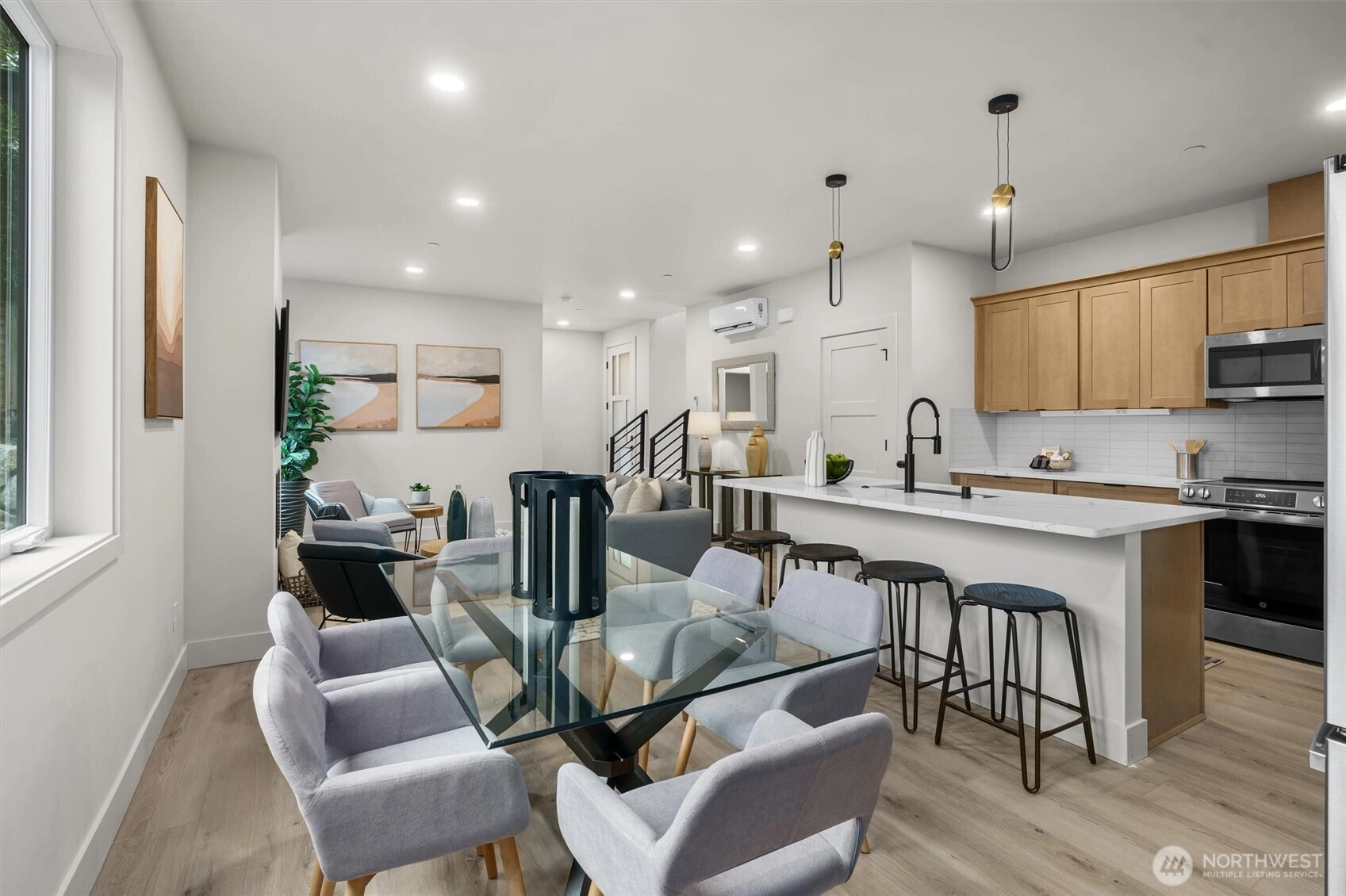 Stunning new construction by Holden Development Group in sought-after South Juanita. Thoughtfully designed with modern elegance and quality craftsmanship, this light-filled home features an open-concept main level ideal for everyday living and entertaining. The gourmet kitchen offers a spacious island with seating, premium stainless appliances, sleek cabinetry, and generous prep space, flowing seamlessly into the dining area and inviting living room. Upstairs, retreat to the luxurious primary suite complete with a spa-inspired bath and generous walk-in closet. A second spacious bedroom, full bath, and conveniently located upper-level laundry enhance functionality and comfort. Enjoy a private fenced yard and patio perfect for relaxing or hosting gatherings, plus one EV-ready parking space. Ideally located near parks, beaches, Juanita Village, and just minutes to downtown Kirkland with easy access to major tech campuses. Top-rated Lake Washington School District, this home blends modern style, smart design, and an unbeatable Eastside location.