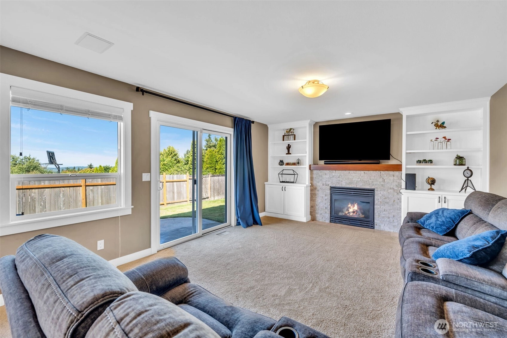 Beautifully updated home offers 4 bedrooms + office or 5th bedroom. Vaulted ceilings in the living and dining rooms. Open kitchen design enjoys quartz counters, Stainless steel appliances and walk-in pantry. Large adjoining family room warms you with the gas fireplace and access to backyard patio. French doors lead you into the primary bedroom with walk-in closet and 5 piece bath. Olympic mountain, sunset and sound views. Covered front porch overlooks the level yard. 3 additional bedrooms with full bath and laundry room. Owned solar panels help offset your electric bill. Epoxy floors in the garage, built-in storage cabinets and EV charging. New electric panel, wired for generator and tankless water heater. Enjoy AC for those hot summer nights. Fenced level yard and multi zoned sprinkler system will help keep your yard green all year round. 2 storage sheds and RV parking round out this amazing home.