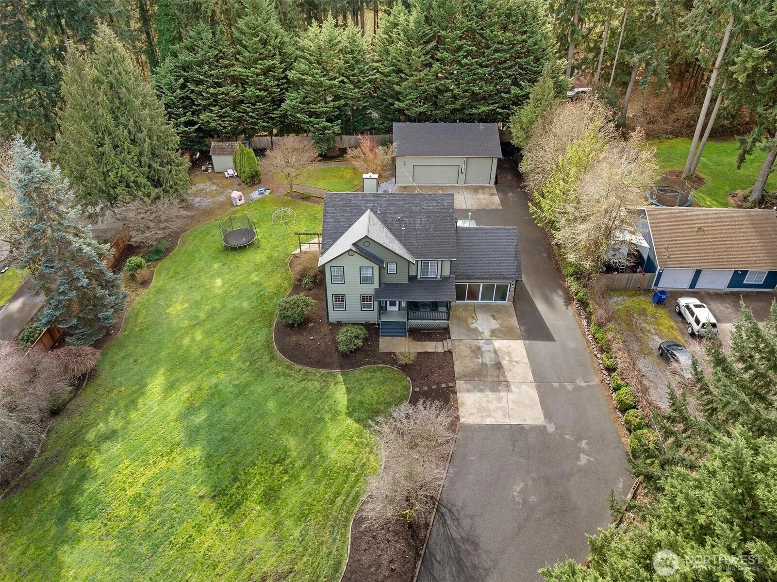 Need space for your toys, tools, or projects? This private gated acre in Lake Tapps features a 1,200sf detached shop with a 16’ door, perfect for boats, RVs, work trucks, or serious hobbies that don't fit in the house. Properties offering this much functional space combined with a beautifully updated home are incredibly rare in this area. Tucked behind a gated entry and surrounded by trees, the property offers both privacy and breathing room while still being just minutes from Lake Tapps and everyday amenities. The home itself welcomes you with timeless contemporary farmhouse charm, beginning with a covered front porch that’s perfect for slow mornings with coffee or relaxing evenings. Inside, the open-concept kitchen, dining, and living areas create the heart of the home, offering a warm and inviting space for both everyday living and entertaining. Natural light pours in, highlighting the thoughtful updates and comfortable layout. Upstairs, the spacious primary suite offers multiple closets, abundant natural light, and a beautiful five-piece ensuite. Two additional bedrooms provide flexibility for guests, family, or a home office. Outside, the full acre provides endless possibilities — room to garden, host gatherings, or simply enjoy the peace and quiet of your own private retreat. With a gated entrance, rare shop space, and a welcoming farmhouse aesthetic, this property delivers the lifestyle buyers are searching for: privacy, functionality, and space to live, work, & play!