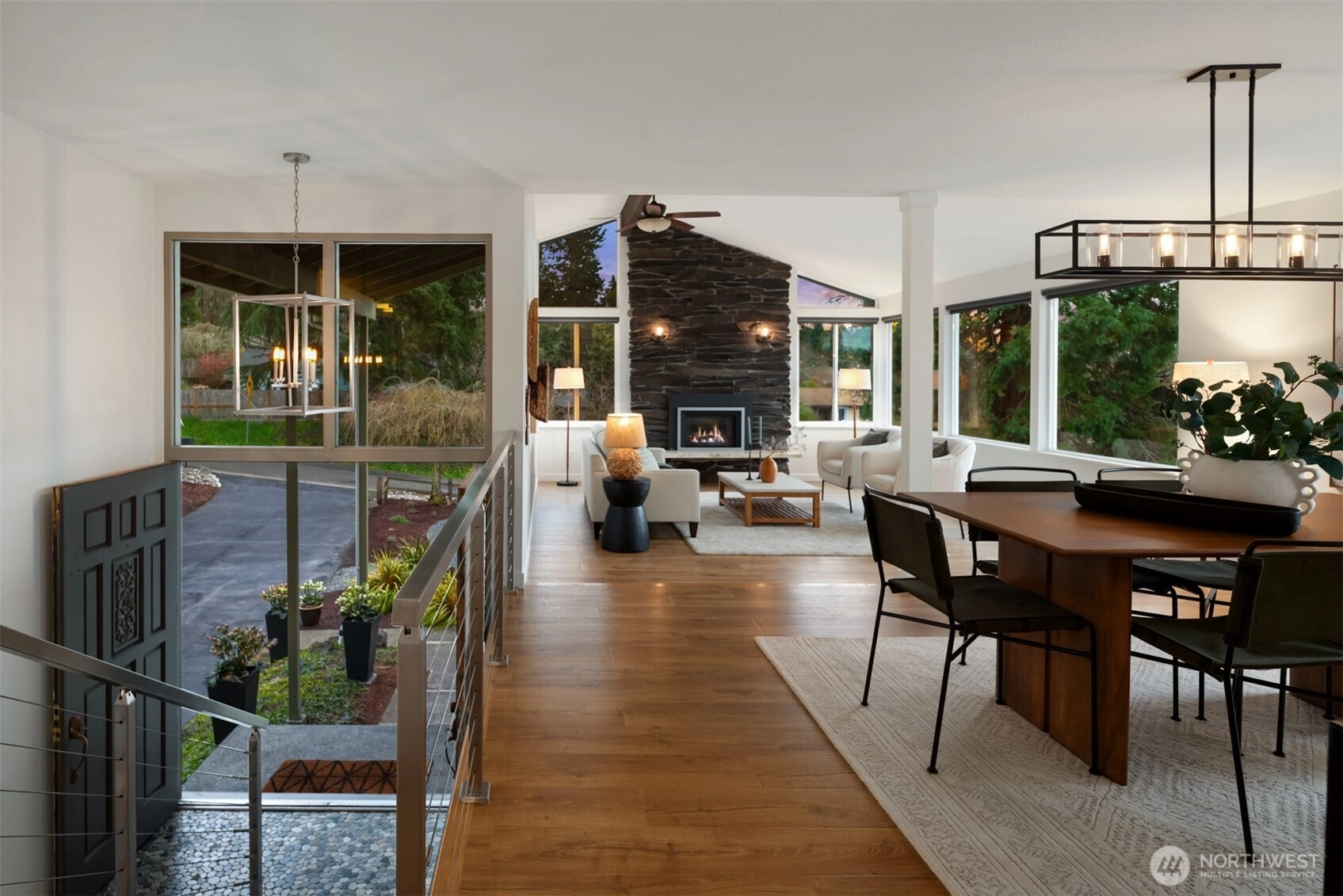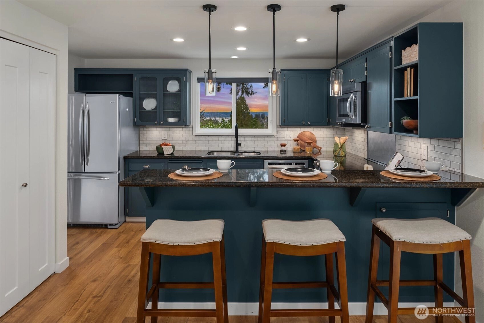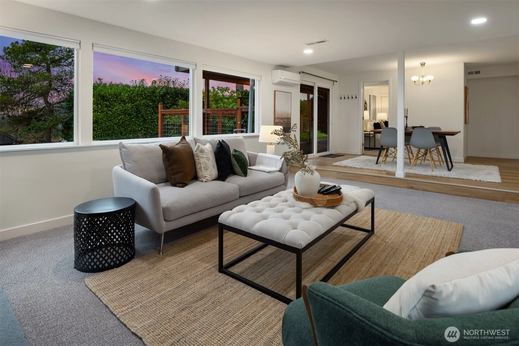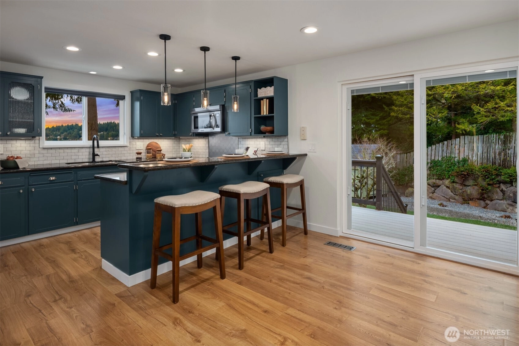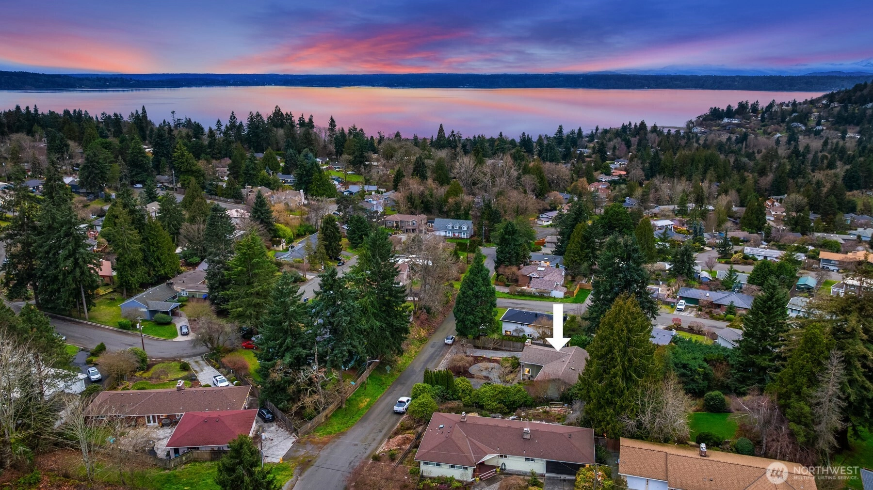 Set on a sunny 15,000 SF lot in Normandy Park, this inviting home offers westerly views of the Olympic Mountains & Puget Sound. The open living room features generous vaulted ceilings, a gas fireplace, & south- & west-facing windows that brighten even the dreariest PNW days. The updated kitchen offers ample storage, granite counters, & stainless appliances. The open dining area enjoys sunset views & French doors to the deck. The main-floor primary bedroom includes a walk-in closet plus a second full closet, along with an expanded en suite bath featuring double sinks & a curbless shower. Two additional bedrooms & a full bath round out the spacious main floor. The lower level offers exceptional flexibility with a remodeled second kitchen, bedroom, full bath, dining area, & family room—all with its own exterior access, an ideal setup for long-term guests or multigenerational (MIL) living. Laundry is conveniently located on the main floor with a second laundry downstairs. Outside, enjoy a roomy deck built for sunsets & summer dinners, plus a large fenced yard made for play, gardening, or dogs on the run. Updates include Hardi siding, newer windows, new water line, updated flooring & baths, interior paint, a heat pump with A/C, & EV charging, plus ample parking with a two-car garage & large gravel pad with lower-level access. A special home in a special pocket of Normandy Park, with Nist Park just kiddie-corner. Pre-inspected.