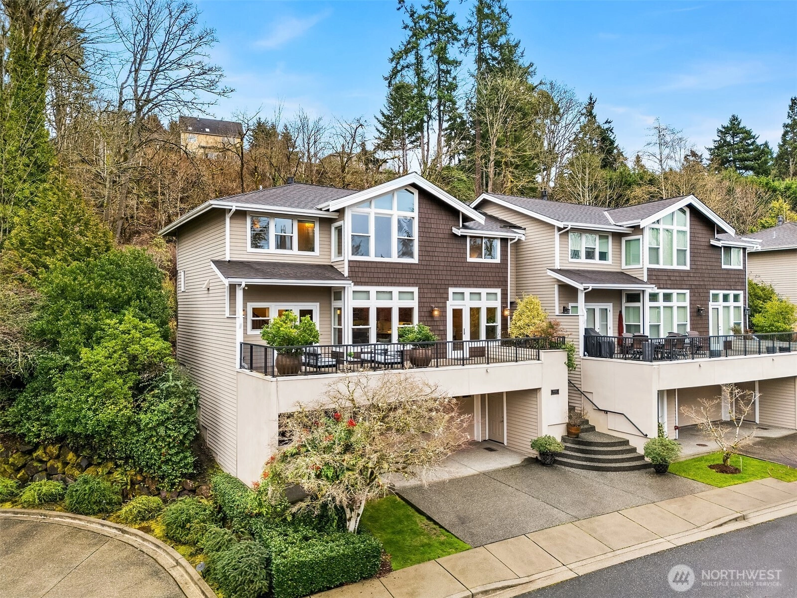 Tucked within an intimate enclave of five residences, end-unit bathed in natural light, this home captures sweeping western views, framing golden sunsets, soaring eagles, and shimmering lake vistas. Refined, high-end finishes, the interiors reflect elegance at every turn. Gleaming cherry cabinetry, expanses of granite countertops and backsplash, and custom built-ins create both beauty and function. Anderson French doors extend living and dining spaces onto a remarkable 200-foot terrace, an entertainer’s dream and the perfect perch for morning coffee or evening gatherings. The vaulted primary suite is a serene retreat with views overlooking Lake Washington and the Olympic mountain range. A peaceful escape with captivating views and a beautifully updated bath featuring marble counters, designer tile, and refined fixtures. All bathrooms have been thoughtfully updated with timeless materials and cohesive style. The lower-level bonus room, with a separate, private entrance complete with built-in speakers, invites versatility as a theater or media room, home office, fitness space, or guest quarters. An oversized two-car garage with a third bay provides exceptional storage and flexibility for watercraft, additional storage, or recreational gear. Directly across from Newport Marina, easy access to Seattle and SeaTac, and located within the award-winning Bellevue School District including Newport High School, this residence delivers a premier, low-maintenance lifestyle. No Rental Cap.