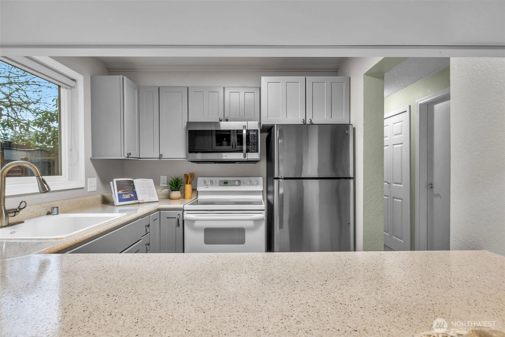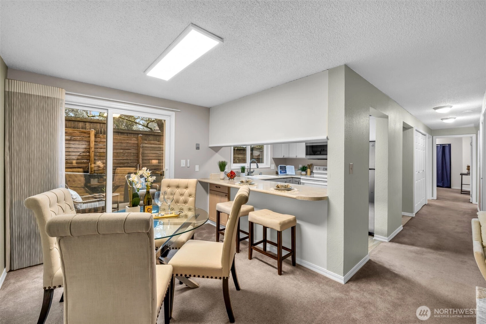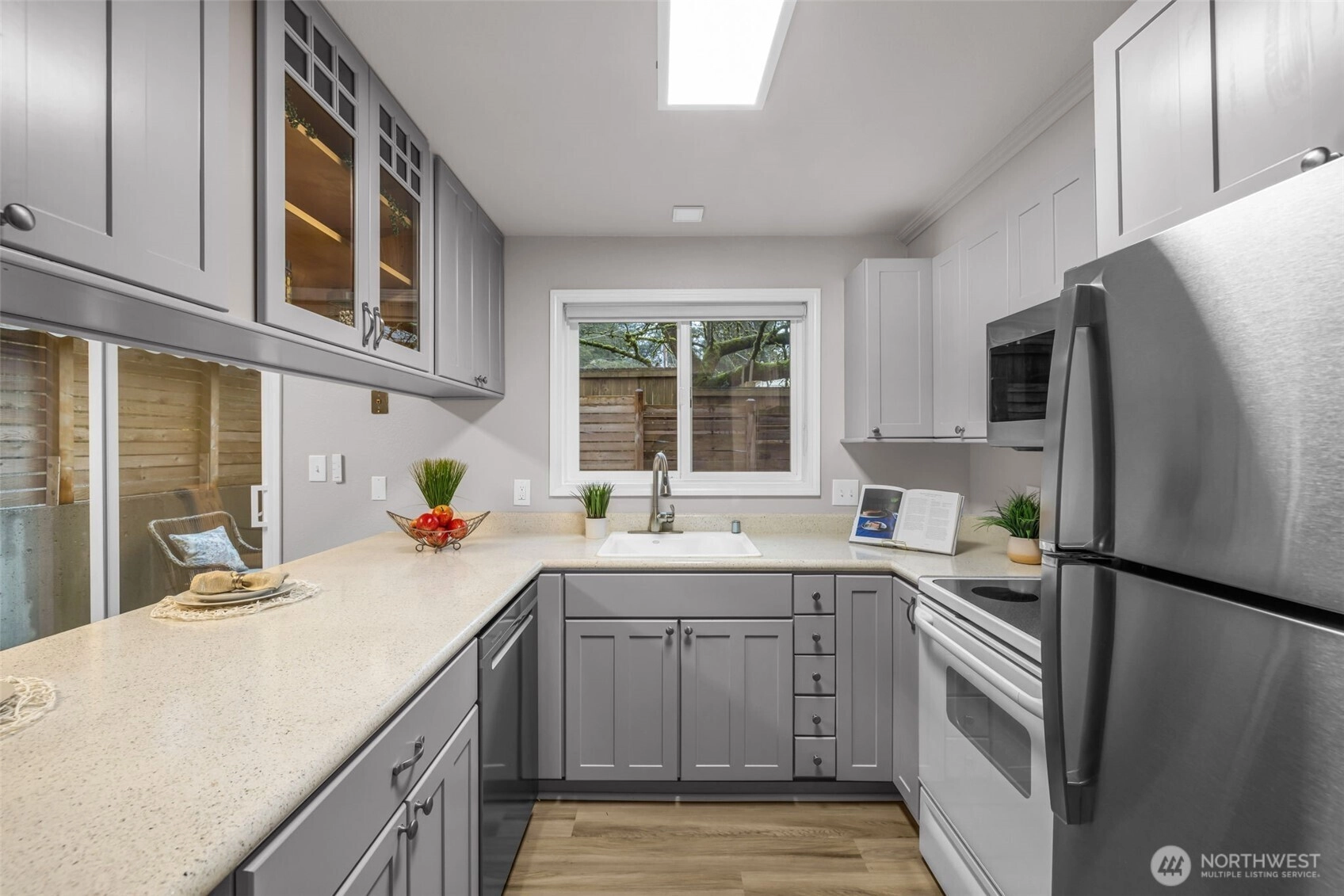 Rare ground-level corner 2 bedroom, 1.75 bath condo with an oversized private patio—an urban retreat tucked securely behind a locked gate and privacy fence. Move-in ready and thoughtfully updated, this home offers the ease of city living with the comfort and quiet of your own outdoor sanctuary. Start your mornings at the cozy coffee shop just across the street, then come home to a patio that truly extends your living space—perfect for unwinding or hosting friends without the noise of a typical city condo. Inside, enjoy an upgraded kitchen with updated cabinetry, countertops, appliances, and flooring, plus a brand-new water heater and the peace of mind of a completed pre-inspection and available resale certificate. Designated parking and a recently renovated building exterior add lasting value. Set in Seattle’s well-connected Northgate neighborhood, you’re near groceries, a pharmacy, Light Rail, I-5, shopping, and dining. Dog owners will appreciate the nearby daycare, overnight facilities, and pet supply options right across the street—making daily life easier for you and your pup.