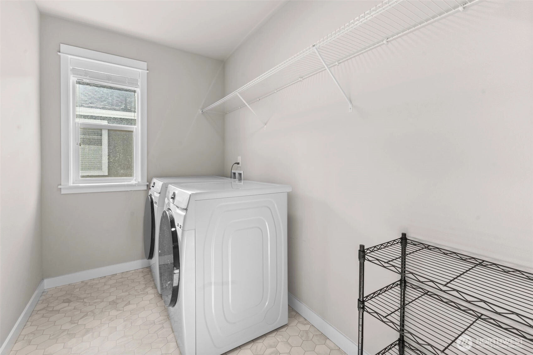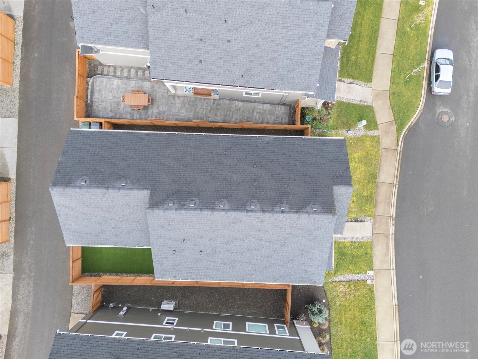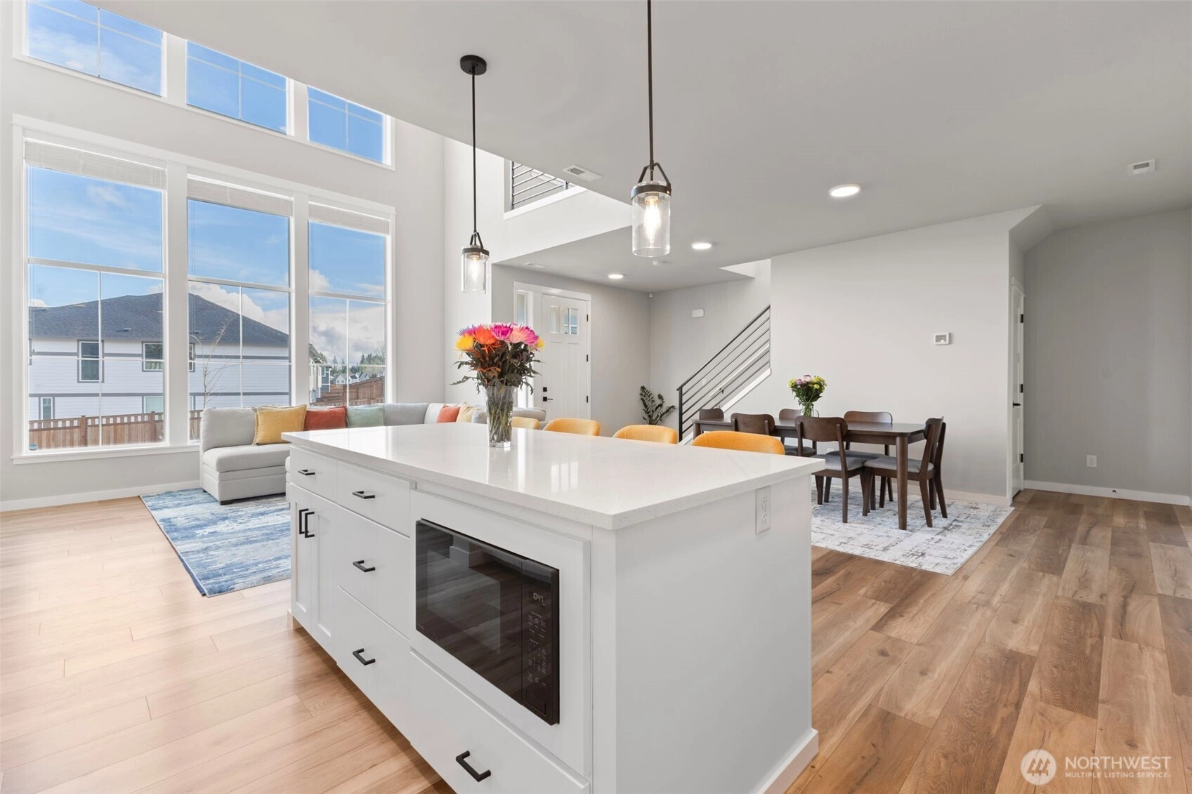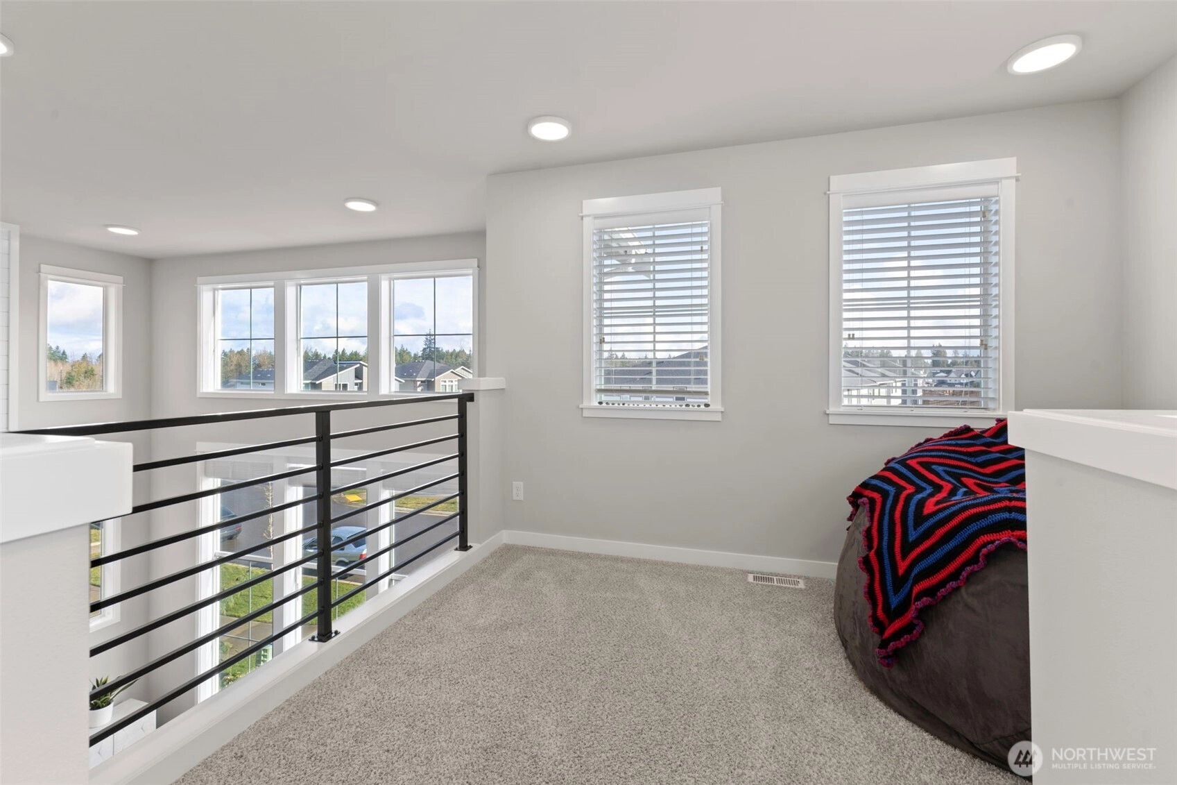 Welcome to this stunning 3-bedroom, 2.5-bath home in Bonney Lake, built in 2022, offering 2,148 sq ft of thoughtfully designed living space with AC for year-round comfort. The open-concept layout boasts vaulted ceilings, bright windows, and a kitchen featuring quartz countertops, stainless steel appliances, a large walk-in pantry, and a breakfast bar—perfect for everyday living and entertaining. Upstairs, the primary suite includes a 5-piece en suite bath with separated double vanity, soaking tub, walk-in shower with tile finishes, and a large closet. The additional bedrooms are generously sized, with a cozy reading nook and convenient upstairs utility room. Step outside to a low-maintenance turf yard with a covered patio, gas hookup for your BBQ, and TV mount for effortless outdoor entertainment. The epoxy-finished garage offers additional storage space. Set up a showing today!