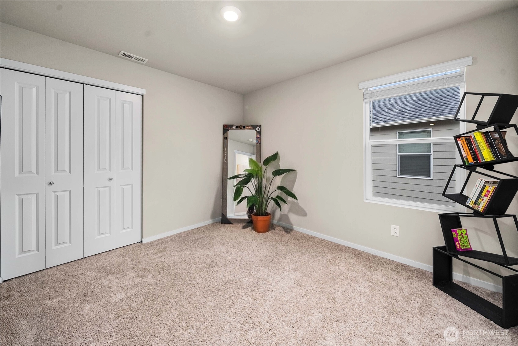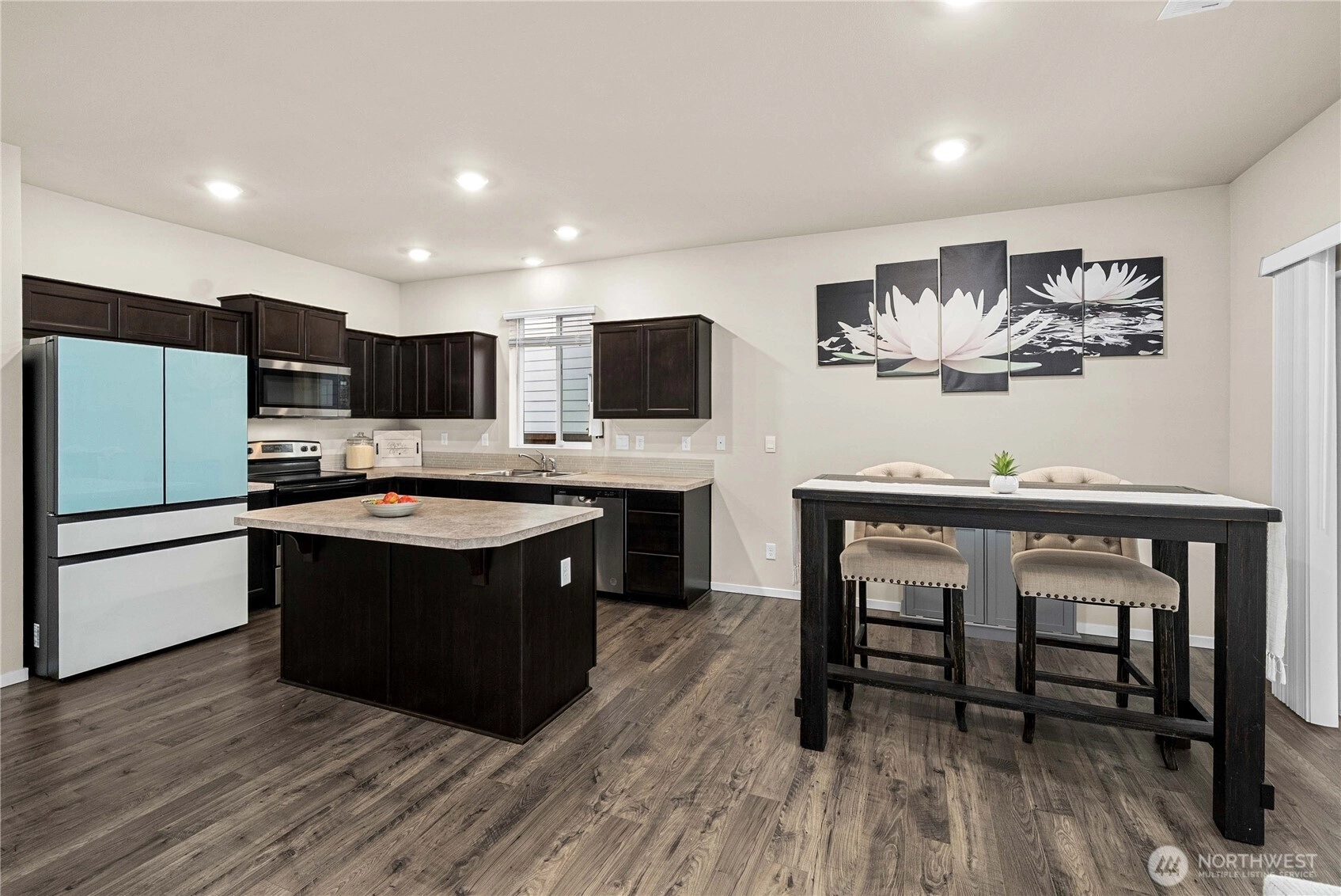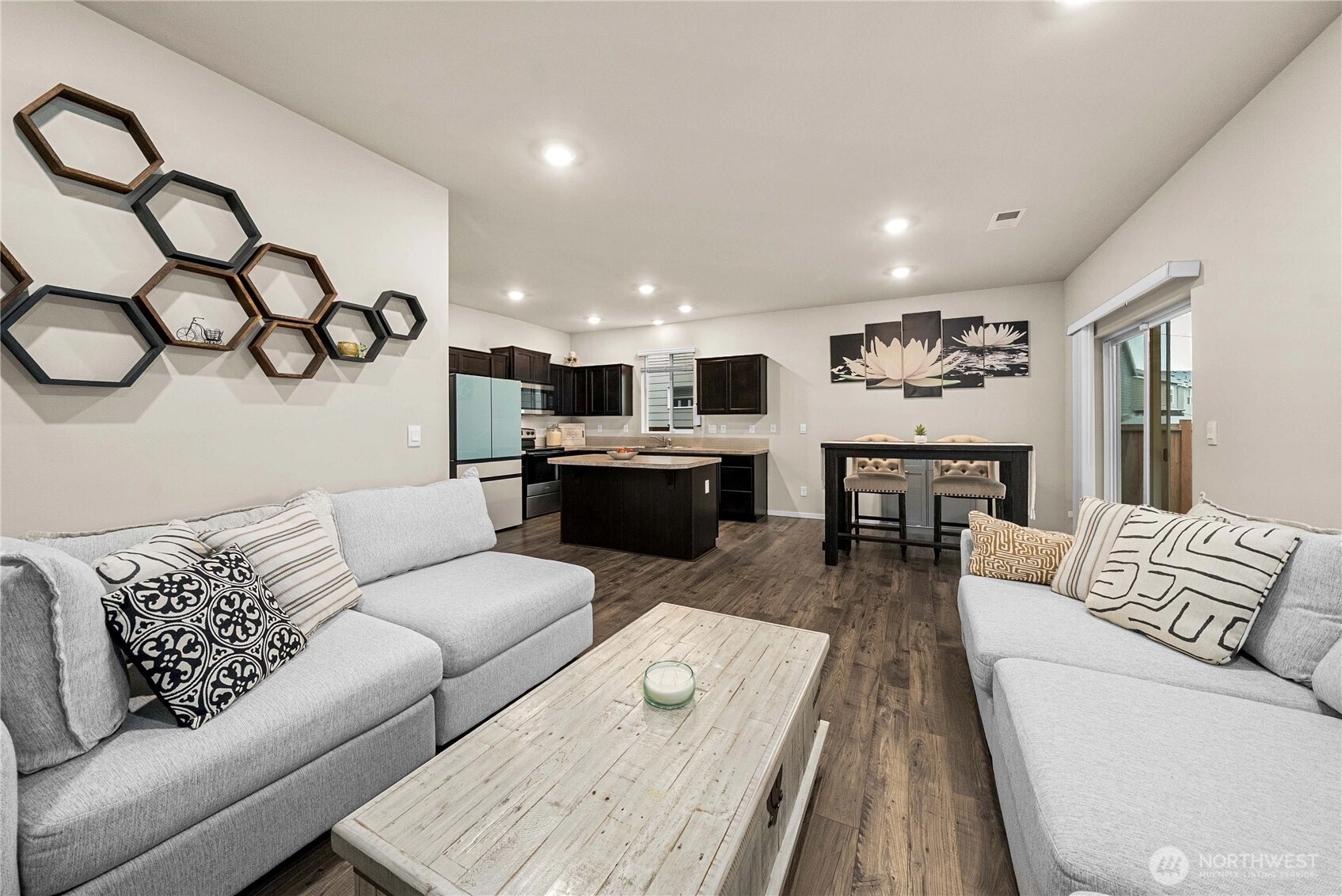 Tucked into a quiet cul-de-sac within the Rainier Ridge community, this better-than-new 2023-built home offers modern comfort, thoughtful design, & everyday convenience. Enjoy quick access to Meridian (Hwy 161)—the area’s main corridor for shopping, dining, groceries & daily services—while coming home to a peaceful residential setting. Main level features an open-concept great room w/ tall ceilings, ideal for entertaining and daily living. Kitchen offers a large center island with eating bar, coffee bar, pantry and sliding glass doors leading to a fully covered patio for seamless indoor/outdoor living. All three bedrooms located upstairs, providing privacy and separation from main living areas. Primary suite includes a walk-in closet and en-suite bath, while two additional bedrooms share a second full bathroom. Upstairs bonus living area offers flexible space for lounging, media or work-from-home needs—perfect second living space. Upstairs utility room includes washer, dryer and drop-down folding station. Outside, enjoy a low-maintenance, fully fenced yard with raised garden bed and covered patio. Easy upkeep + fully covered, entertainer-sized patio for year-round gatherings. Attached two-car garage features finished flooring and built-in storage. Located in desirable Bethel School District and close to Pierce County Airport, shopping, & dining. Better-than-new living without the wait or added costs of new construction. HOME COMES WITH 10 YEAR TRANSFERRABLE BUILDERS WARRANTY