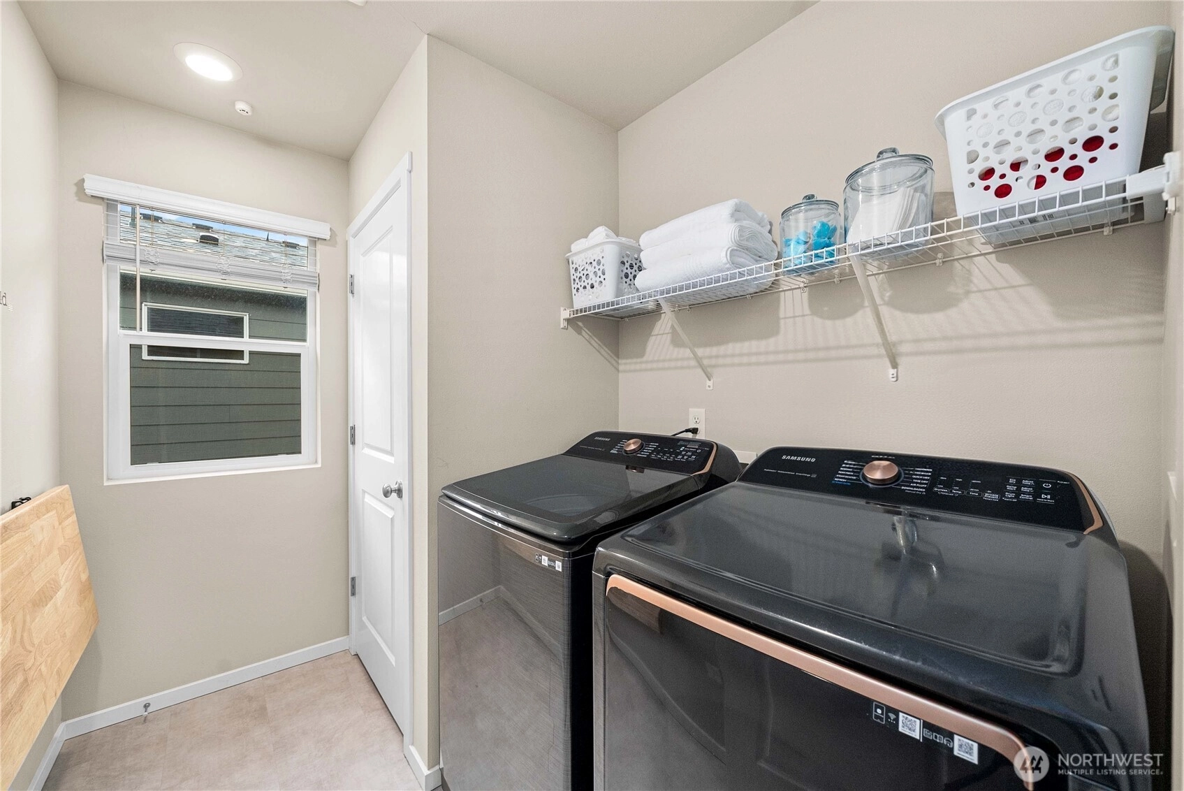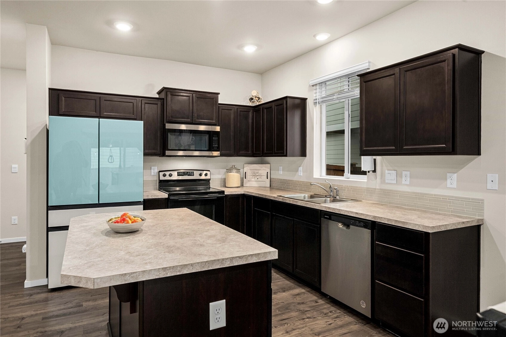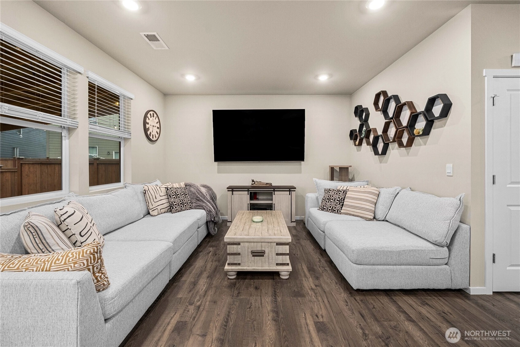 Tucked into a quiet cul-de-sac within the Rainier Ridge community, this better-than-new 2023-built home offers modern comfort, thoughtful design, & everyday convenience. Enjoy quick access to Meridian (Hwy 161)—the area’s main corridor for shopping, dining, groceries & daily services—while coming home to a peaceful residential setting. Main level features an open-concept great room w/ tall ceilings, ideal for entertaining and daily living. Kitchen offers a large center island with eating bar, coffee bar, pantry and sliding glass doors leading to a fully covered patio for seamless indoor/outdoor living. All three bedrooms located upstairs, providing privacy and separation from main living areas. Primary suite includes a walk-in closet and en-suite bath, while two additional bedrooms share a second full bathroom. Upstairs bonus living area offers flexible space for lounging, media or work-from-home needs—perfect second living space. Upstairs utility room includes washer, dryer and drop-down folding station. Outside, enjoy a low-maintenance, fully fenced yard with raised garden bed and covered patio. Easy upkeep + fully covered, entertainer-sized patio for year-round gatherings. Attached two-car garage features finished flooring and built-in storage. Located in desirable Bethel School District and close to Pierce County Airport, shopping, & dining. Better-than-new living without the wait or added costs of new construction. HOME COMES WITH 10 YEAR TRANSFERRABLE BUILDERS WARRANTY