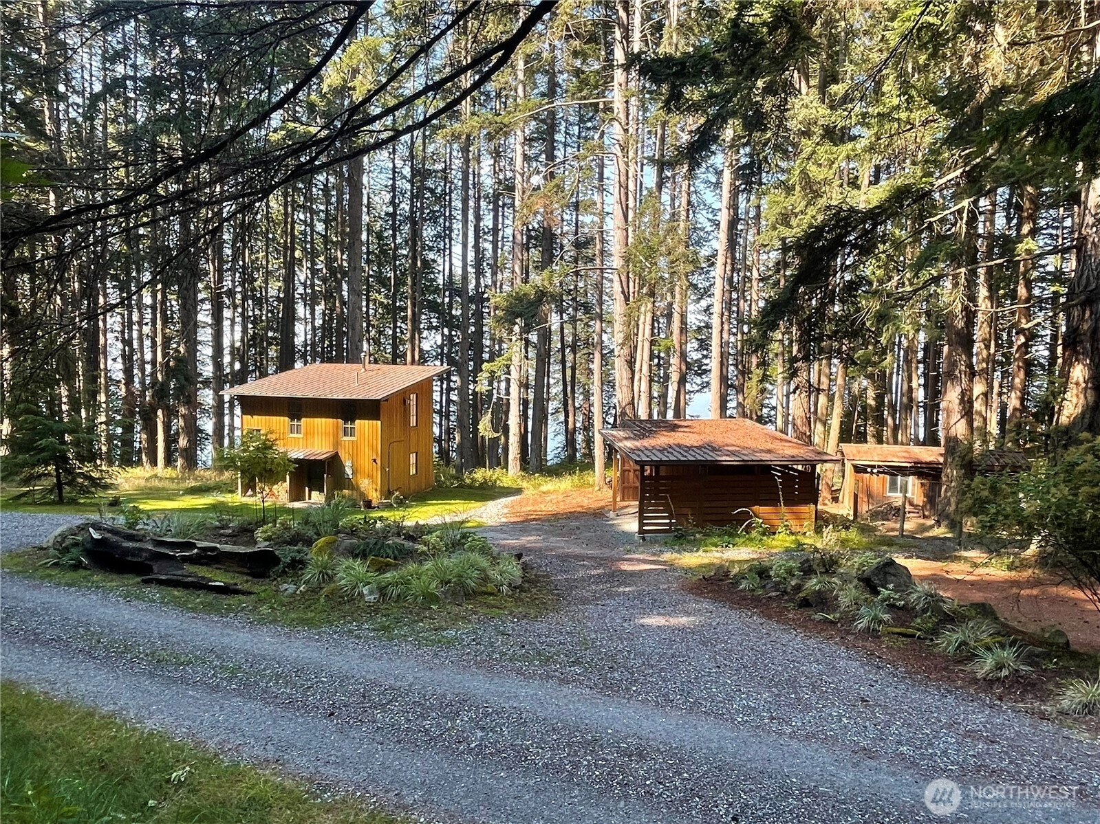 Rare 15 acres of private waterfront property and +/- 1033' of frontage facing the mainland mountains and Matia Island with the potential to create 3 lots. Mature forest, seasonal stream w/ a waterfall and meandering shoreline paths set the stage for your island retreat just 15 minutes from Eastsound. Two existing cabins each w/ 2 bedrms/1 bath & full kitchens for a total of 2165 sf of living space. A main house site is cleared & the drawings are developed w/ septic installed for 7 bedrms (total) should you someday build another home. Chicken coup, kennel/dog run, carport, storage building, patio w/ fire pit, irrigated/fenced raised bed garden and level land to play. Rent one home and occupy the other or enjoy space for friends. A simple land division is approved and ready to record if buyer prefers to have two parcels at closing (10 acres and 5 acres with a house on each lot).