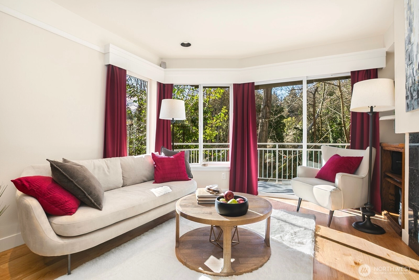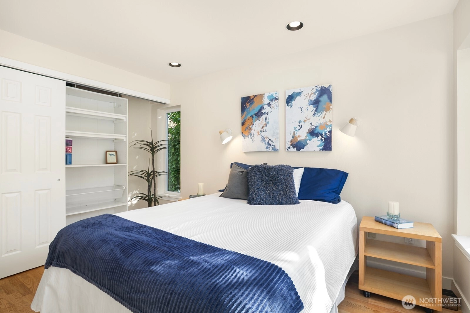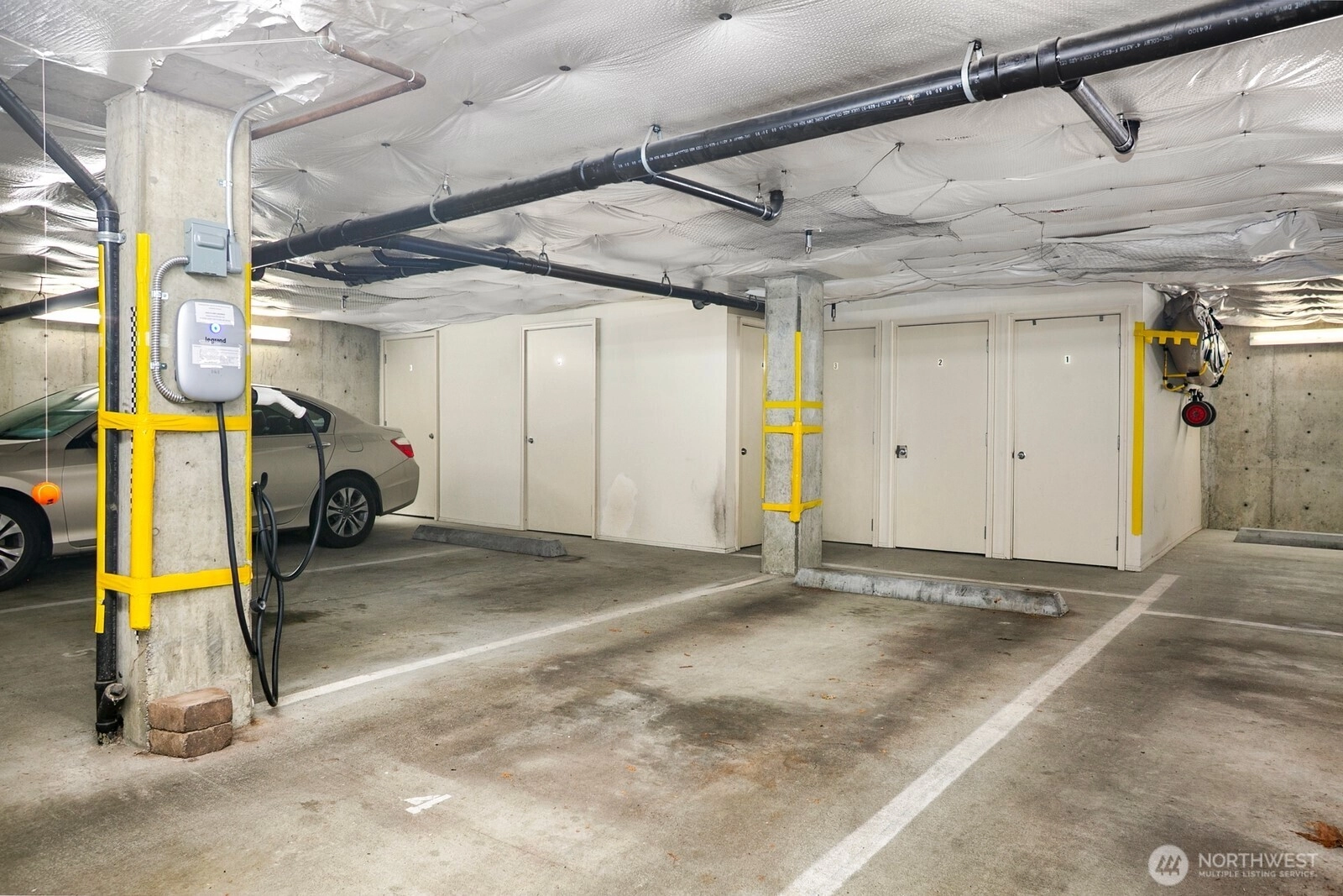 A rare blend of privacy, natural light, and unbeatable location await in this boutique 10-unit building tucked beside a lush 17-acre greenbelt, just moments from magnificent Discovery Park and the Ballard Locks. This exceptionally functional two-bedroom layout features ensuite bathrooms for both bedrooms—perfect for guests or shared living. Each bedroom is generously sized and offers double closets for outstanding storage. Every window enjoys a serene outlook with no direct neighbors in sight. Step onto your covered balcony by the private, tranquil backdrop of the protected greenbelt. The updated kitchen showcases new cabinetry and a premium Fisher & Paykel drawer dishwasher. Hardwood floors flow throughout the spacious living and dining area, filled with natural light and anchored by a cozy gas fireplace. Additional highlights include abundant in-unit storage, a dedicated storage unit, secure parking with EV charger. Ground-floor access has an exterior ramp and elevator access to the garage for added ease. Low HOA dues, a well-run association, and a brand-new roof complete this turnkey opportunity.Experience the very best of Magnolia living—immersed in nature, yet minutes from downtown with a convenient nearby bus stop.