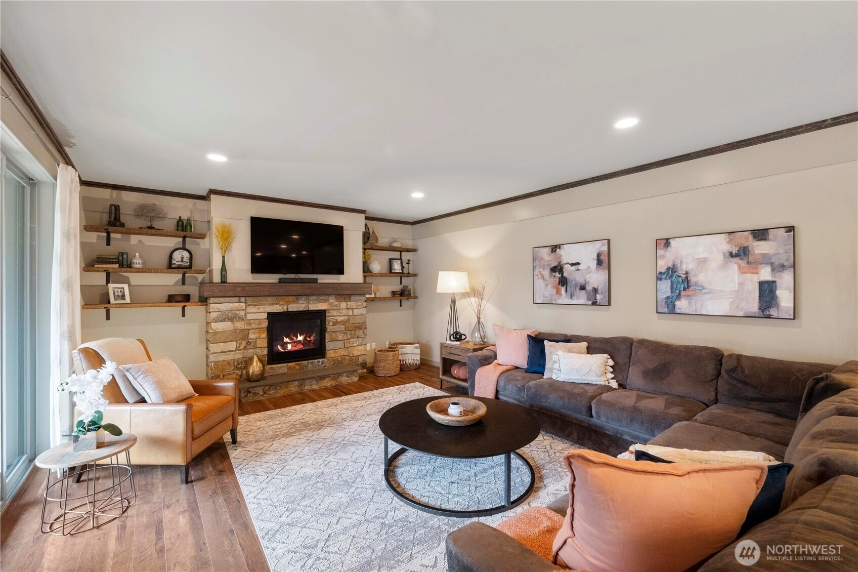 Discover refined living in the heart of Maple Valley with this breathtaking Northwest contemporary masterpiece offering over 3,500 square feet of thoughtfully curated space. Stone accents and soaring ceilings create a striking first impression, while LVP flooring flows seamlessly throughout. The chef’s kitchen is a showpiece, featuring rich two-tone wood cabinetry, gleaming quartz counters, stainless steel appliances, and an oversized island with eating bar—perfectly positioned beside the dining room and open-concept living area for effortless entertaining.Retreat to the luxurious primary suite with a spa-inspired ensuite boasting a separate soaking tub, oversized shower, and an expansive walk-in closet with custom organizational cabinetry. Three additional bedrooms and 2.5 beautifully appointed baths provide flexibility and comfort. A dedicated den showcases an impressive built-in shelving system with sliding barn doors, while the bonus room—currently a home theater—offers endless possibilities. Custom hallway shelving and air conditioning enhance everyday comfort. Step outside to a covered patio with an inviting outdoor fireplace overlooking a low-maintenance turf backyard—beautifully green year-round and designed for effortless enjoyment.