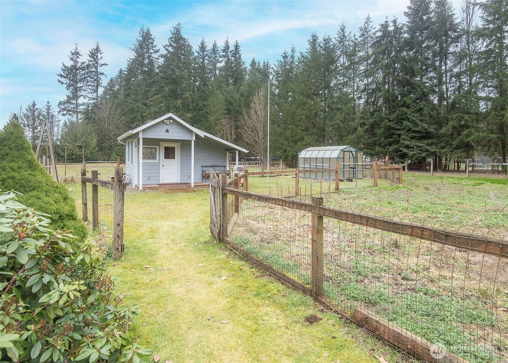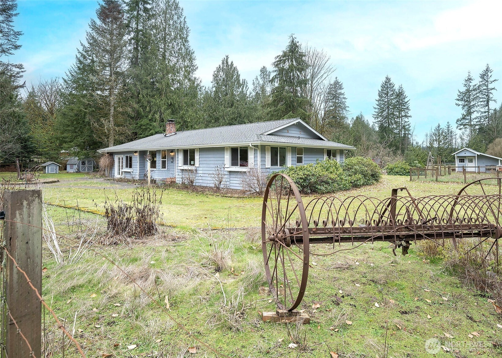 Welcome to this bright and inviting one-level home, featuring a remodeled kitchen with a farmhouse sink, modern finishes, and abundant natural light. The home offers three bedrooms, including a primary suite with a 3/4 bath, a full bath for guests, and a convenient 1/2 bath in the multi-purpose room, ideal for hobbies, an office, or extra entertaining space. Set on 5 acres of fully fenced, level land, this property is perfect for hobby farming, equestrian pursuits, or small livestock. Enjoy a 5-stall barn with tack room, a chicken coop/chicken hotel, greenhouse, utility/potting shed, and generous garden space for growing your own vegetables or flowers. A detached shop offers endless possibilities for woodworking, mechanics, or other creative projects. This is the perfect space for hands-on hobbies or storage. Step outside and wander the property, discovering unique yard art made from vintage farm equipment and collectibles, adding charm and character that make this home truly special. Inside, the wood-burning fireplace adds warmth and charm, while the covered deck with string lights creates an inviting outdoor space for entertaining friends. With ample room for animals, gardens, and outdoor hobbies, this property combines modern comfort with classic country lifestyle.