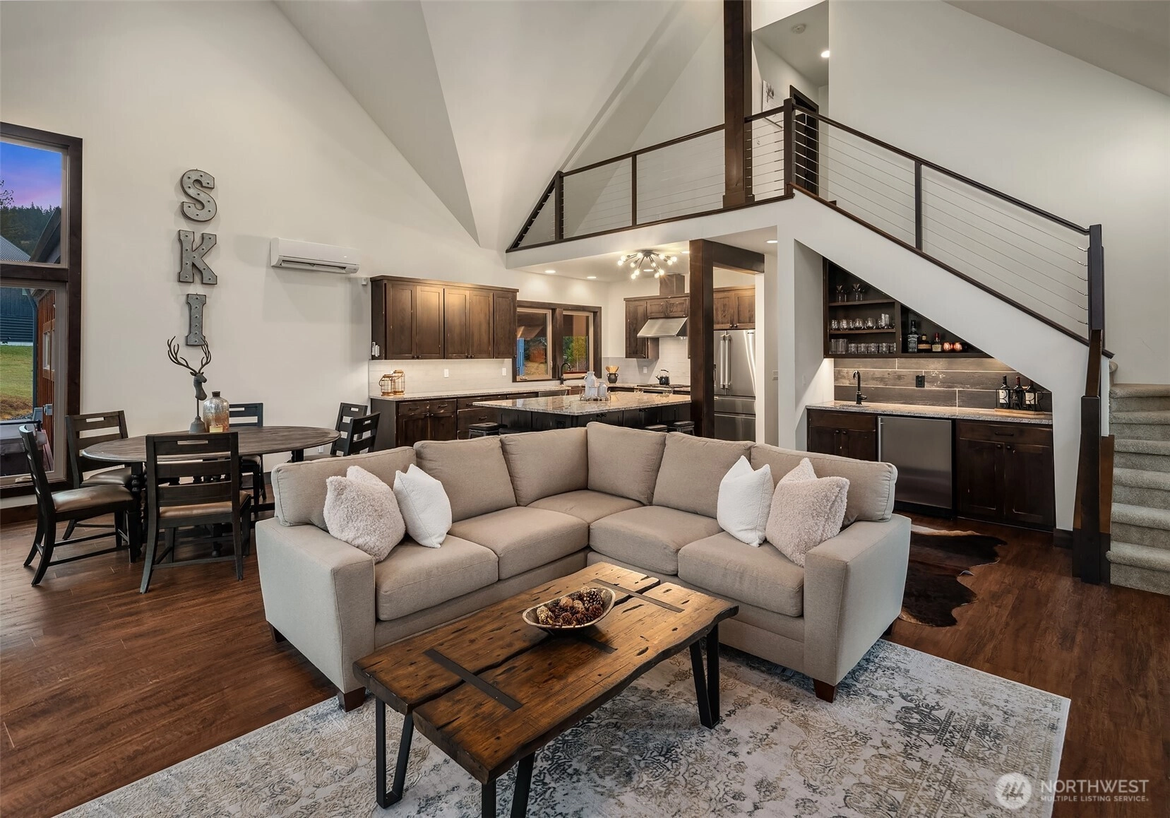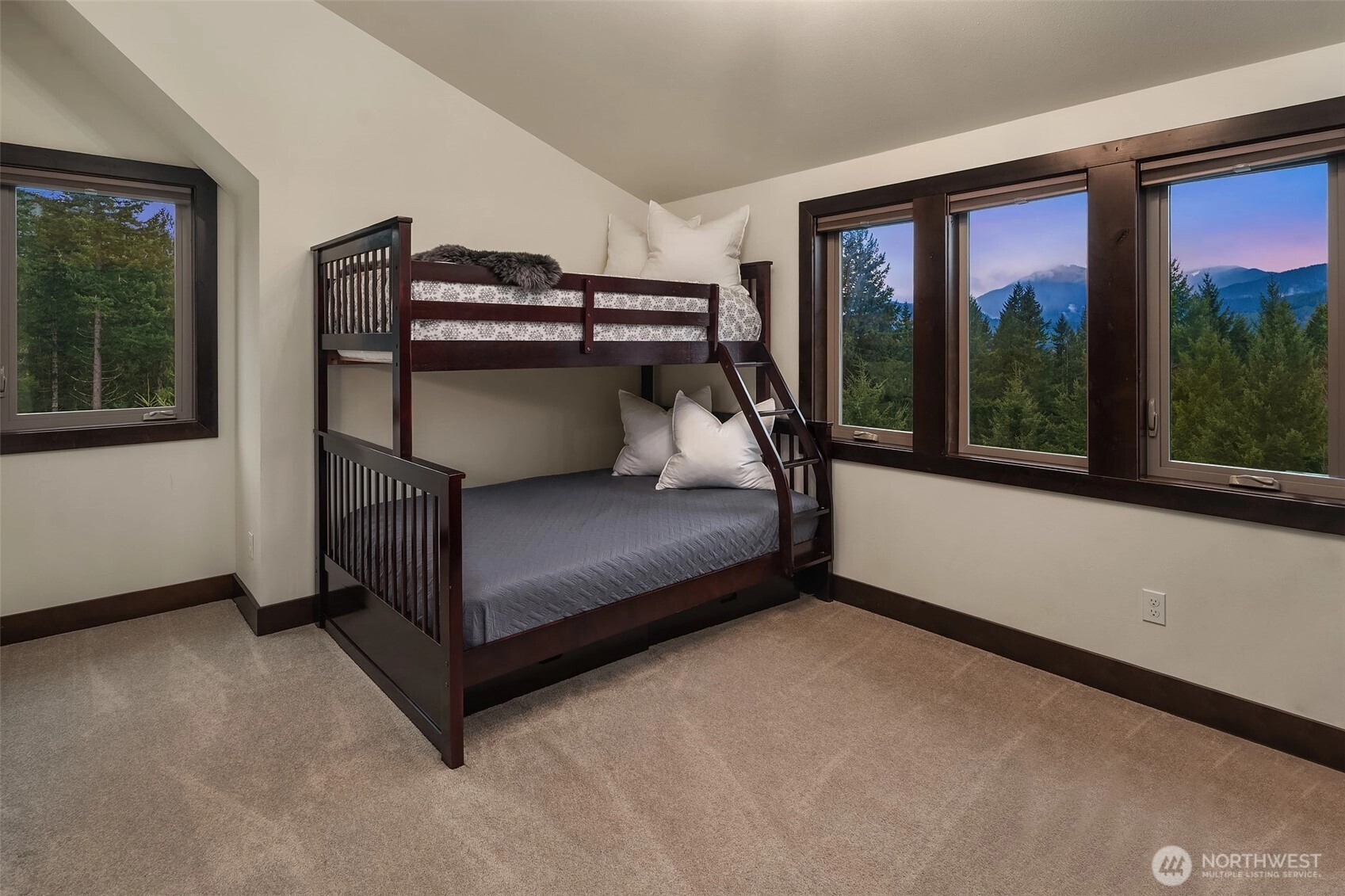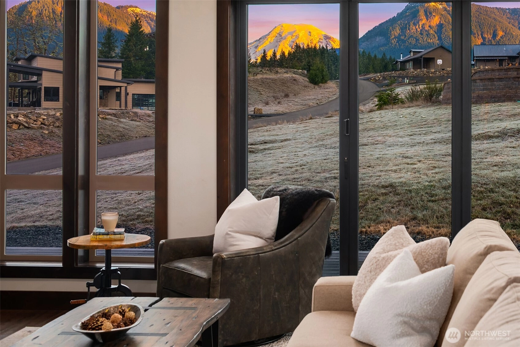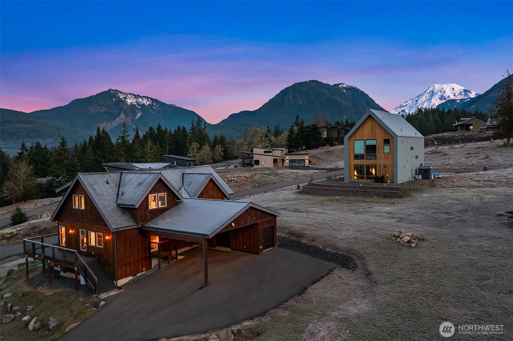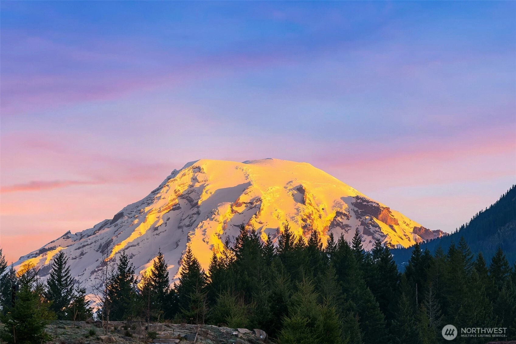 Welcome to Hideaway, Packwood’s premier gated neighborhood with arguably the best Mt. Rainier view in town. Sitting proudly on a shy half-acre is this stunning 2019 chalet. It features a NanaWall of glass facing the spectacular Mt. Rainier view, creating a seamless indoor-outdoor flow on to the composite low-maintenance wrap-around deck. The main level open-concept great room showcases a floor-to-ceiling fireplace that warms the room with the flip of a switch. The kitchen is equipped with a Dacor gas range and matching stainless-steel appliances. A hammered apron-front copper sink serves as a striking focal point, pairing beautifully with the granite countertops. Don’t miss the wet bar with wine fridge and matching hammered copper sink. The primary suite offers another gas fireplace and a 5-piece bath with clawfoot tub. Upstairs, you’ll love the bunk room with west-facing Cowlitz River Valley views. The third bedroom is adjoined by another full bath. The exterior is clad in cedar shake and stained board and batten siding, establishing a timeless aesthetic. The freshly paved asphalt drive welcomes you to the attached two vehicle carport with a beautiful tongue and groove ceiling and a convenient sizeable storage room for your recreational gear. Less than a mile from the shopping, dining, and entertainment of Packwood’s town center and 25 minutes from White Pass and Mt. Rainier National Park, this durable and timeless chalet is offered furnished for your immediate enjoyment.