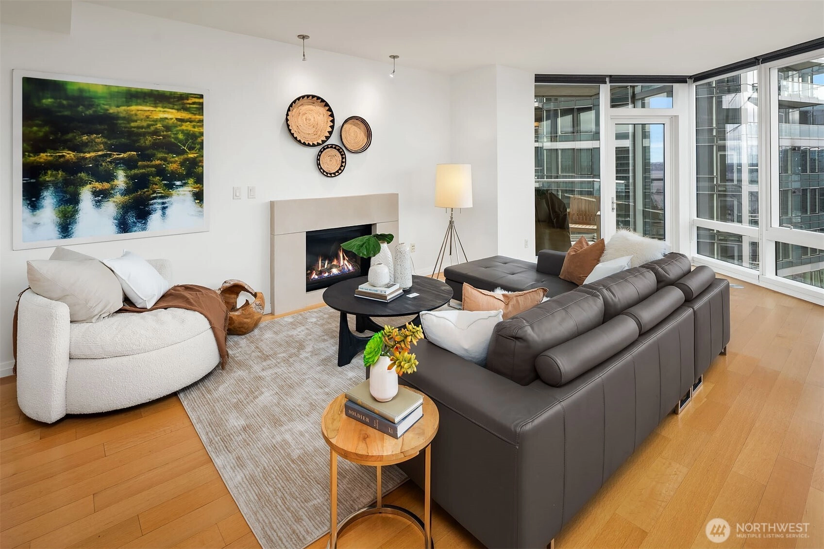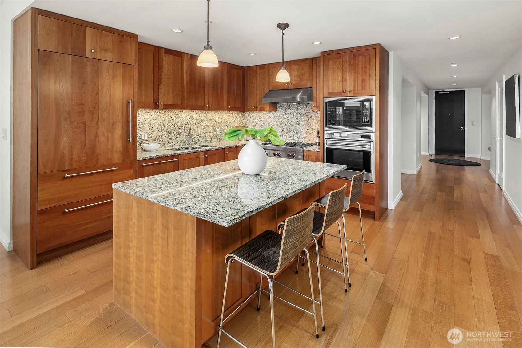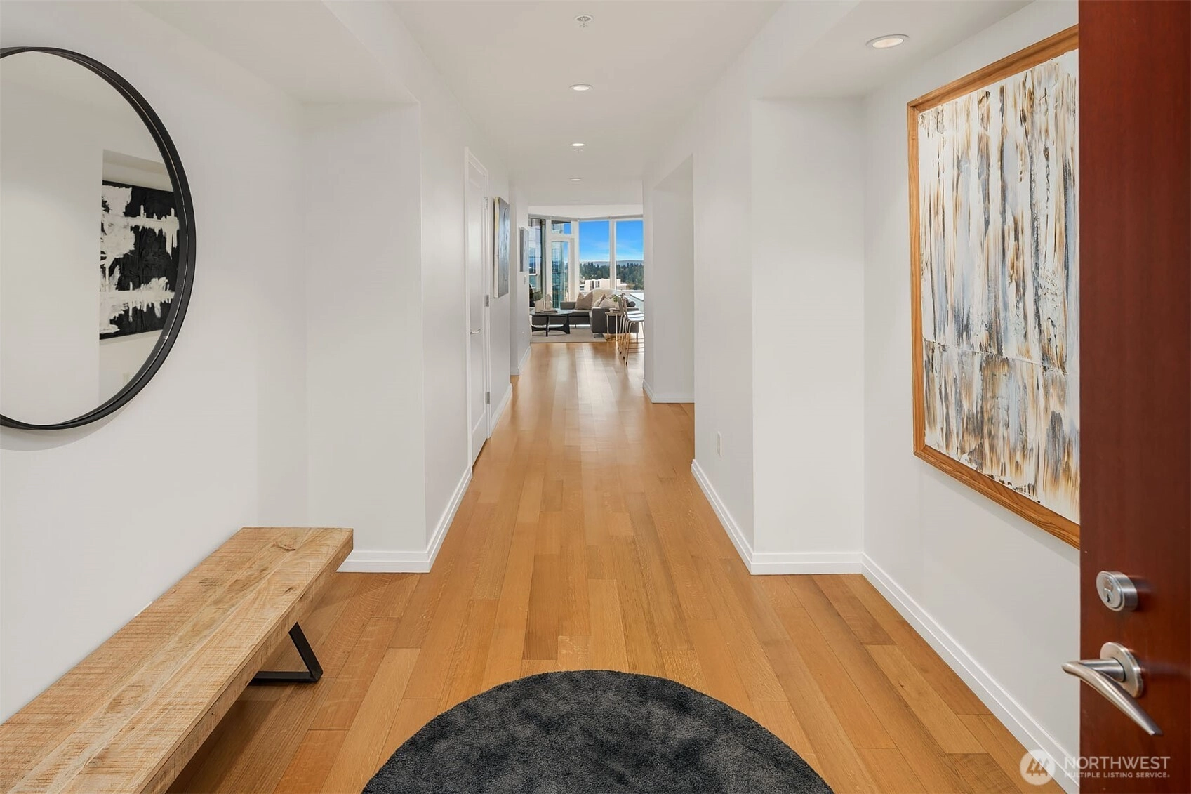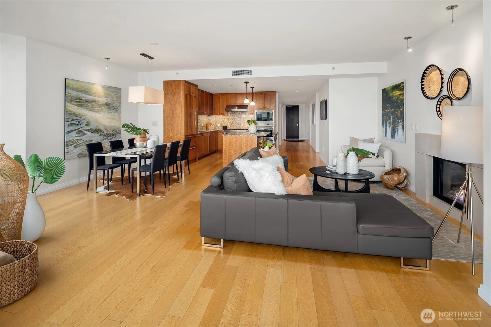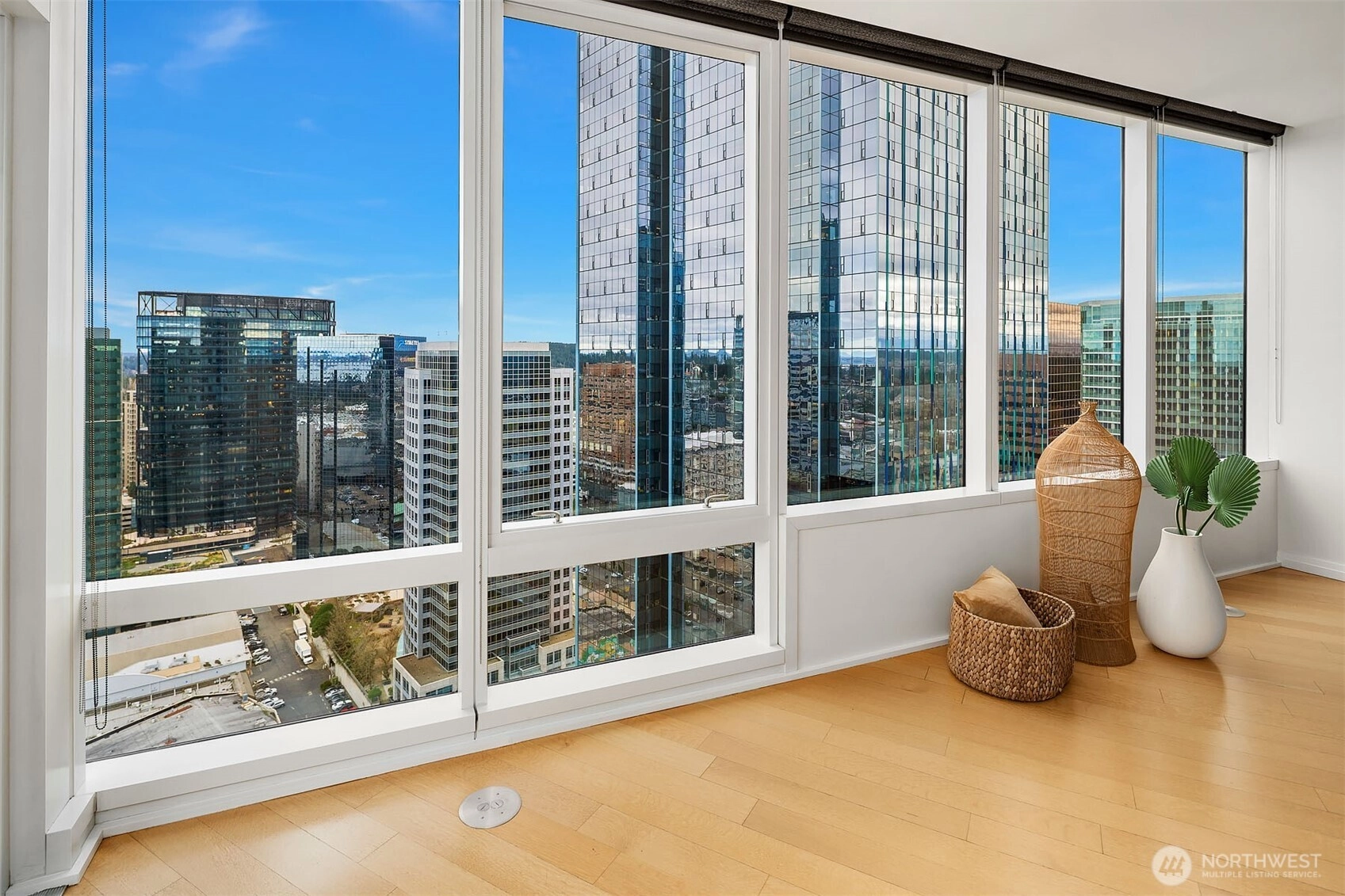 Experience elevated downtown living in this expansive residence at Bellevue Towers. Home 3406 welcomes you with a gracious gallery entry that opens to lake, city, and territorial views. The thoughtfully designed island kitchen features cherry stile-and-rail cabinetry, slab stone countertops, and premium Sub-Zero/Wolf appliances, great for everyday living and entertaining alike. The spacious great room is anchored by a gas fireplace and flows seamlessly to a private balcony complete with gas for grilling. A large family room plus an additional home office with custom built-ins offer exceptional flexibility for work and relaxation. Additional highlights include 9' ceilings, an oversized laundry room, and abundant storage. 2 side-by-side parking spaces and garage storage are also included. LEED Gold–certified Bellevue Towers offers recently remodeled amenities including state-of-the-art fitness rooms, whirlpool spa with sauna and steam room, dining room with kitchen, community and game rooms, theater, outdoor terraces, a half-acre park, and 24/7 concierge. All of downtown Bellevue is at your doorstep including world-class shopping, dining, and the Bellevue Downtown Park, making this a truly exceptional place to call home.