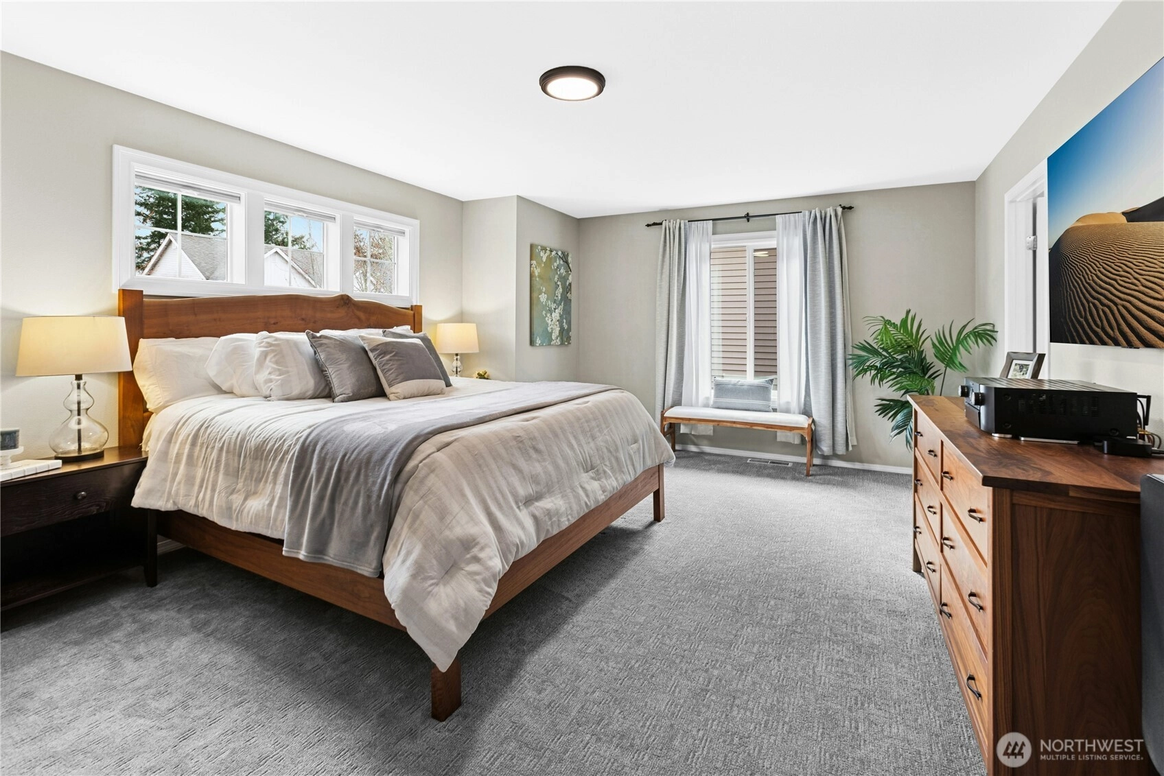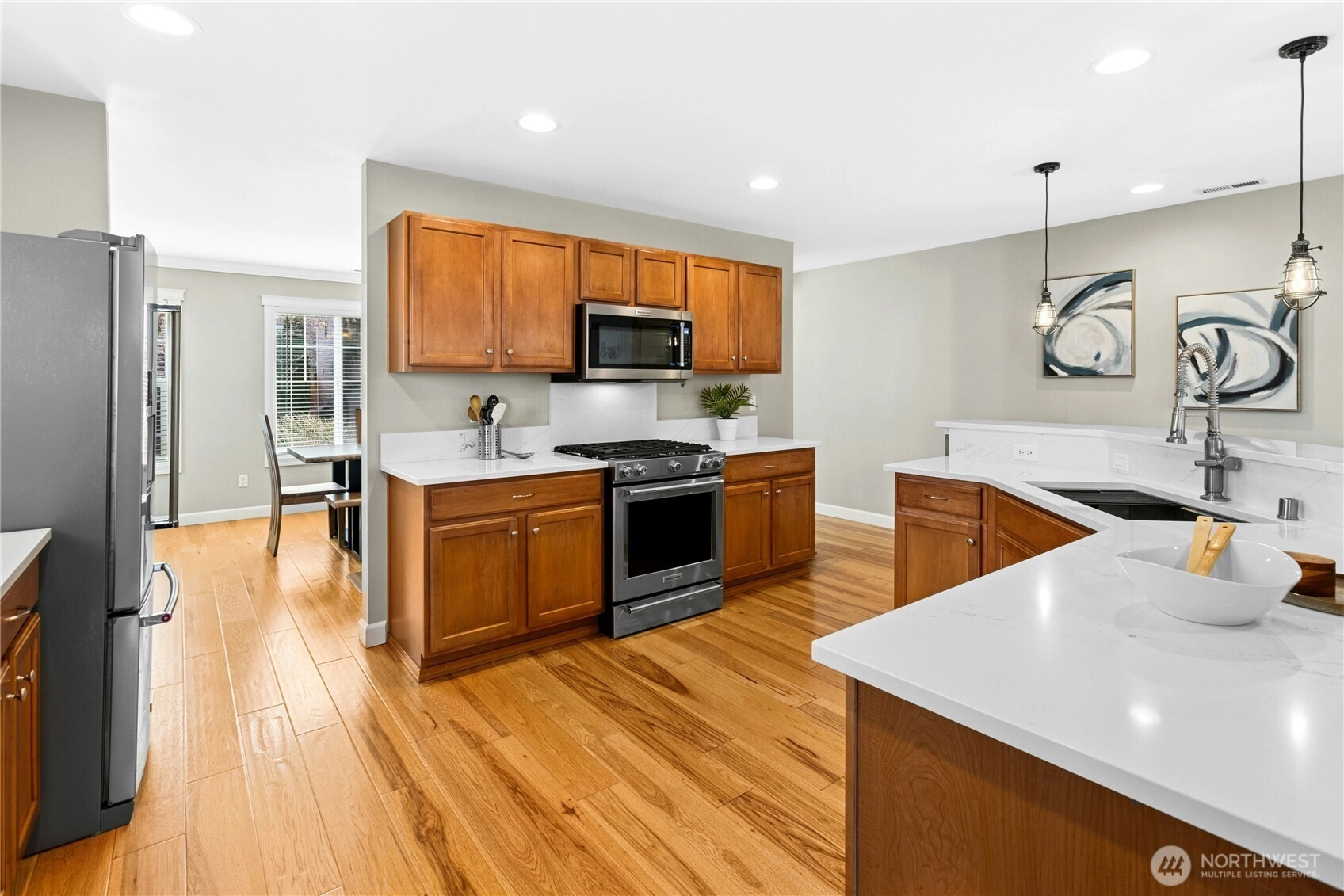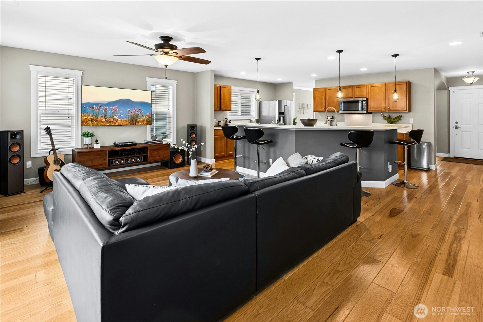 Come discover this move-in ready gem in the quiet, desirable Deer Park neighborhood, a short stroll from Swenson Park. From the moment you step inside, you’ll appreciate the warm, functional layout and beautiful engineered hardwood flooring. The kitchen is centrally located on the main floor, adjacent to the spacious dining room with abundant natural light. The kitchen features newer quartz countertops and stainless steel KitchenAid appliances, a breakfast bar, abundant wood cabinetry, and a large, walk-in pantry. The family room is open to the kitchen and has a sliding glass door leading to the great outdoors. Upstairs you will find 3 comfortable bedrooms, 2 full baths, laundry, plus a versatile bonus room, ideal for a home office, playroom, or flex space. The generous primary suite is inviting and provides a peaceful retreat with a generous walk-in closet and a private en suite bath with dual sinks and tile flooring. Recent home updates include newer: carpet, washer and dryer, water heater, furnace, and central air conditioning! The home is thoughtfully wired with ethernet in every room for today’s connected lifestyle. Step outside to enjoy a large patio and an expansive, flat backyard—ideal for relaxing, play, pets, or gatherings. The 3-car tandem garage offers ample storage, is EV-level2 ready, and includes a generator hookup. Ideally located near parks, trails, a golf course, schools, shopping, and with easy access to I-90, this well-maintained home checks all the boxes!