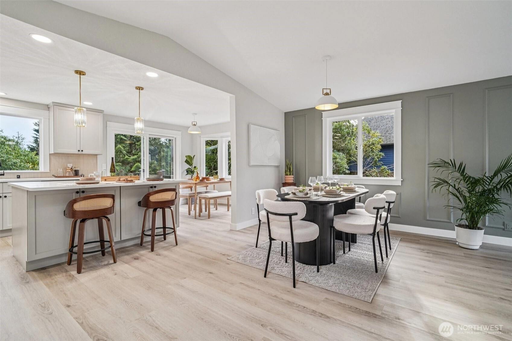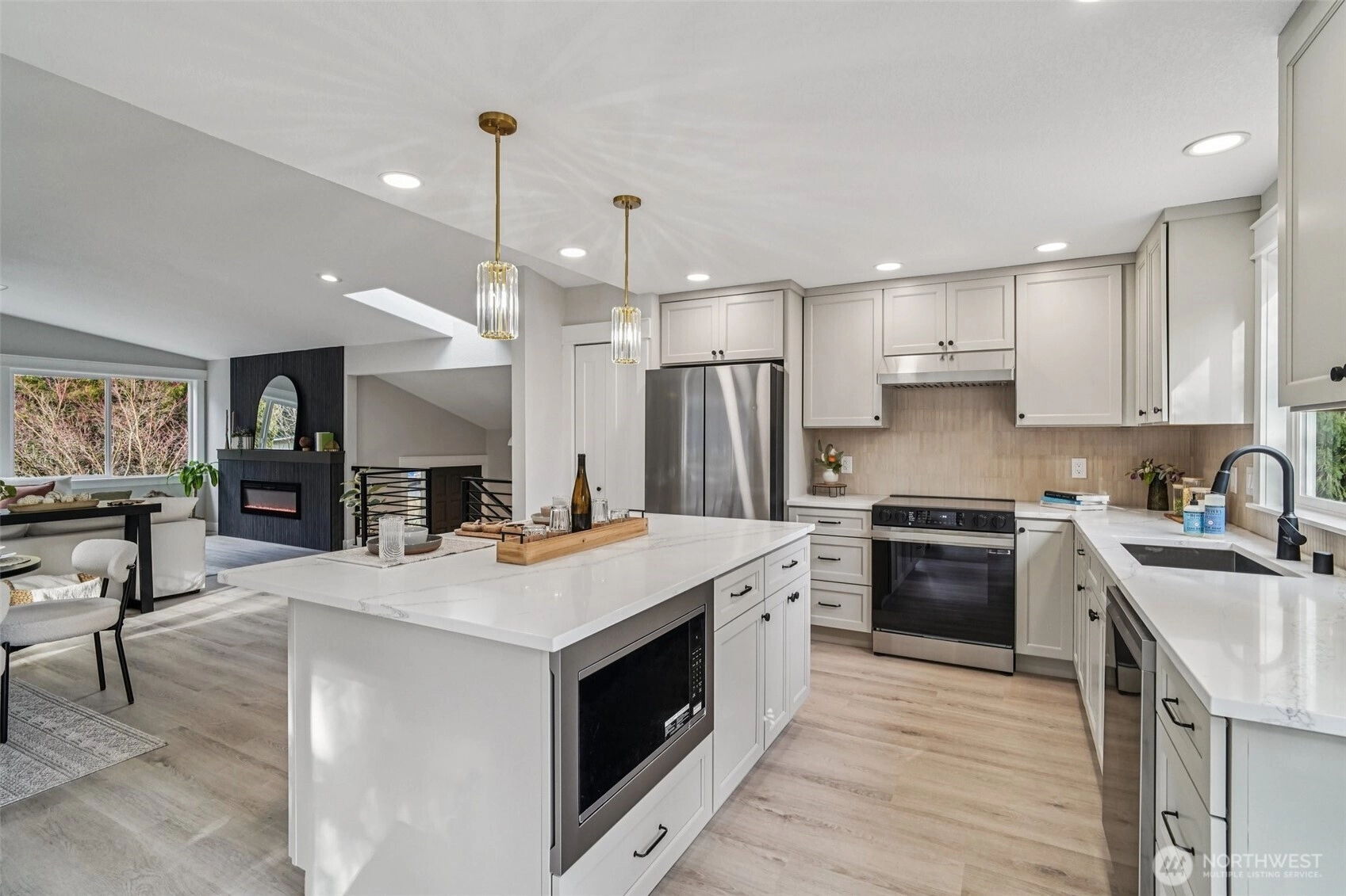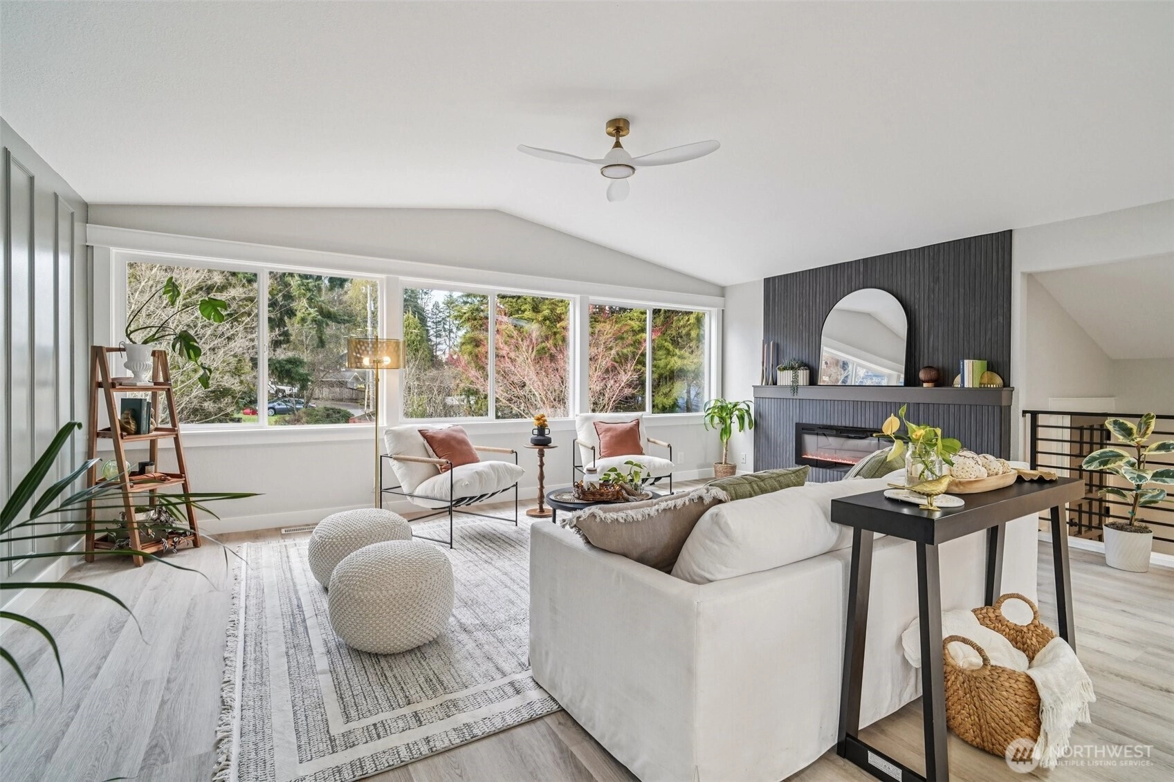21620 84th Pl W, Edmonds, WA: Nestled on a lush 18,730 sq ft lot in a quiet Edmonds setting, this beautifully updated 4-bedroom, 2.5-bath home offers the perfect blend of privacy, natural light, and functional living. The highly desirable layout features 3 bedrooms on one level, including a spacious primary suite with walk-in closet & ensuite bath. The main living level showcases vaulted ceilings, expansive picture windows, and abundant natural light, creating a warm and inviting atmosphere. A cozy fireplace anchors the living room, which flows seamlessly into the open dining area—ideal for hosting gatherings of 8-10+ guests. The kitchen offers generous prep space, ample cabinetry, and a sunny breakfast nook overlooking the tranquil backyard. Step outside to a large entertainment deck and experience a truly special outdoor setting. The expansive yard features mature landscaping, play space, storage, and even trails, offering a rare park-like environment with future DADU potential (buyer to verify). Every window captures peaceful greenery that evolves beautifully with the seasons.The lower level provides excellent flexibility with a bonus room that could also function as a 4th bed, along with a full laundry room and convenient powder bath. An attached two bay garage plus generous driveway parking adds everyday convenience. Freshly planted lawn, pre-inspection available, and move-in ready. This Edmonds home delivers privacy, space, and versatility—minutes from parks, amenities.