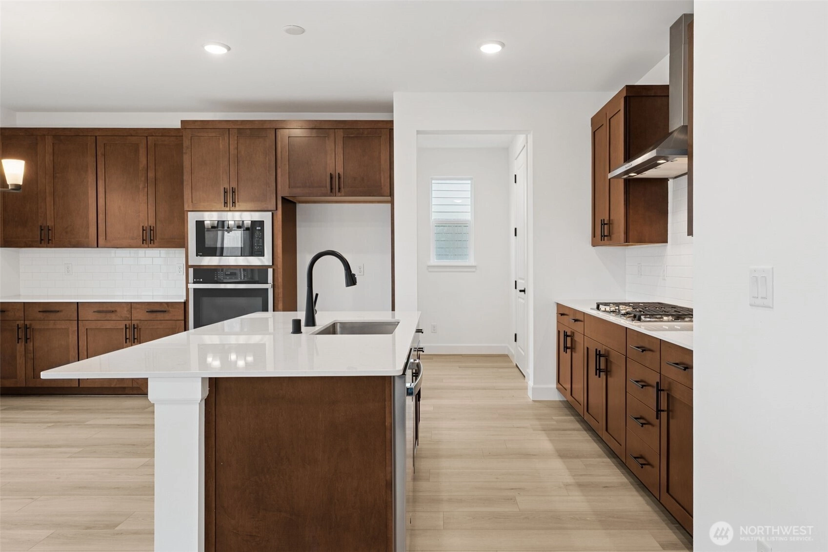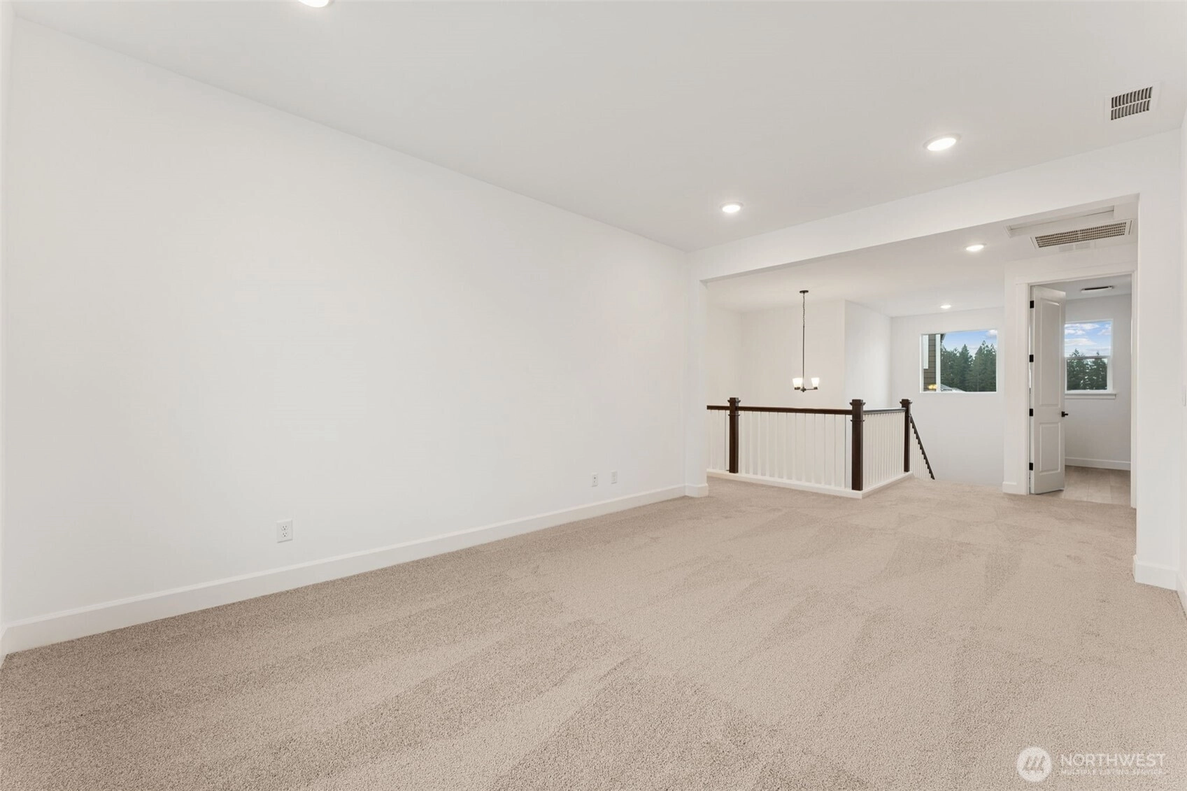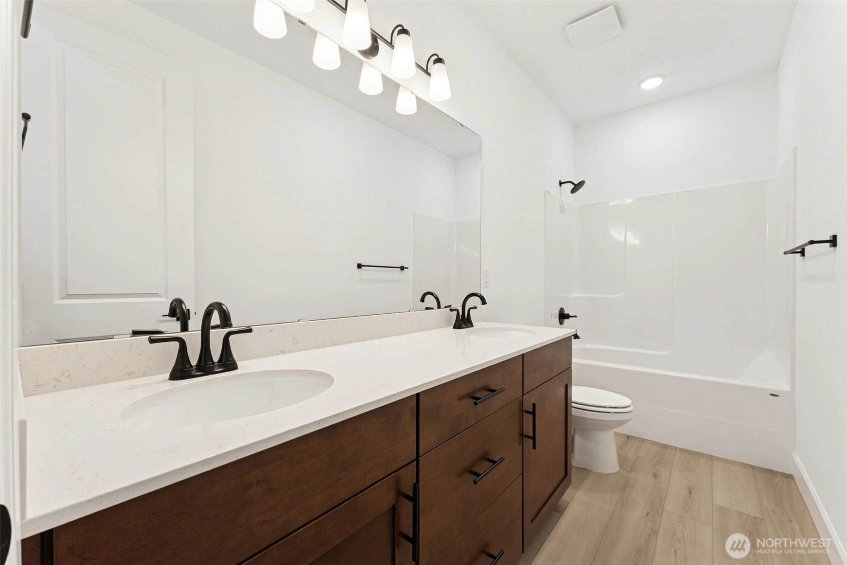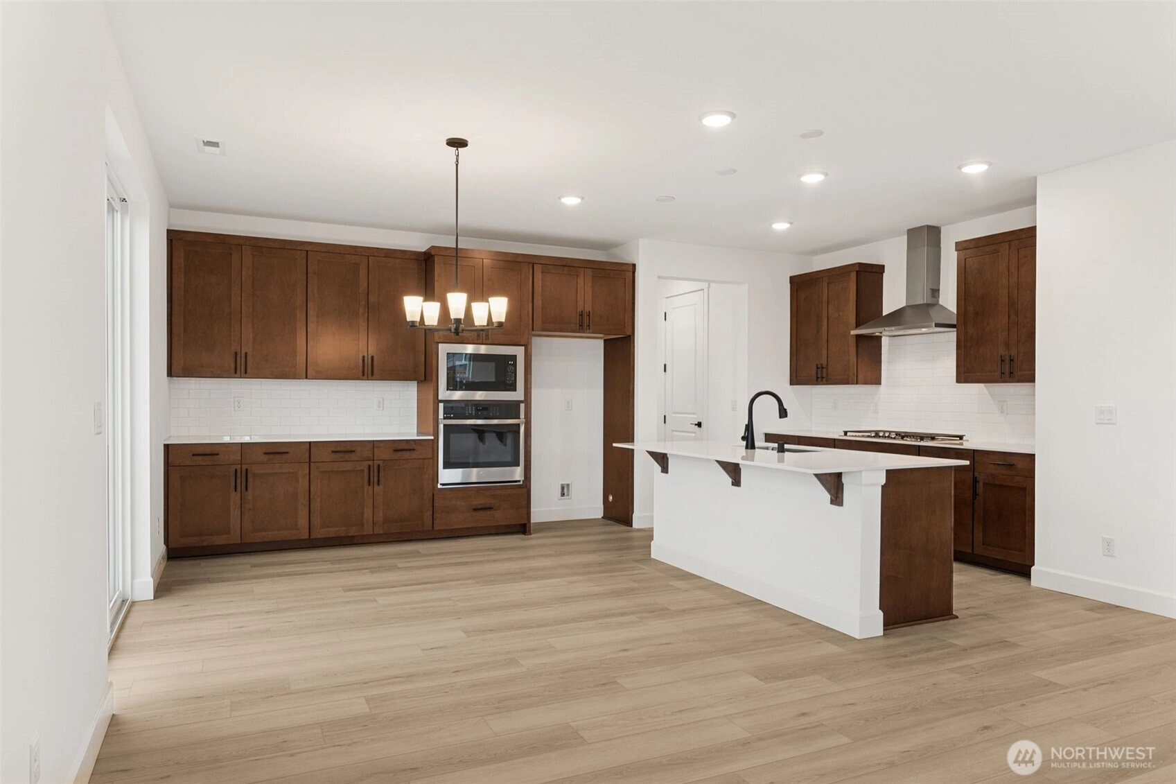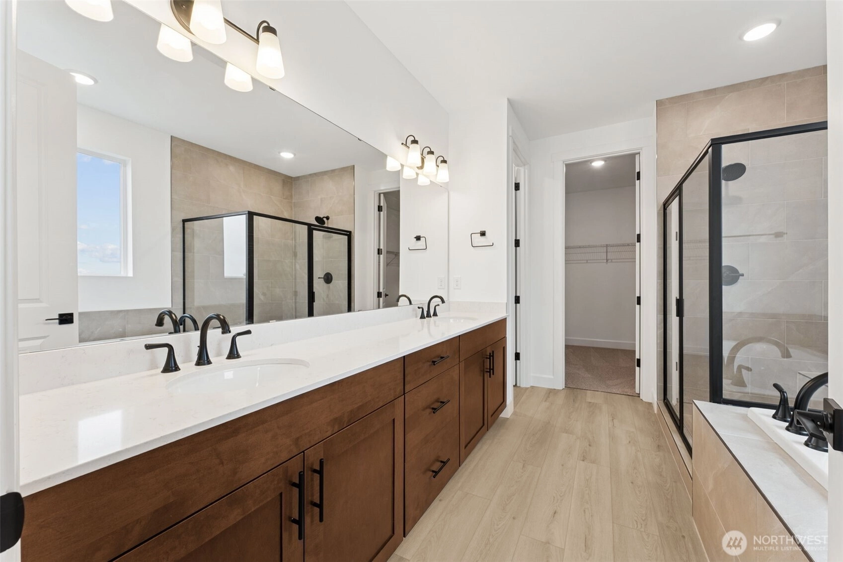 Near the top of the community this contemporary style Coronado plan greets you with a dramatic high ceiling entry and views of the Cascades and Seattle skyline from both floors. The main floor of this inviting home offers an open layout with a spacious great room, kitchen with quartz counters, and walk in pantry. Before leaving the main floor you will also find an additional bedroom and three quarter bathroom. Upstairs is a versatile loft and three generous bedrooms, including a lavish primary suite with an expansive walk-in closet, soaking tub, and walk-in shower. Home comes complete with a fully landscaped front yard with sprinkler system and a fully fenced backyard. Central air conditioning and EV charger included. If you are working with a licensed real estate agent please register agent on your first visit to the community per our site registration policy. Ask about Special Financing!