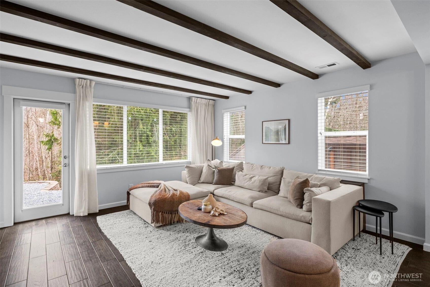 Tucked within the charming Kimball Creek community of Snoqualmie Ridge, this beautifully updated two level home blends style, comfort, and thoughtful design. Custom wood beams and designer shelving add warmth and character, complemented by rich, dark wide plank wood flooring throughout the main level.The open concept layout flows from a darling kitchen with pantry, island, breakfast bar seating, and new tile backsplash into a gracious dining area and a cozy, spacious living room with fireplace, perfect for everyday living and entertaining.Upstairs, the primary suite overlooks the peaceful greenbelt and offers a soaking tub, separate shower, double vanity, and walk in closet. A versatile loft provides flexible space for a home office or reading nook, and the upstairs laundry room adds convenience.Additional highlights include a main level powder room, abundant storage, and a rare double deep garage with high ceilings ideal for storage, hobbies, or a home gym.The spacious backyard backs to a serene greenbelt, offering privacy and a tranquil setting. Ideally located with close proximity to parks, shops, dining, and everyday amenities.