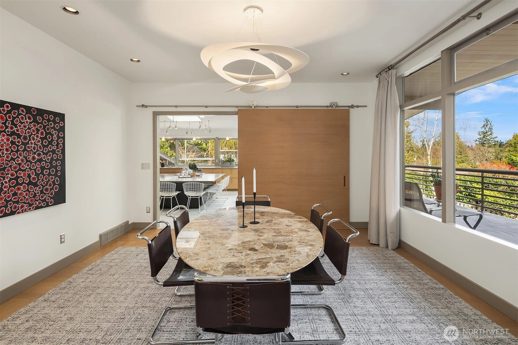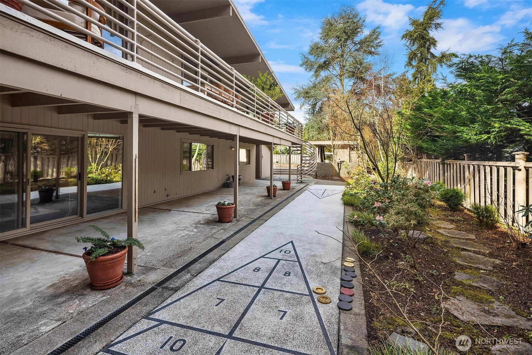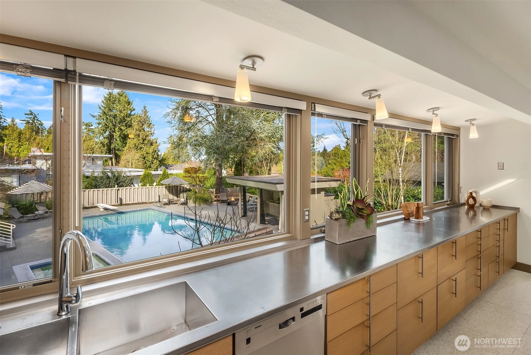 A beautiful arrival through Japanese-inspired gardens, featuring a dramatic fifteen-foot custom steel planting bed, invites you into an iconic Mid-Century Modern home inspired by the visionary legacy of Paul Hayden Kirk. Open the doors to luxurious, light-filled breadth: signature terrazzo floors, soaring walls of glass, and half acre of park-like grounds. This is a rare home where artistry defines the architecture and communion with nature is not a feature, it is the experience. Coveted ceiling heights and generous art walls create gathering rooms designed for everyday living and confident entertaining. Superbly updated while honoring its important original details. The kitchen's table-height island is a perfect nod to the thought behind every choice. Designed to invite conversation and comfort, the layout is masterful. The main floor primary suite opens to the deck with beautiful garden views and sits adjacent to the library offering a quiet retreat. Two closets and an updated 5-piece bath make it thoroughly modern. The sunny garden level is surprisingly spacious, with 4 bedrooms, a bonus/game room, and office-generous rooms to write a beautiful life story. Outside, a cabana, pool, hot tub and backyard celebrate the best of PNW living, while just across the street the protected Fairweather Preserve awaits. This is a rare diamond of esteemed PNW design with all of Medina's celebrated lifestyle convenience. Enjoy a home as beautifully special as the life you want to live!