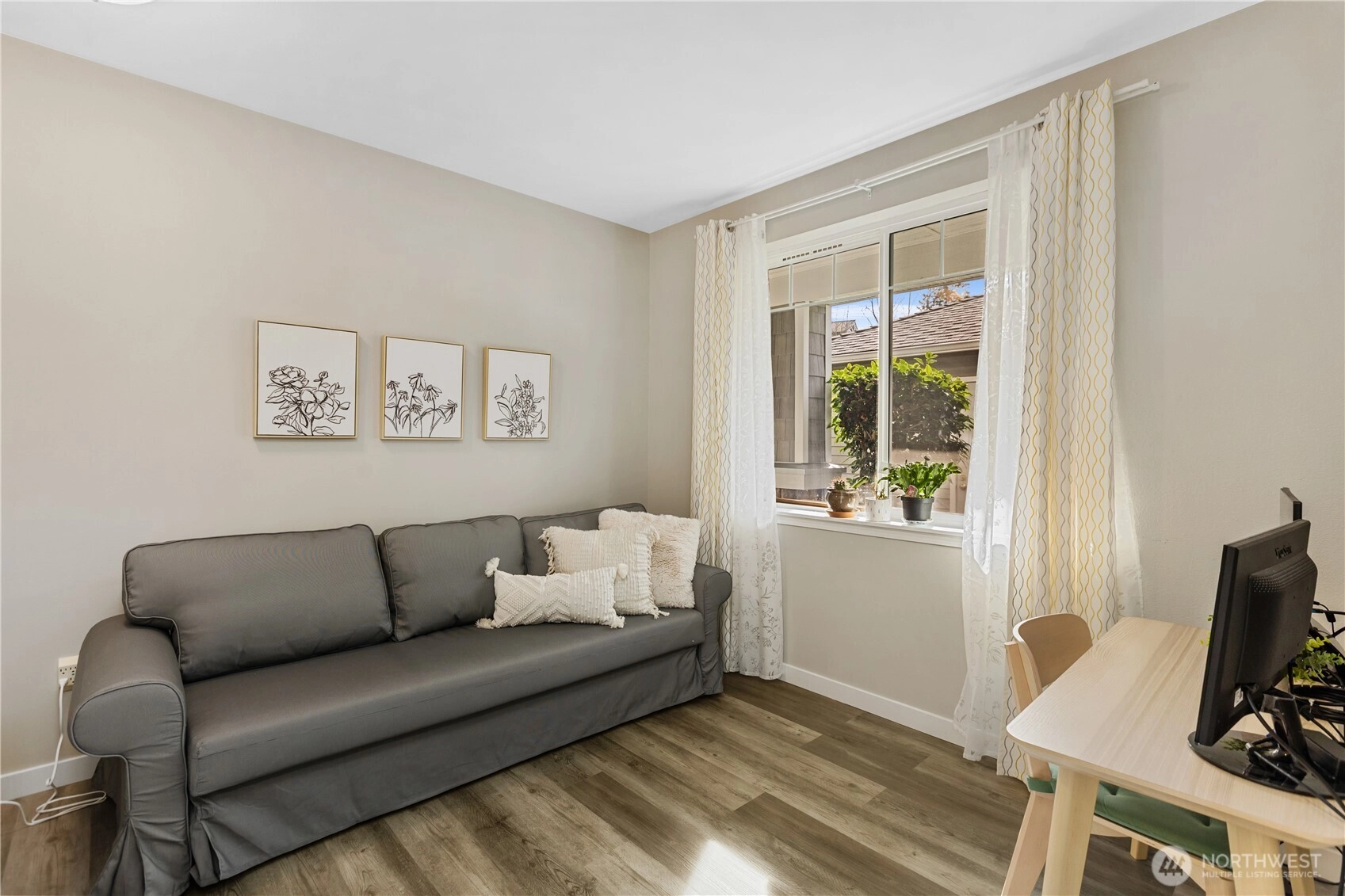Completely updated 2 bed, 1.75 bath [GROUND FLOOR] condo in the sought-after gated Woodlands community blends modern comfort with peaceful, nature-connected living. Luxury vinyl plank flooring flows throughout, complementing an open-concept kitchen with quartz countertops, an under mounted sink, bar seating, stainless steel appliances, and ample storage — all opening to a bright living area anchored by a cozy gas fireplace. The spacious primary suite is privately positioned from the second bedroom and features an ensuite bath and oversized walk-in closet. Backing to a lush greenbelt with no rear neighbors, enjoy birdsong, wildlife, and serene natural scenery from your living room or private patio. A well-managed HOA ensures low-maintenance living in a beautifully kept community. Located in the Mukilteo School District minutes from Boeing, shopping, dining, and parks — this is refined everyday living in a setting that truly feels like a retreat. NO rental cap!