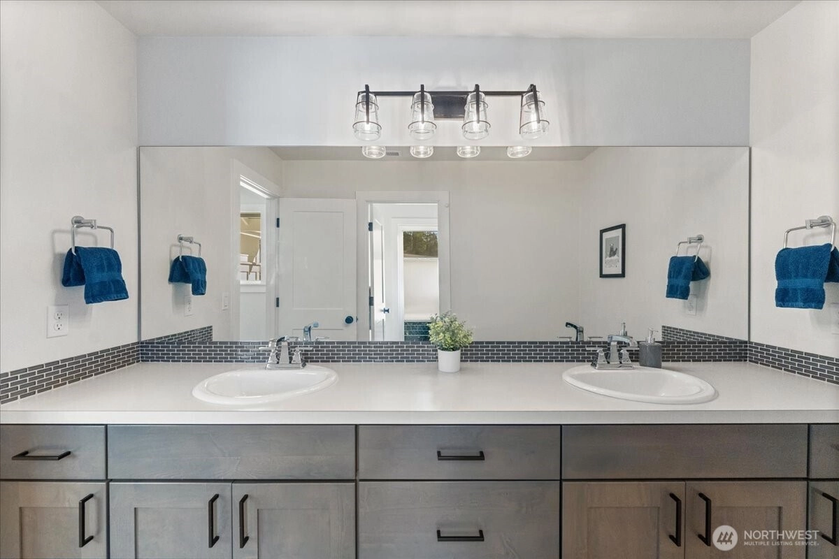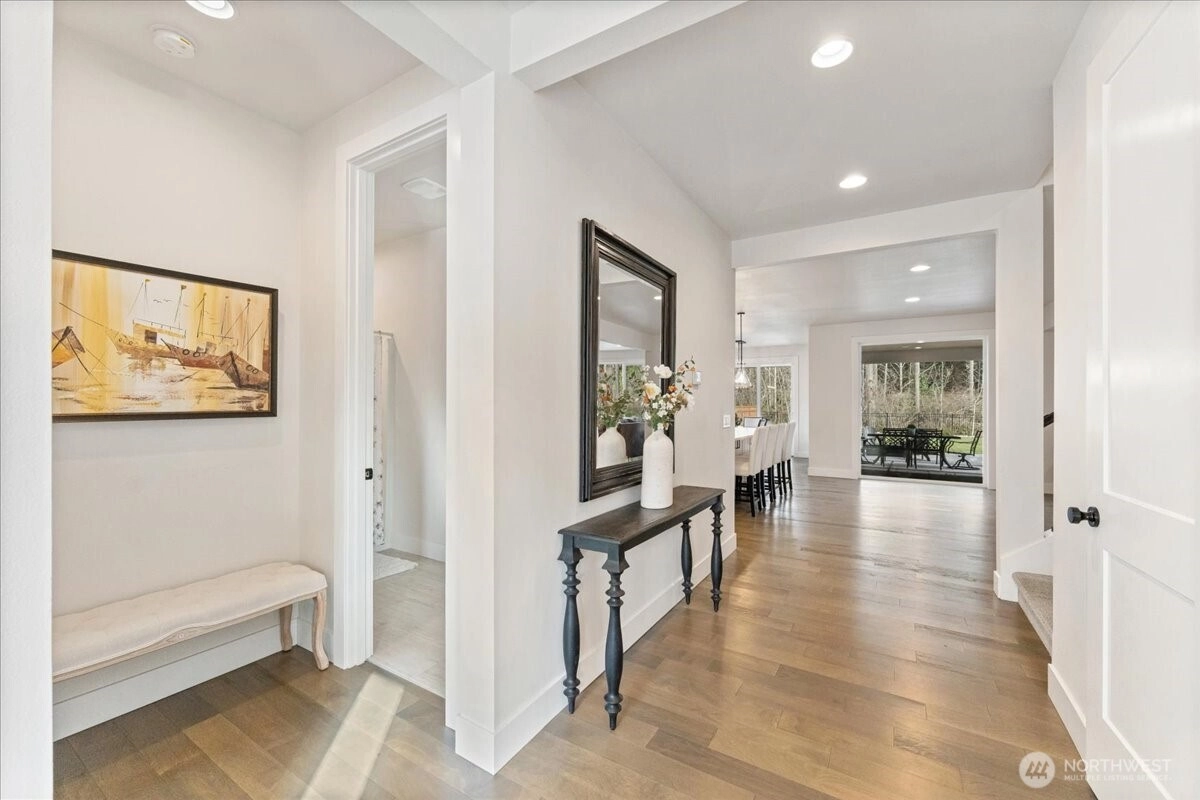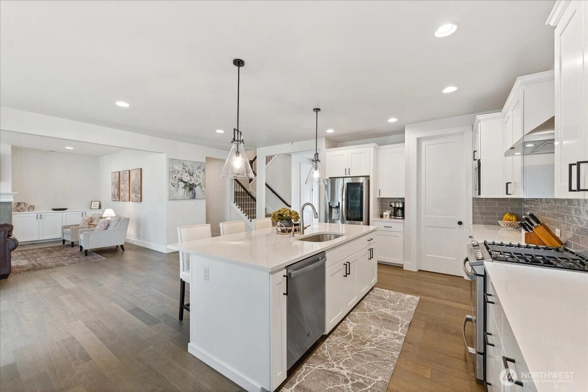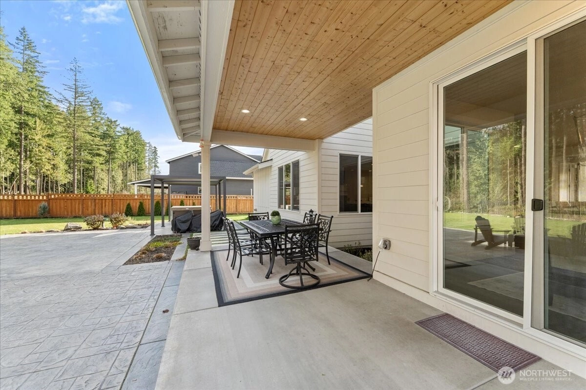 Thoughtfully designed for comfort and connection, the open-concept layout features warm engineered hardwoods, a spacious great room with gas fireplace and custom built-ins, and a gourmet kitchen with quartz countertops, custom cabinetry, stainless steel appliances, gas range, walk-in pantry, and large island with seating. A main-floor office, built-in mudroom storage, custom blinds, A/C, energy-efficient heat pump enhancer, and whole-house generator plug-in add style and function. The flexible floor plan includes a main-level bedroom with ¾ bath, ideal for guests or multi-generational living. Upstairs, a generous loft offers additional living space, while the expansive primary suite provides a spa-inspired bath and oversized walk-in closet. Step outside to a private backyard designed for year-round enjoyment. The level lot backs to serene greenbelt and features extended stamped concrete, covered patio, custom louvered pergola, 7-seat HotSpring saltwater spa, courtyard fountain, artificial turf, professional landscaping, irrigation, and full fencing for privacy. Living in Tehaleh means access to over 1,800 acres of protected open space and 40+ miles of scenic trails. Even more special, this home is grandfathered into the Sumner-Bonney Lake School District — a rare advantage. This home blends luxury finishes, thoughtful design, and exceptional outdoor living in a premier greenbelt setting.