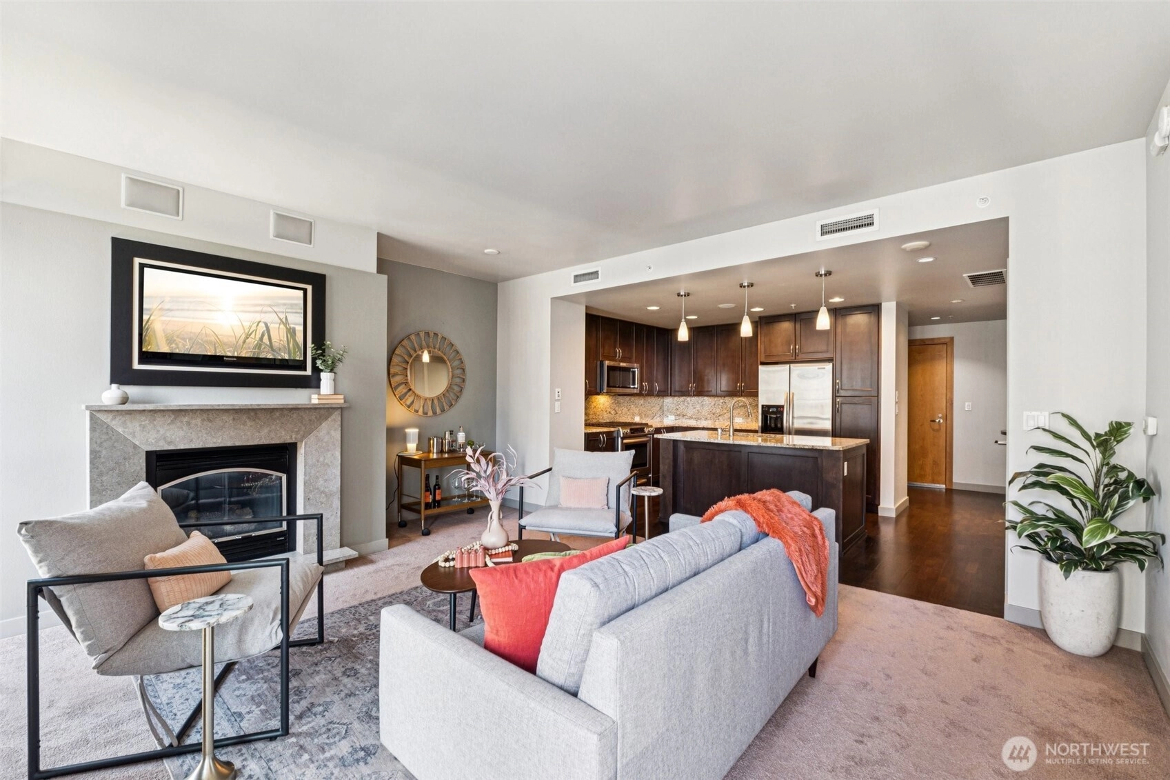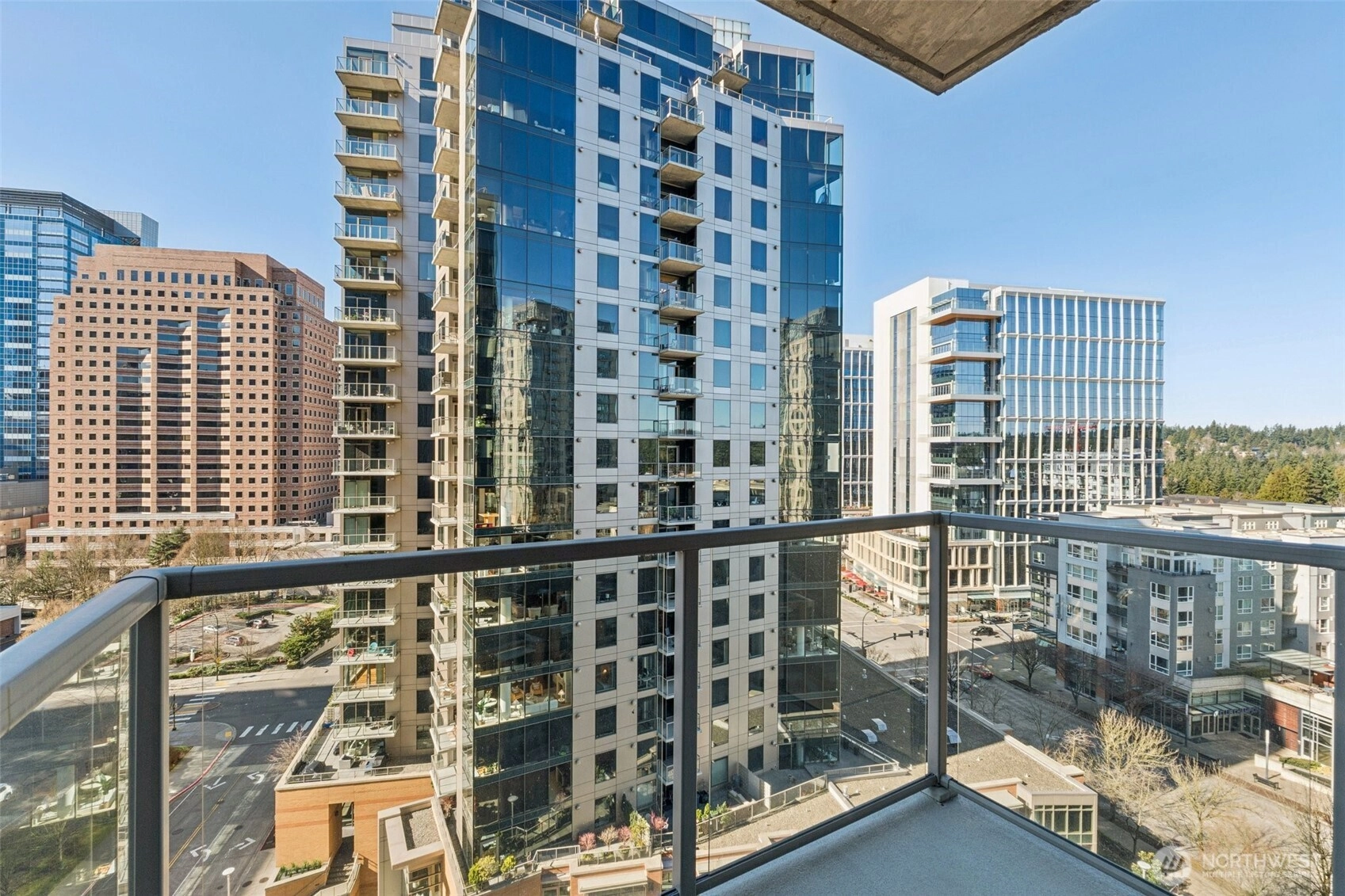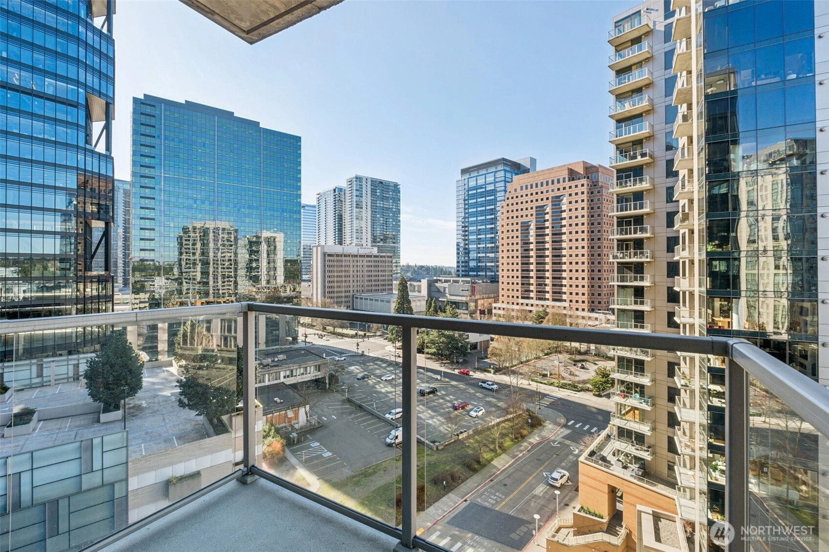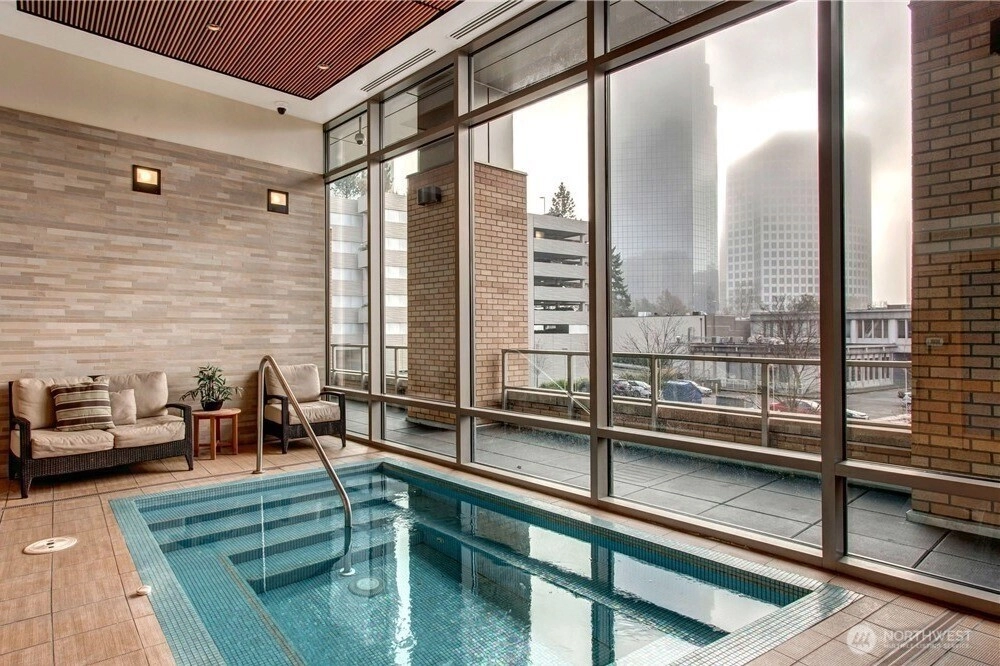 Live at the center of it all in this beautifully upgraded Downtown Bellevue residence, offering refined finishes & effortless urban comfort. A bright, open layout showcases quartz countertops & backsplash, refinished premium cabinetry & a quartz-appointed primary bath. Natural light fills the spacious living room & flows seamlessly to a sunlit patio. West facing unit has sunlight all day long! Automated shades & upgraded surround sound, while concrete & steel construction provide lasting quality. Enjoy dedicated parking, generous storage & building amenities including 24-hour concierge service, fully equipped gym, spa, locker rooms, and lounge. Perfectly positioned just moments from shopping, dining, Amazon, and the waterfront, this home delivers elevated city living at its finest. No pillars inside unit.