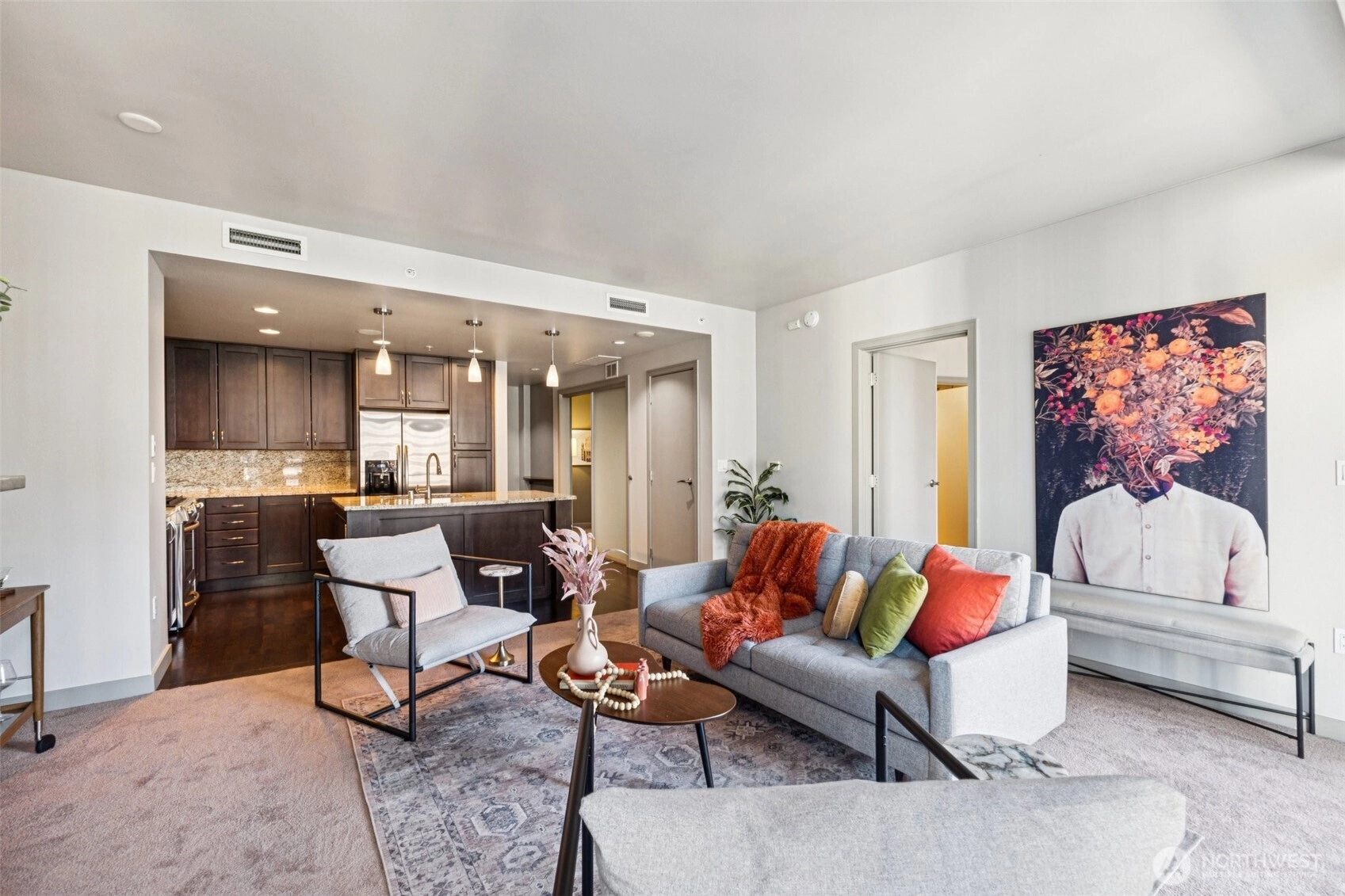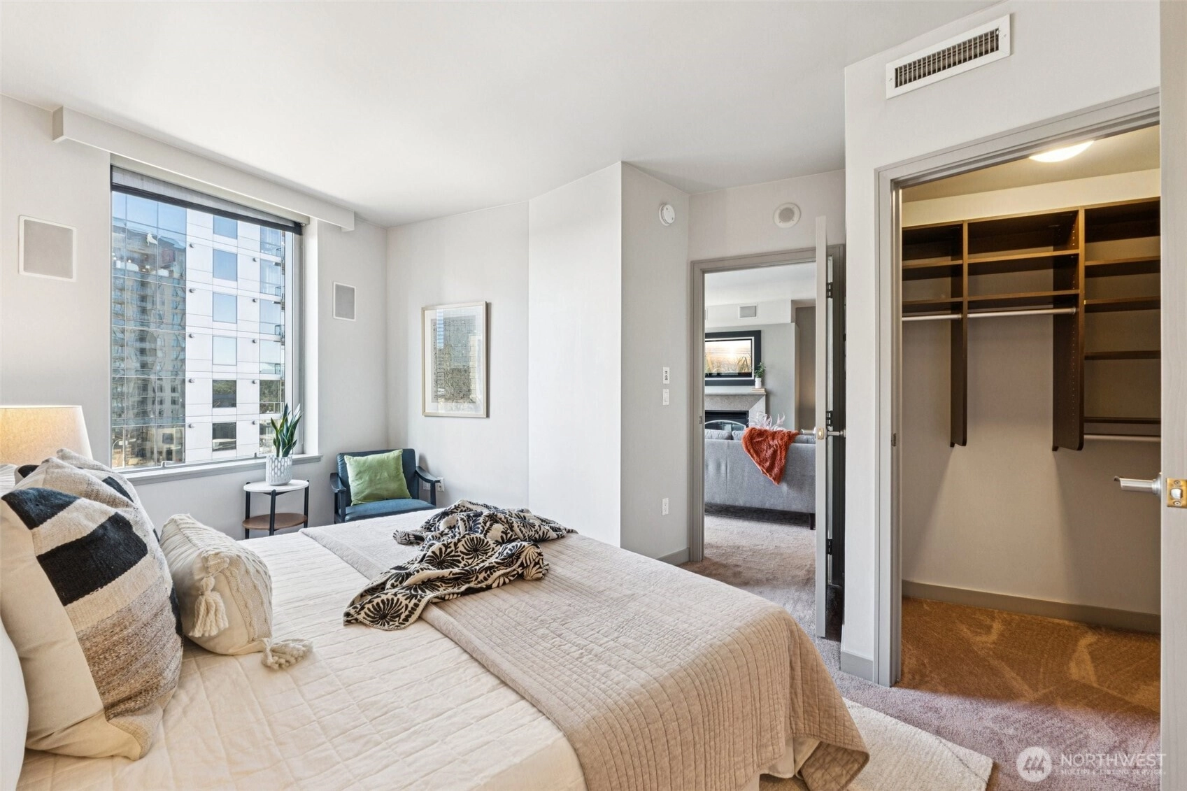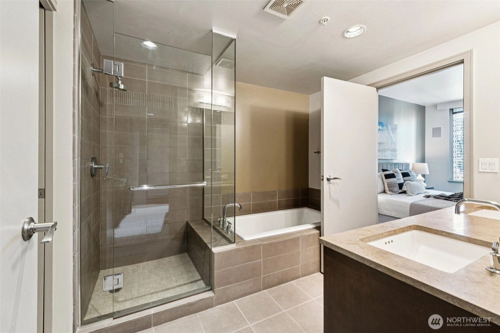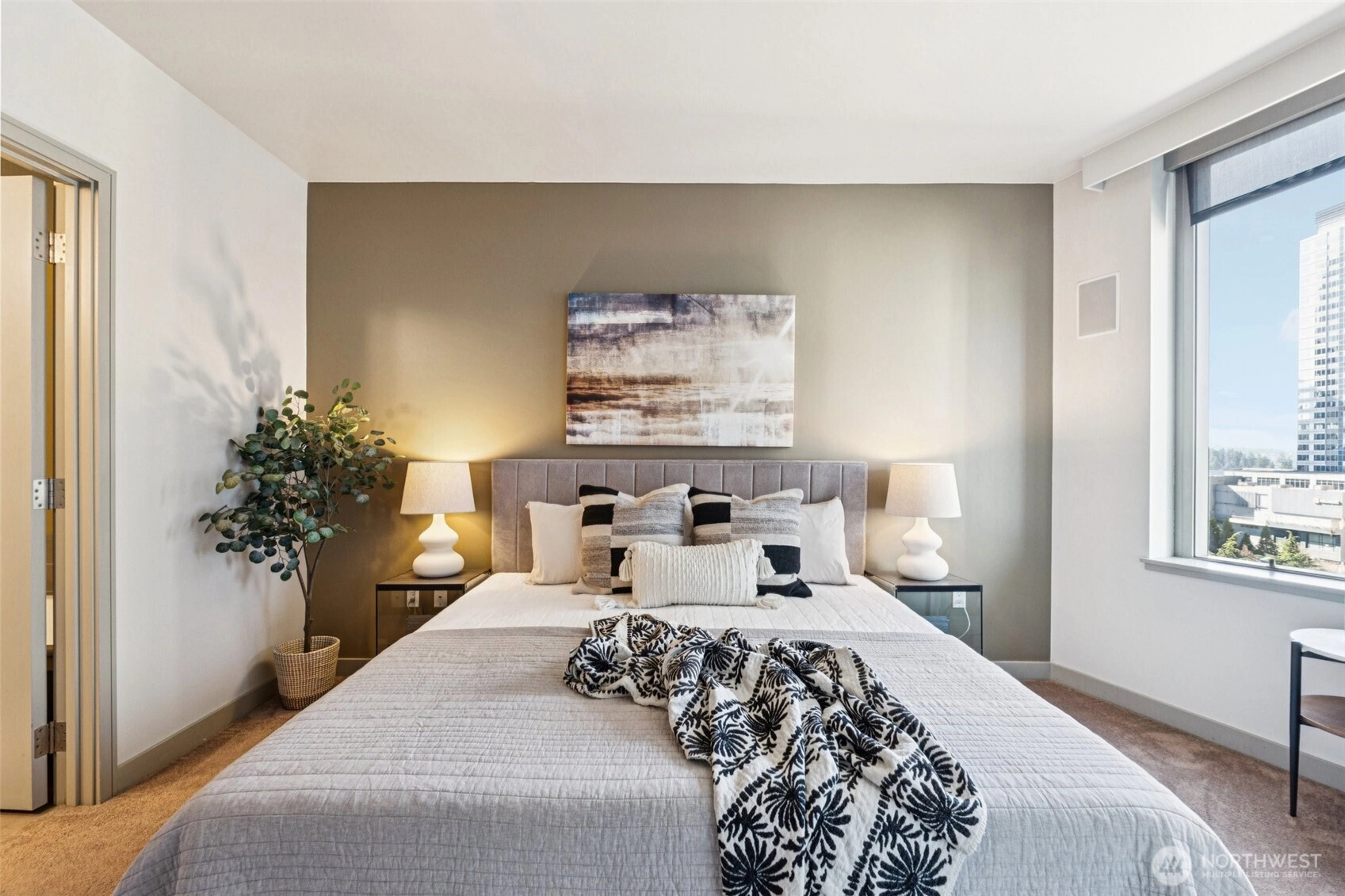 Live at the center of it all in this beautifully upgraded Downtown Bellevue residence, offering refined finishes & effortless urban comfort. A bright, open layout showcases quartz countertops & backsplash, refinished premium cabinetry & a quartz-appointed primary bath. Natural light fills the spacious living room & flows seamlessly to a sunlit patio. West facing unit has sunlight all day long! Automated shades & upgraded surround sound, while concrete & steel construction provide lasting quality. Enjoy dedicated parking, generous storage & building amenities including 24-hour concierge service, fully equipped gym, spa, locker rooms, and lounge. Perfectly positioned just moments from shopping, dining, Amazon, and the waterfront, this home delivers elevated city living at its finest. No pillars inside unit.