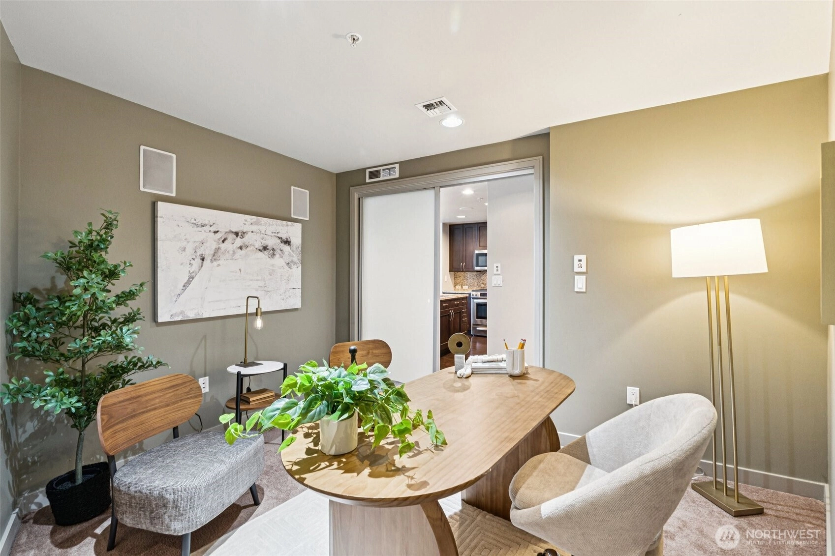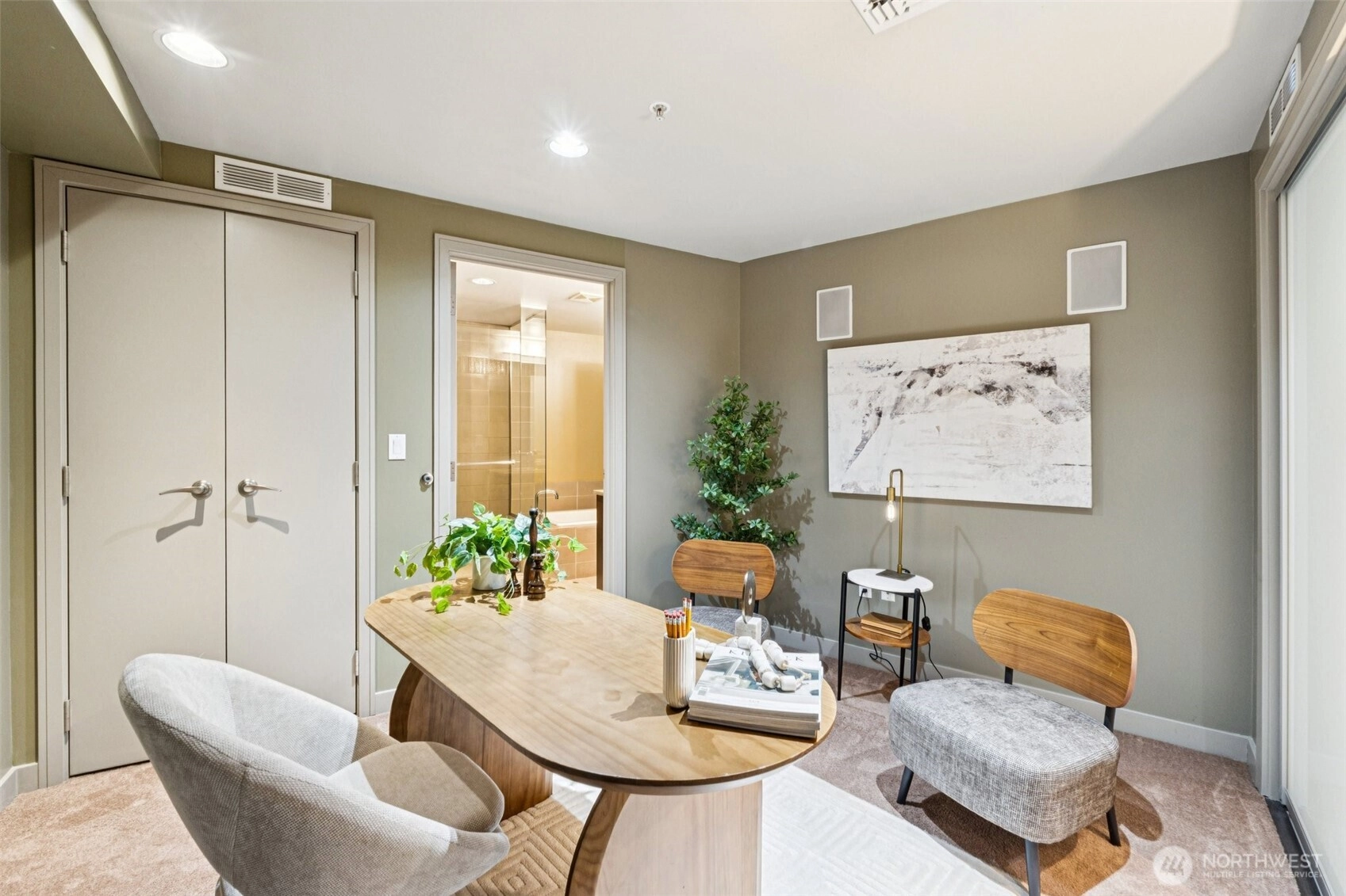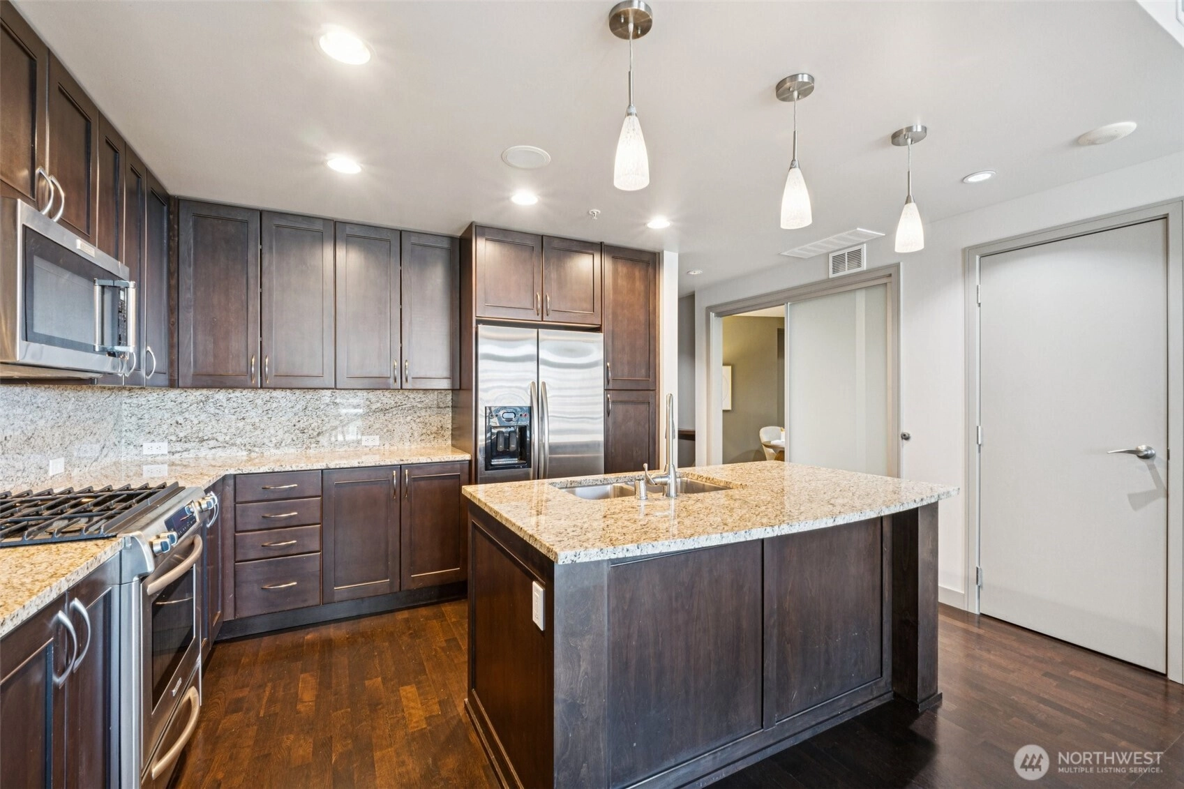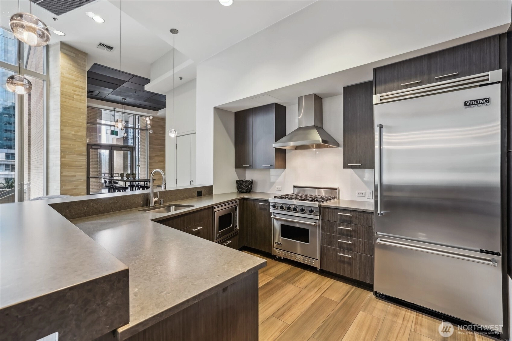 Live at the center of it all in this beautifully upgraded Downtown Bellevue residence, offering refined finishes & effortless urban comfort. A bright, open layout showcases quartz countertops & backsplash, refinished premium cabinetry & a quartz-appointed primary bath. Natural light fills the spacious living room & flows seamlessly to a sunlit patio. West facing unit has sunlight all day long! Automated shades & upgraded surround sound, while concrete & steel construction provide lasting quality. Enjoy dedicated parking, generous storage & building amenities including 24-hour concierge service, fully equipped gym, spa, locker rooms, and lounge. Perfectly positioned just moments from shopping, dining, Amazon, and the waterfront, this home delivers elevated city living at its finest. No pillars inside unit.