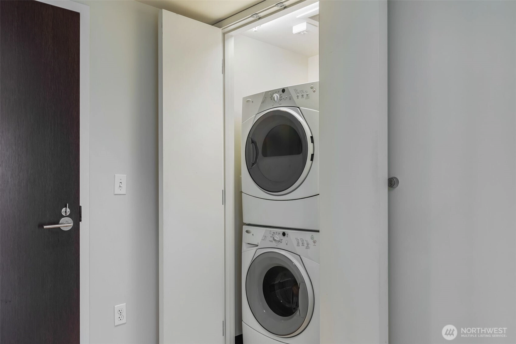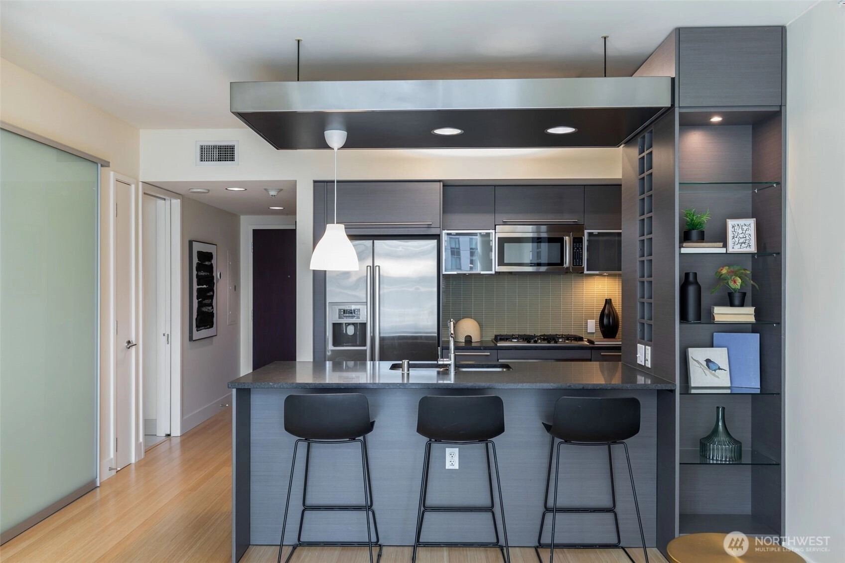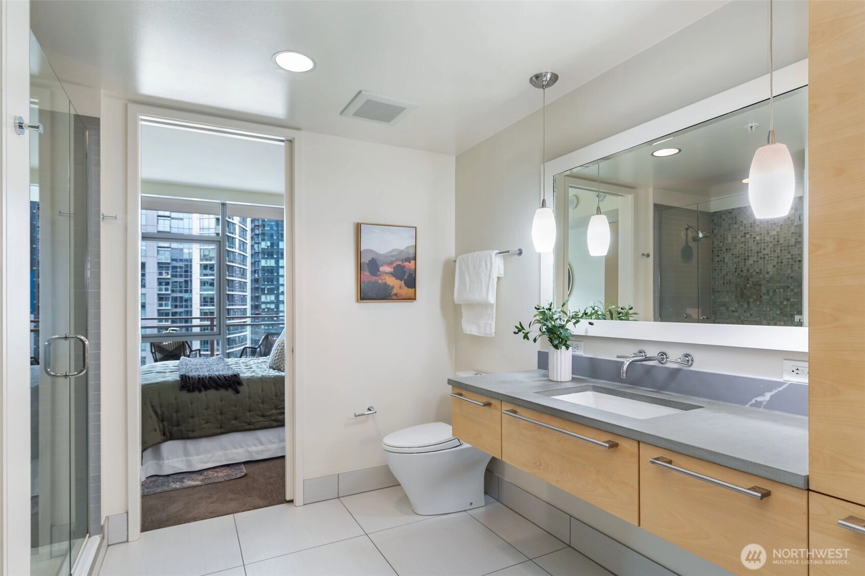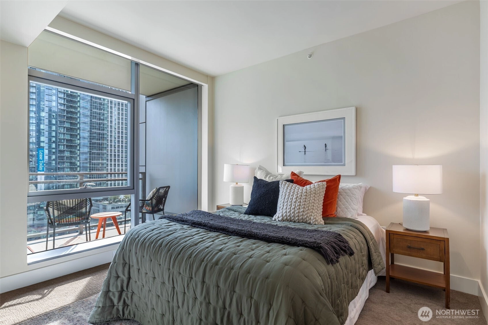Convenience, comfort, and quality define this light filled south-facing home at Enso in the heart of Denny Triangle. Floor-to-ceiling windows frame open city views and fill the home with natural light, while a private balcony offers the perfect place to relax above the vibrant streets below. High ceilings and an open layout create a bright, inviting feel, and a double-sided gas fireplace adds warmth and character between the living room and bedroom. The well-appointed kitchen anchors the space, ideal for everyday living and entertaining. Includes secured garage parking and private storage. This LEED Gold-certified concrete and steel building offers concierge service, fitness center, owner’s lounge, and guest suite, all just steps from Whole Foods, dining, shopping, and transit.