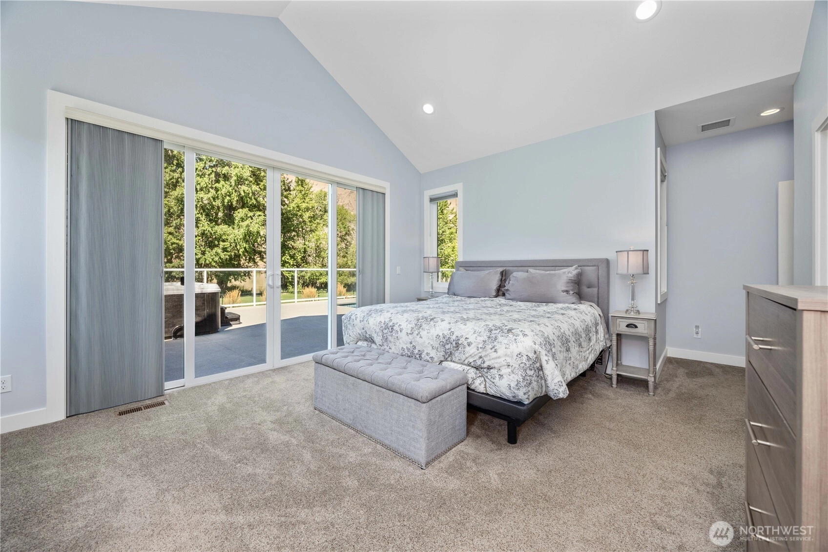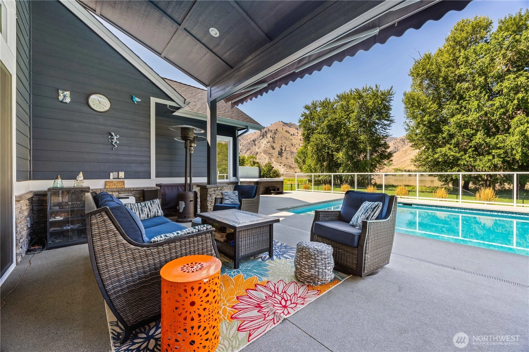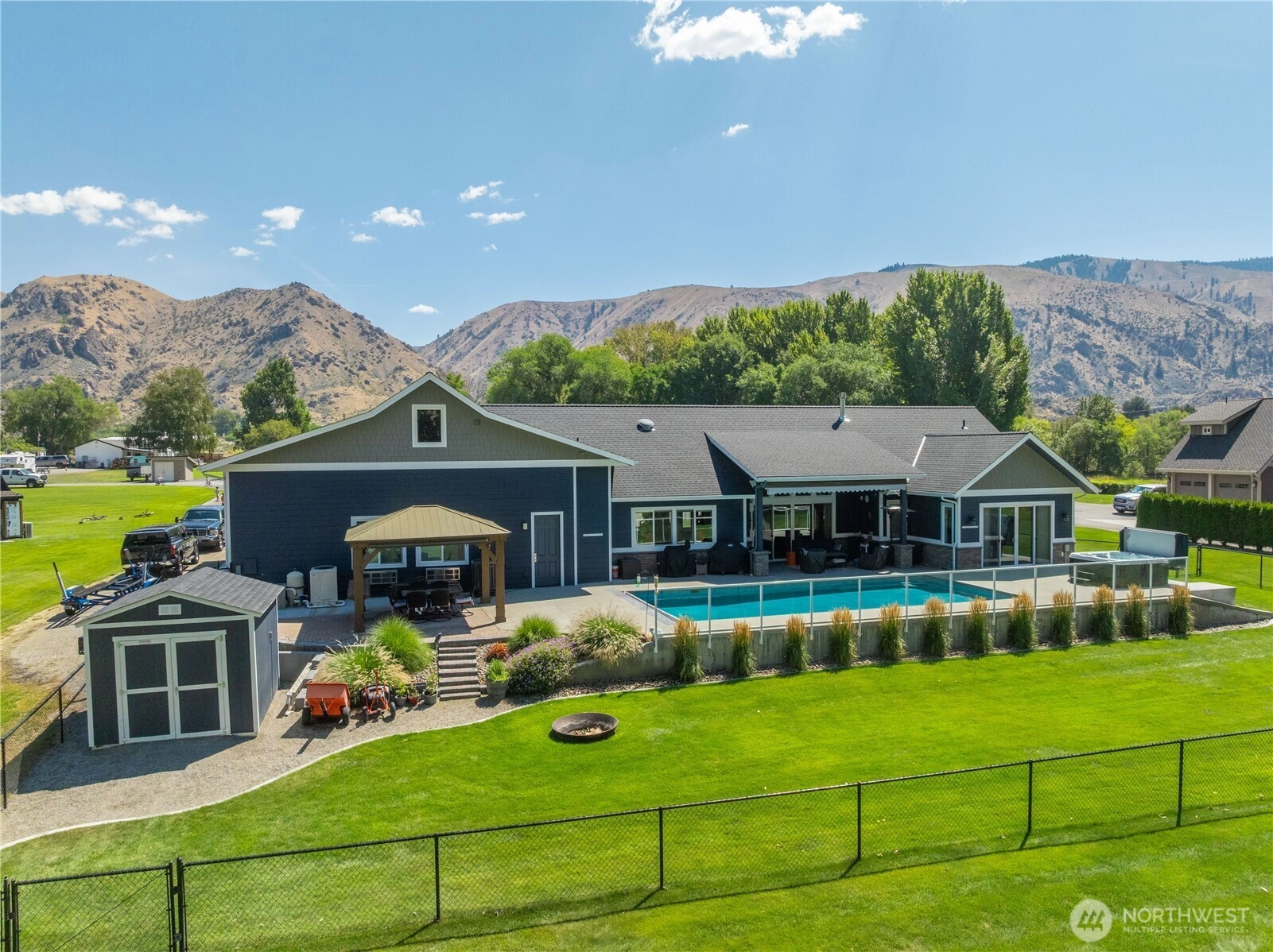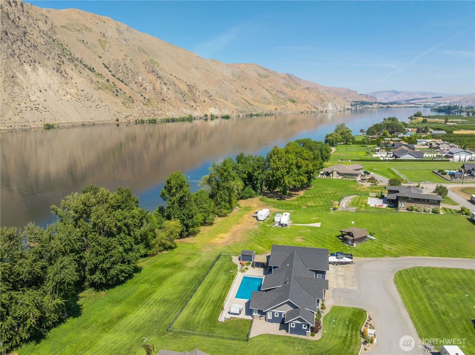 Discover this lovely unique custom-built 4 bedroom 2 ½ bath home that sits on a full acre with a 140’ of no bank waterfront. This one level home was finished in 2018 and has exquisite architecture. Inside you’ll find 12-ft-vaulted ceilings, beautiful LVP flooring, Hunter Douglas blinds with black out blinds in the bedrooms, and lifetime Milgard windows. Enjoy the view of the river, hills and soaring eagles through the sliding doors from the open concept great room, which also has a gas fireplace. The Chef’s kitchen is a dream with Thermador appliances – double ovens, 6-burner gas cooktop, custom built cabinets, granite countertops, a large center island with prep sink and a built in KitchenAid cabinet lift. The primary suite has a walk-in shower, heated floors and sliding doors leading to the patio where you’ll find a hot tub and beautiful 18’ x 36’ gunite swimming pool with a brand-new auto cover. Included on the patio deck is an extendable awning for shade and cabana for entertaining. Don’t miss the 1840 sq foot heated and cooled shop/garage with special features that include 18’w x 12’h doors, a car lift, air compressor, epoxy floors and 46’ x 10’ overhead storage. A detached large garden shed also sits on the property. The fully irrigated grassy yard leads to the water’s edge, and just a short walk from there, you’ll find the community dock which includes a spot for each owner.