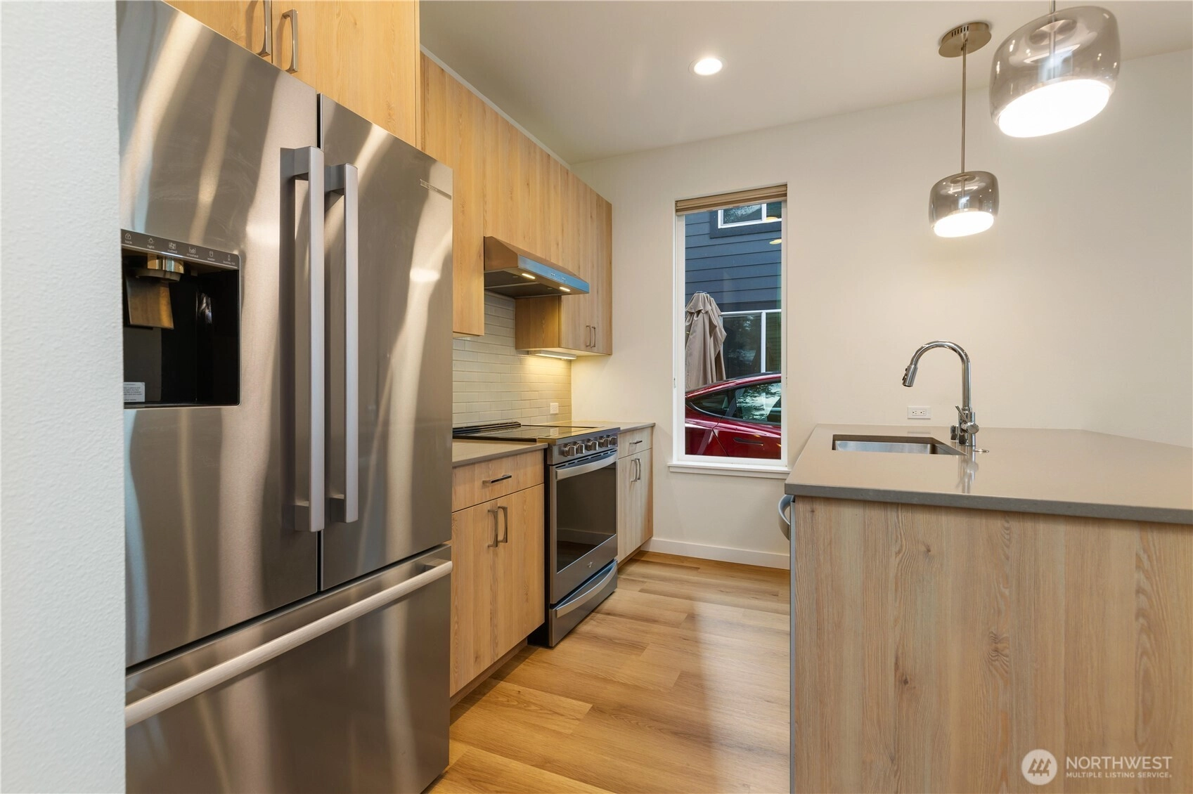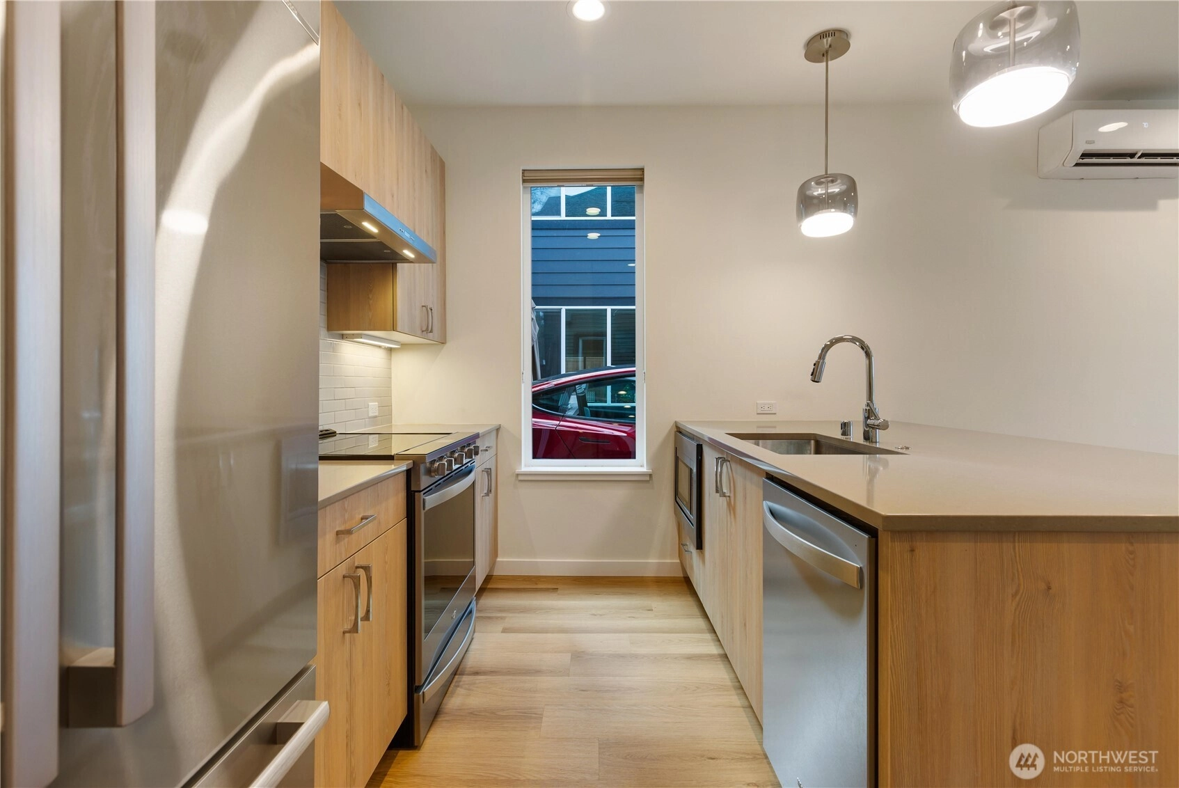 Welcome to this almost new Broadview condo. Location is everything. This 2 bedroom lives much larger than the appearance. With the open concept of the lower level, making it great to visit with company while in the kitchen. State of the art appliances throughout make for all the comforts and low energy usage. Stackable washer and dryer stay with the home. All flooring has very little traffic. Unit has one parking space with additional street parking on a low traffic road. Backyard has plenty of room for your BBQ grills, bikes & a little outdoor bistro set up.