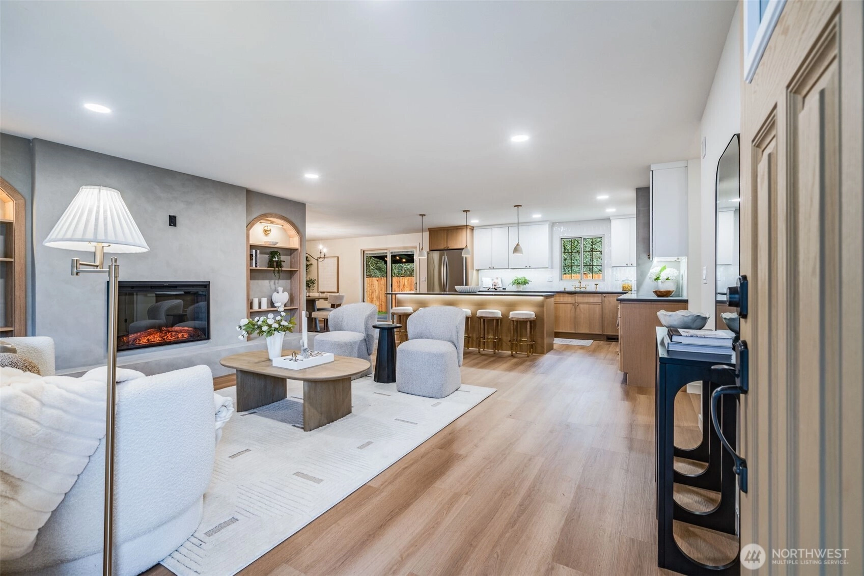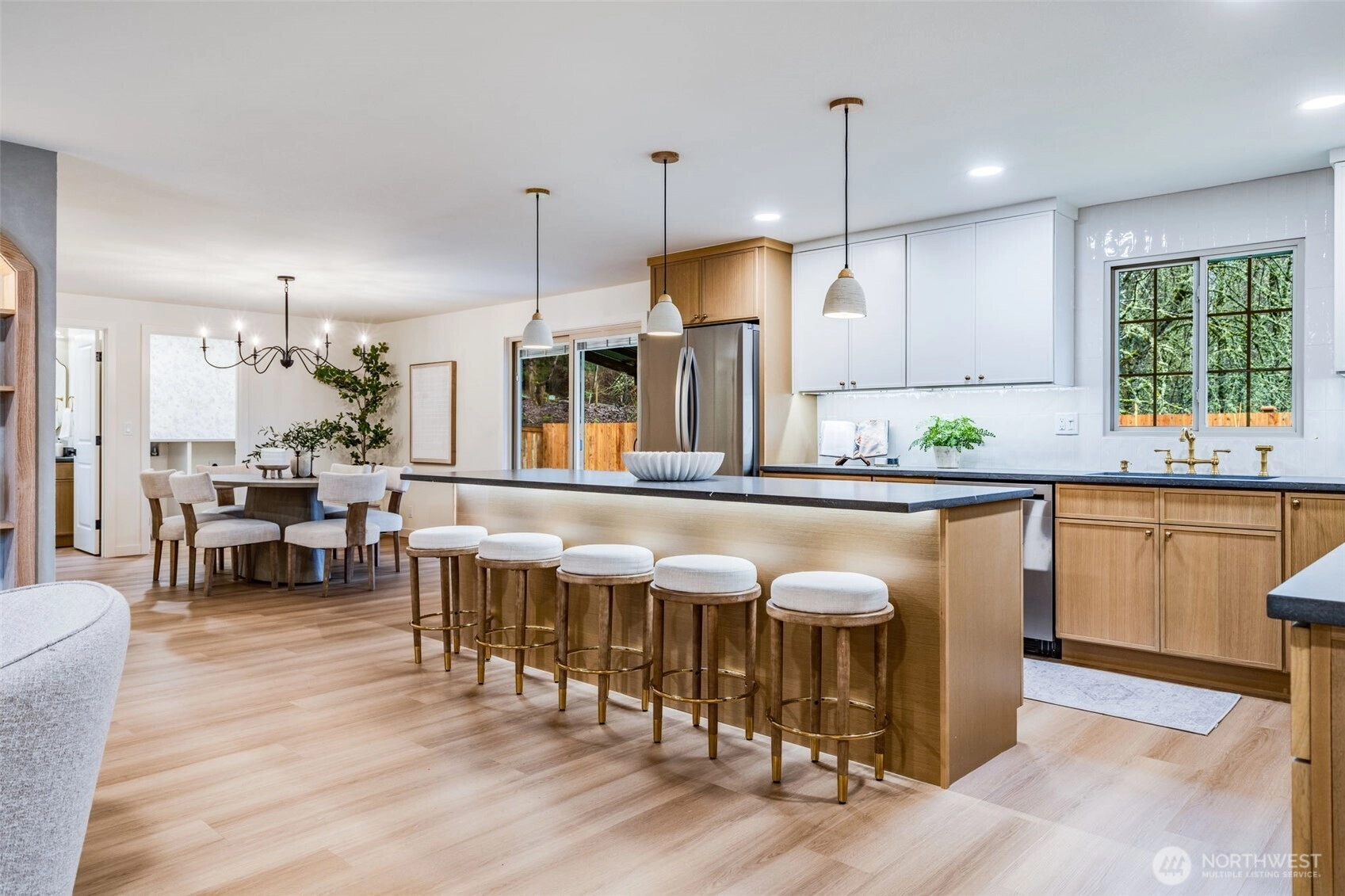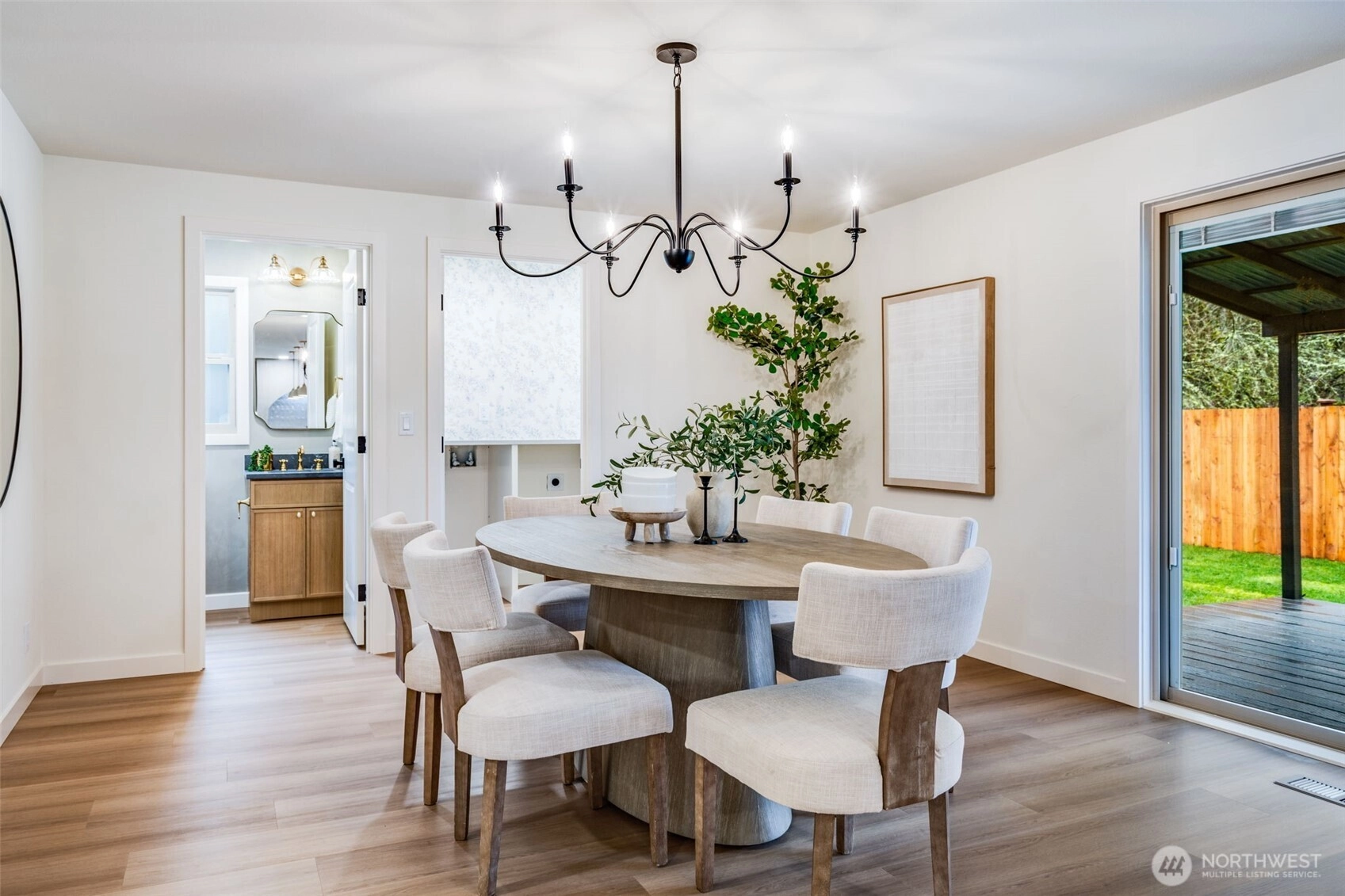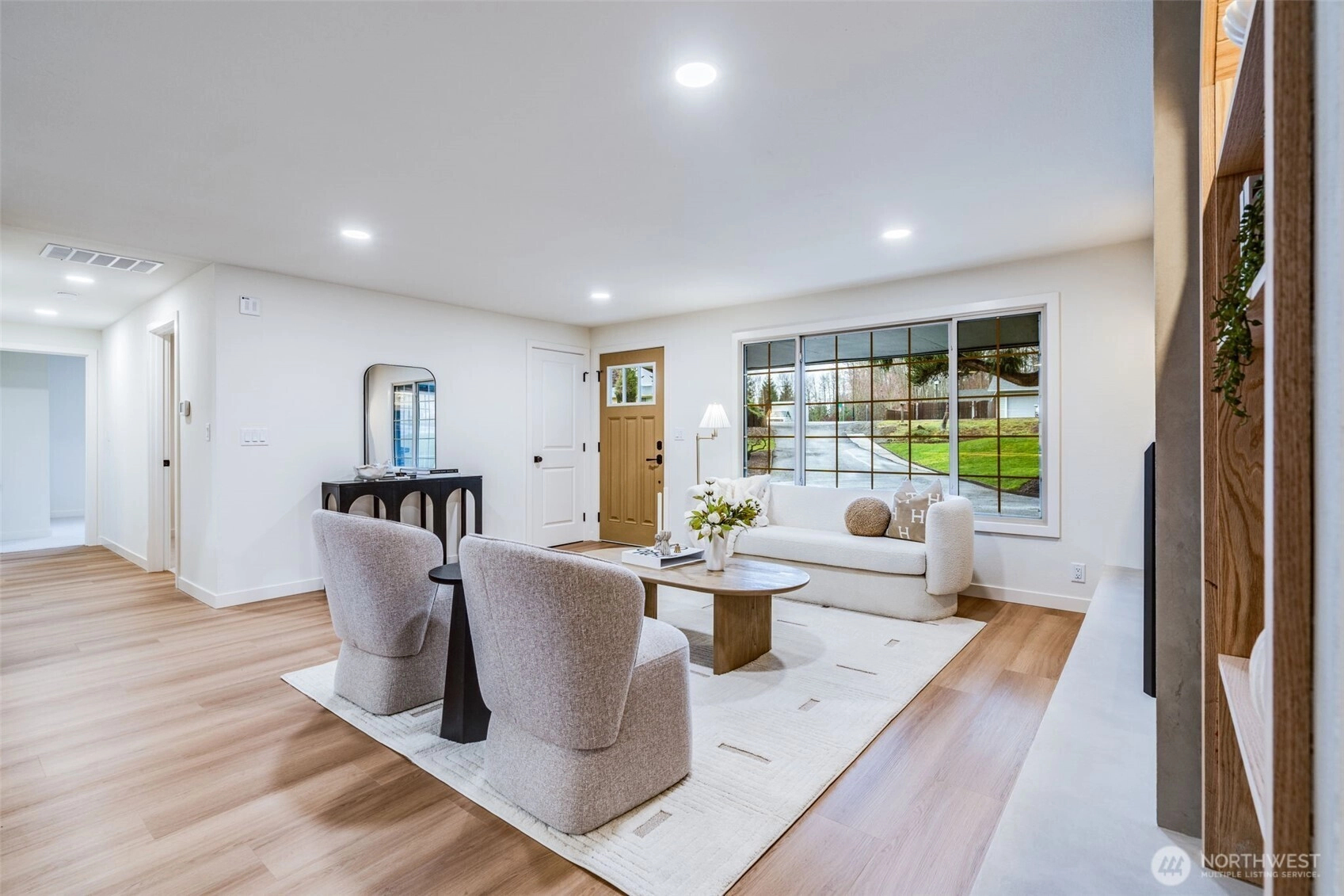 Featuring a newly renovated mid-century, one story home presents timeless architecture and is refined for modern living. Clean lines honor the home’s original design, while elevated, meticulous finishes bring a fresh sense of sophistication. The fully modernized home offers 4 bdrm/2.5 bath extending 1868 square feet precisely designed while perfectly situated on .29 acre. Enter the front door to a welcoming living room presenting a gas fireplace, custom built-in shelving and an open concept to a sizable, entertaining kitchen. The beautifully designed kitchen offers two-toned cabinetry, stainless steel appliances, large sink with polished brass fixtures and gorgeous countertops. The expansive kitchen island provides an eating space with an additional designated dining area. The impressive primary suite with walk-in closet, boasts a full bathroom offering serenity with a stand alone soaking tub and a dual rainshower conceived as an open, immersive experience designed with precision and functionality. Designated laundry room, large walk in pantry and mudroom entrance directly off 2 car garage. Partially fenced backyard with covered and uncovered deck areas, along with a hot tub for evening relaxing. Home ideally setback from the street with plenty of driveway parking, surrounding landscaping and newly laid sod. Conveniently located with easy I-5 access, short distance to shopping and community offerings. This stunning home will not last long!