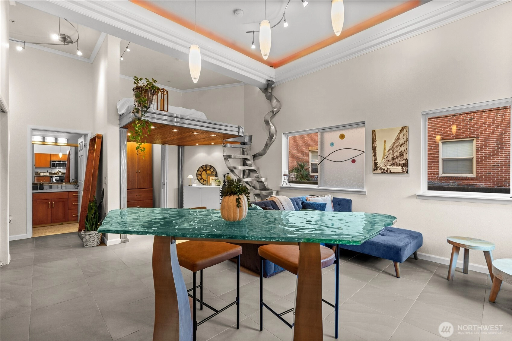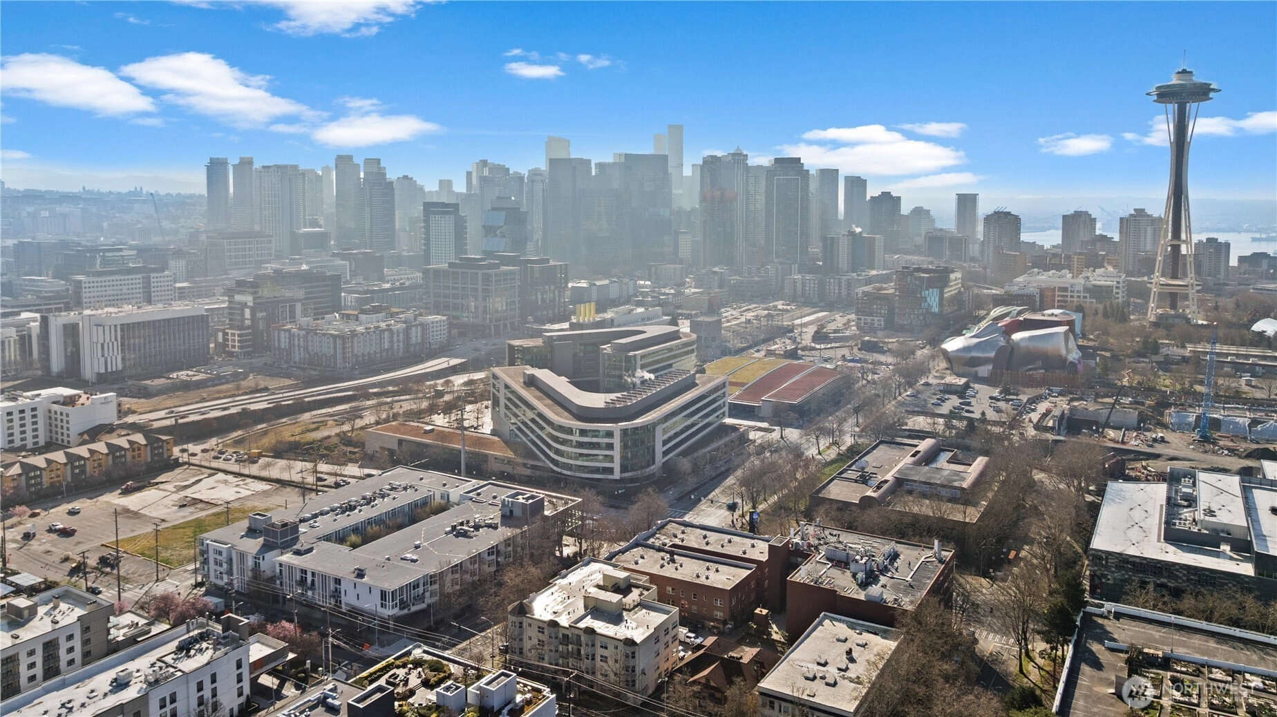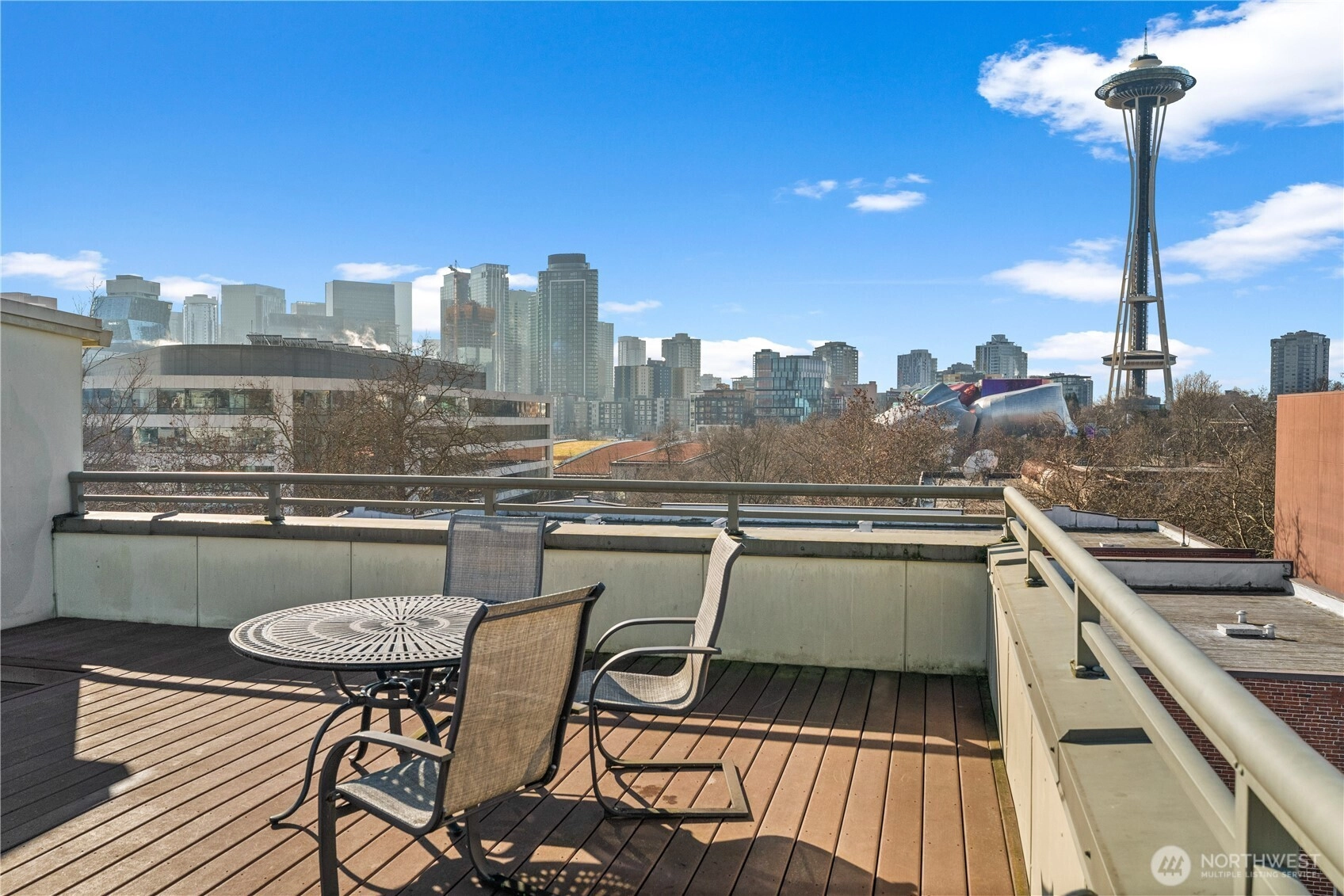 Distinctive techloft in prime Lower Queen Anne with direct Space Needle views and walking distance to Climate Pledge Arena and Seattle Center. Fourteen foot soaring ceilings create volume and presence. Custom glass lighting and fixtures, handcrafted steel kitchen island, updated bath, custom staircase, and tailored window coverings reflect thoughtful design throughout. Light filled living area flows seamlessly into the kitchen, efficient layout, and generous storage. In unit washer and dryer. Rooftop deck showcases sweeping city and Space Needle views. Secure garage parking and dedicated storage included. Surrounded by restaurants, coffee shops, grocery, and daily conveniences, offering true walkable urban living in one of Seattle’s most connected neighborhoods.