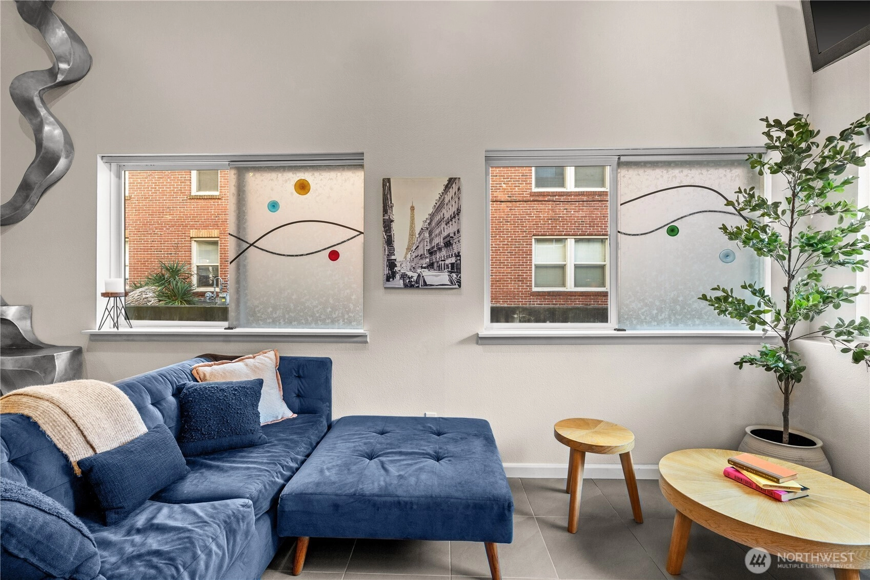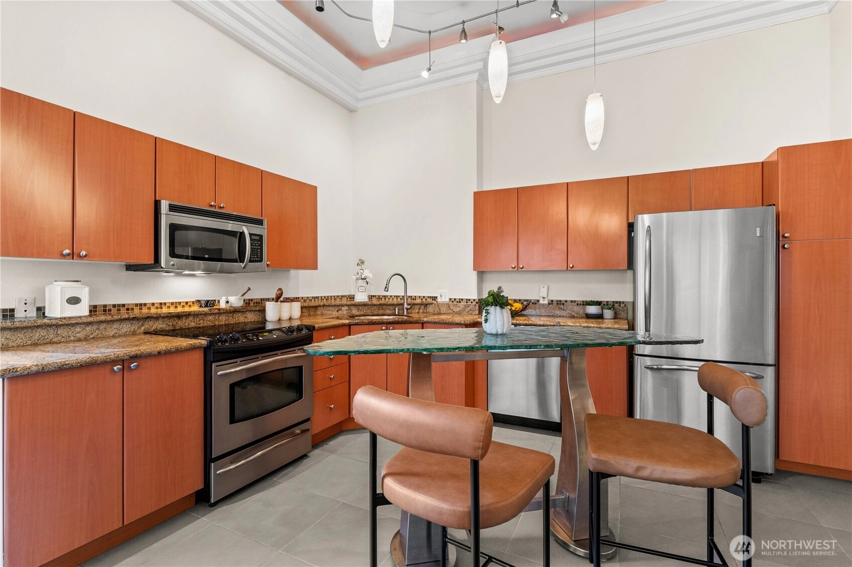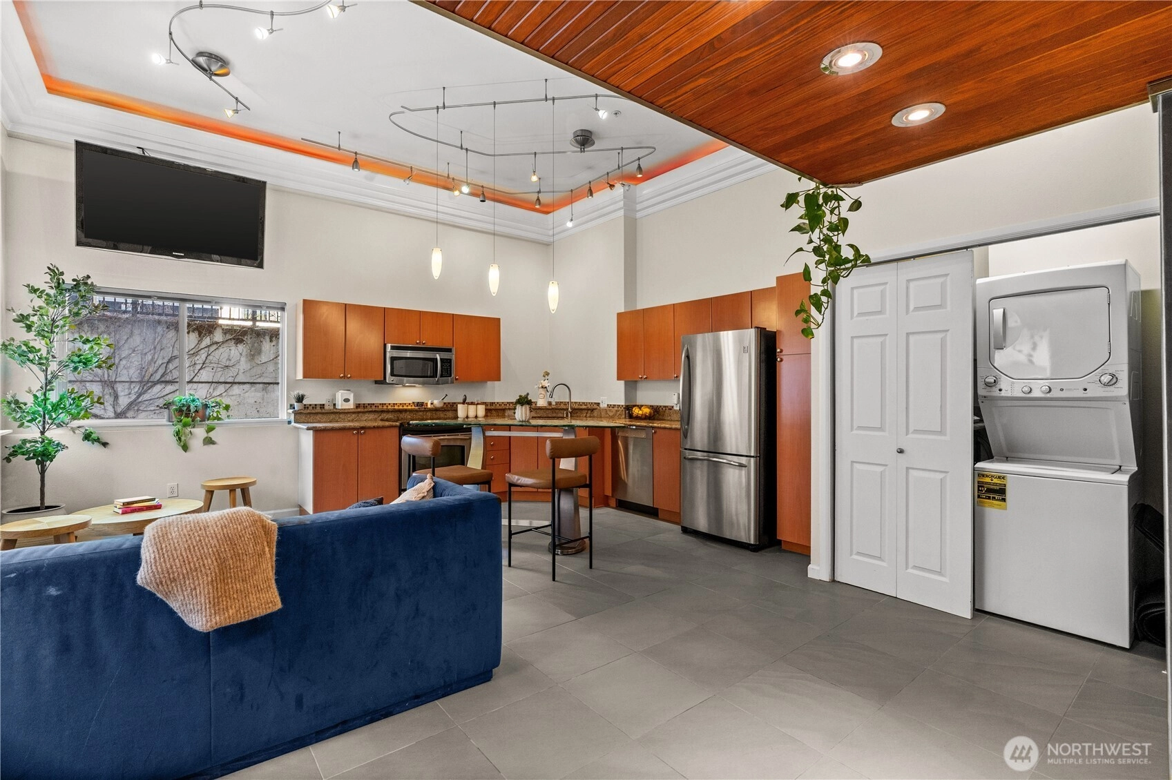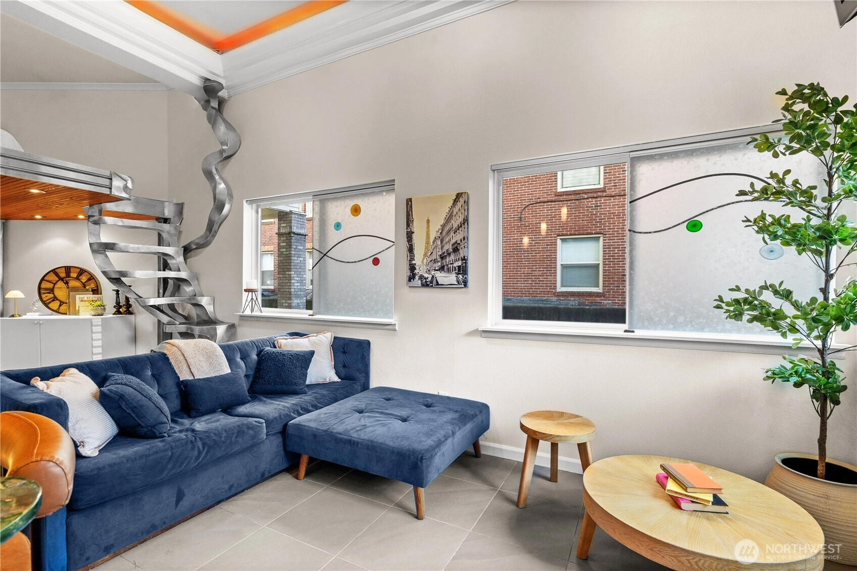 Distinctive techloft in prime Lower Queen Anne with direct Space Needle views and walking distance to Climate Pledge Arena and Seattle Center. Fourteen foot soaring ceilings create volume and presence. Custom glass lighting and fixtures, handcrafted steel kitchen island, updated bath, custom staircase, and tailored window coverings reflect thoughtful design throughout. Light filled living area flows seamlessly into the kitchen, efficient layout, and generous storage. In unit washer and dryer. Rooftop deck showcases sweeping city and Space Needle views. Secure garage parking and dedicated storage included. Surrounded by restaurants, coffee shops, grocery, and daily conveniences, offering true walkable urban living in one of Seattle’s most connected neighborhoods.