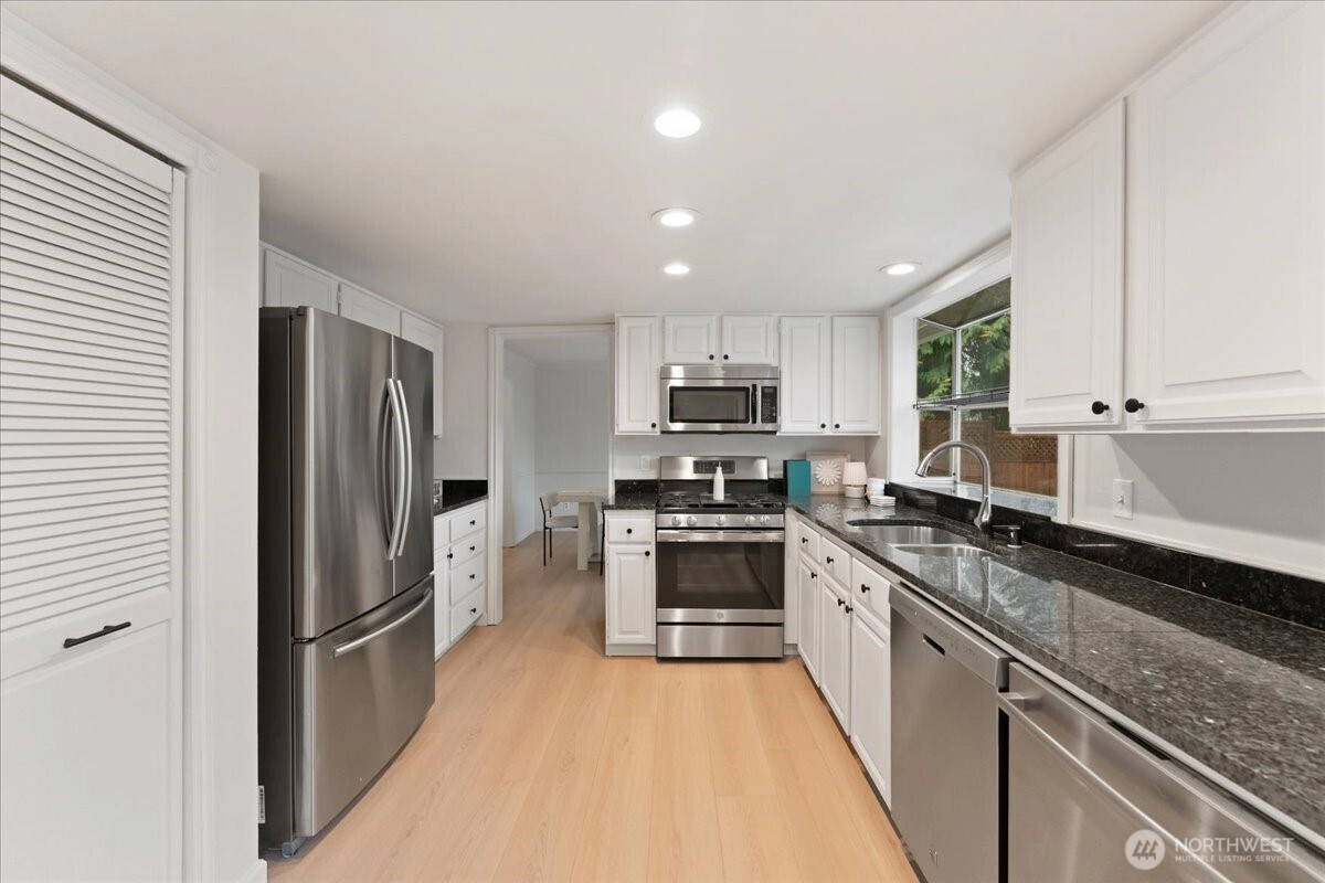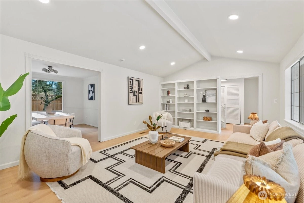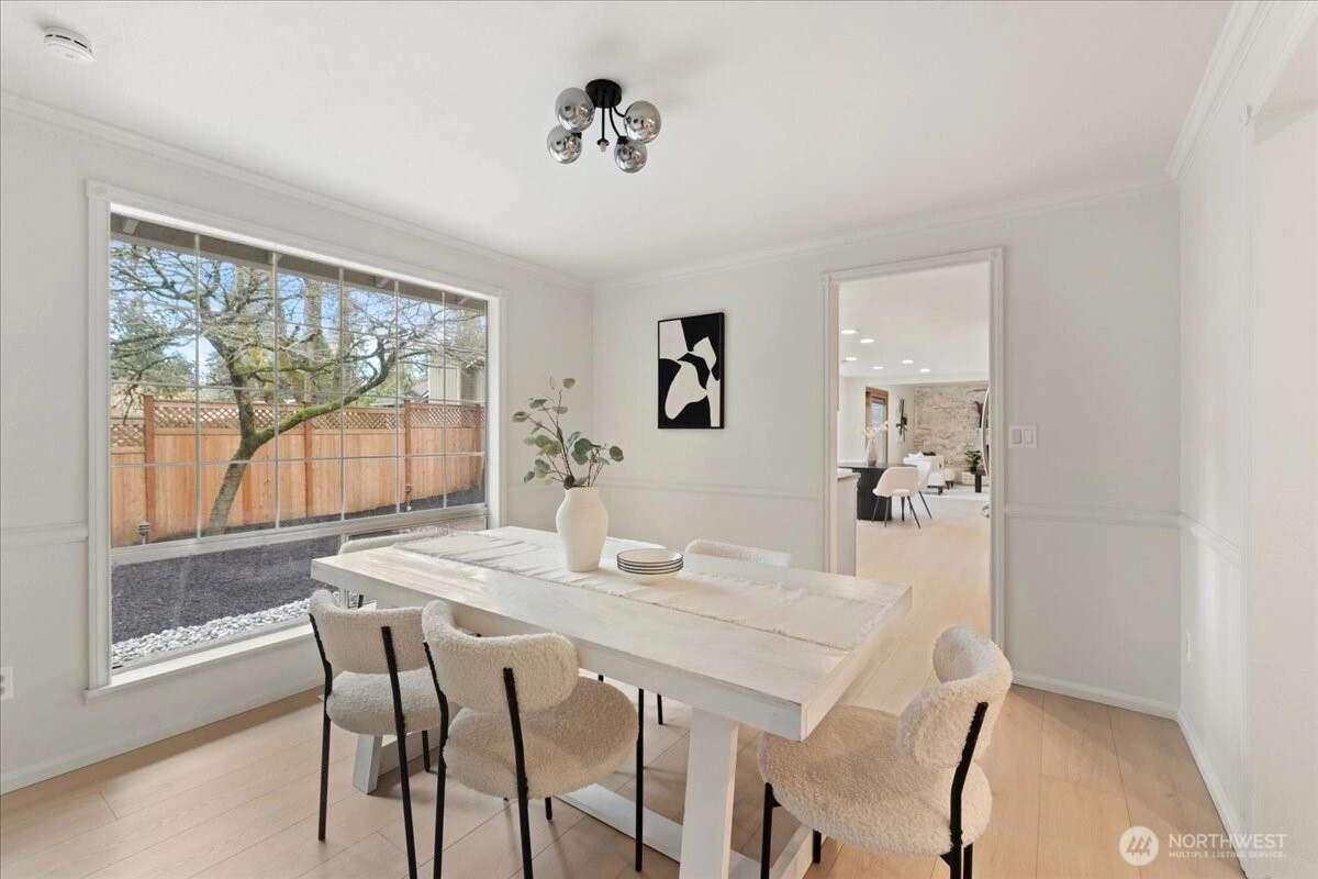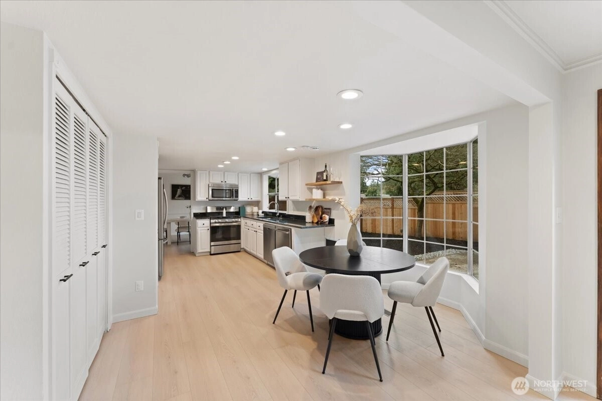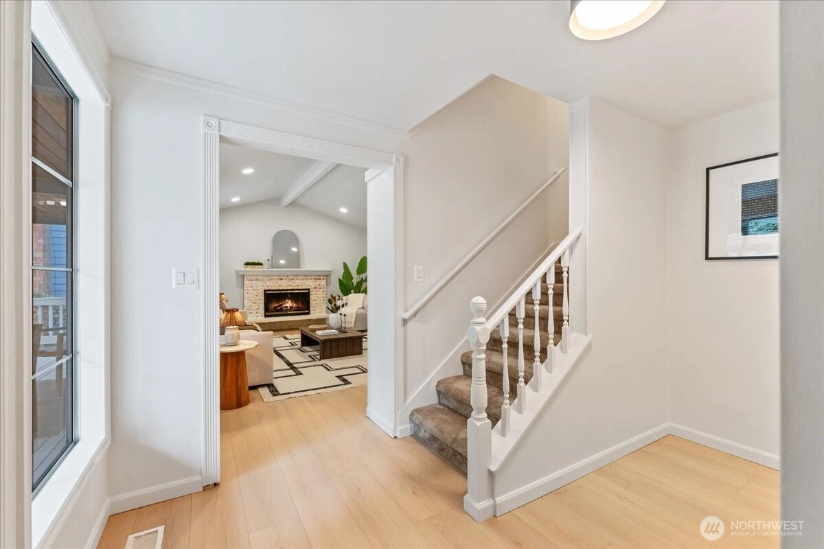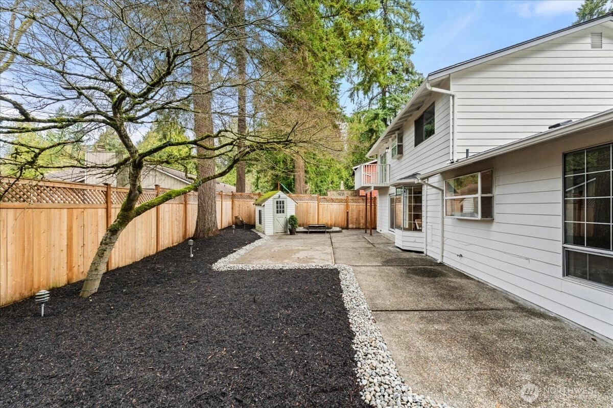 Welcome to this beautiful two-story home in highly sought-after North Juanita, Kirkland. This spacious freshly remodeled home offers a highly desirable floor plan with bright living spaces and great flow for everyday living and entertaining. A charming covered front porch welcomes you into the main level featuring vaulted ceilings, a generous living room with custom library shelving, formal dining area, and an open-concept kitchen with breakfast nook and stainless-steel appliances, double dishwasher. Upstairs, the primary suite offers a fully remodeled bathroom and private deck access, creating a peaceful retreat. Three additional spacious bedrooms and a full bath complete the upper level. Extra large laundry room with lots of cabinets and storage. Enjoy two cozy wood-burning fireplaces, a fully fenced backyard, large patio perfect for gatherings. Excellent location just minutes to I-405, parks, shopping, restaurants, and award-winning Lake Washington School District.